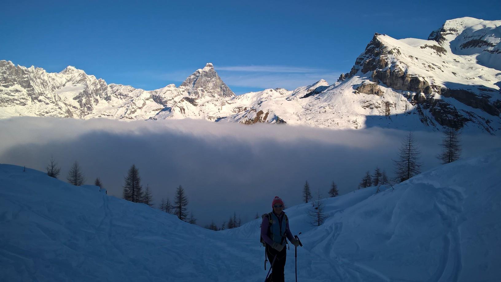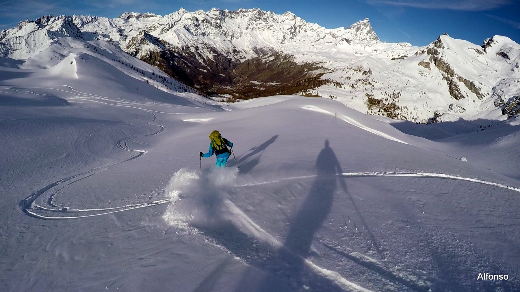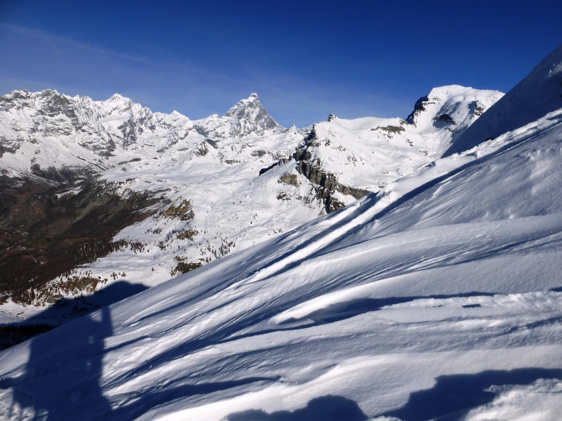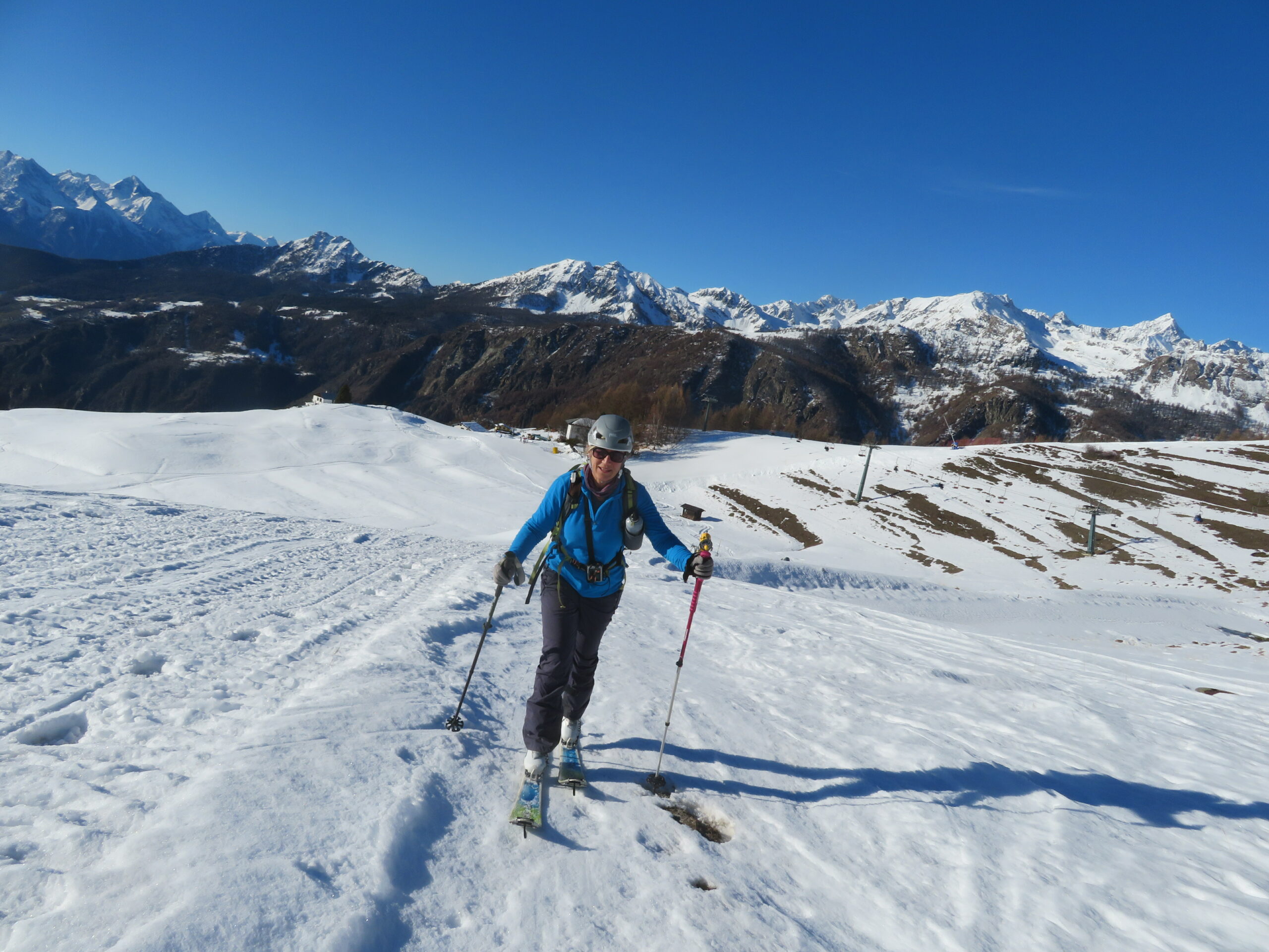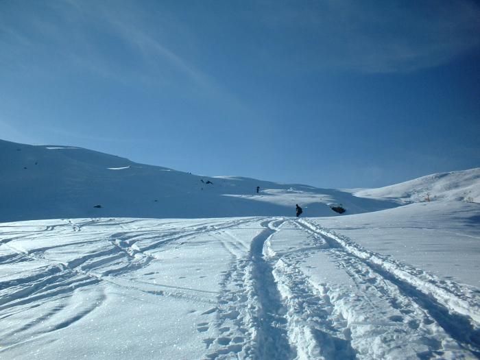 La discesa avviene per la via di salita con numerose possibilità di varianti dal Colle di Fontana Fredda fino a Cheneil.