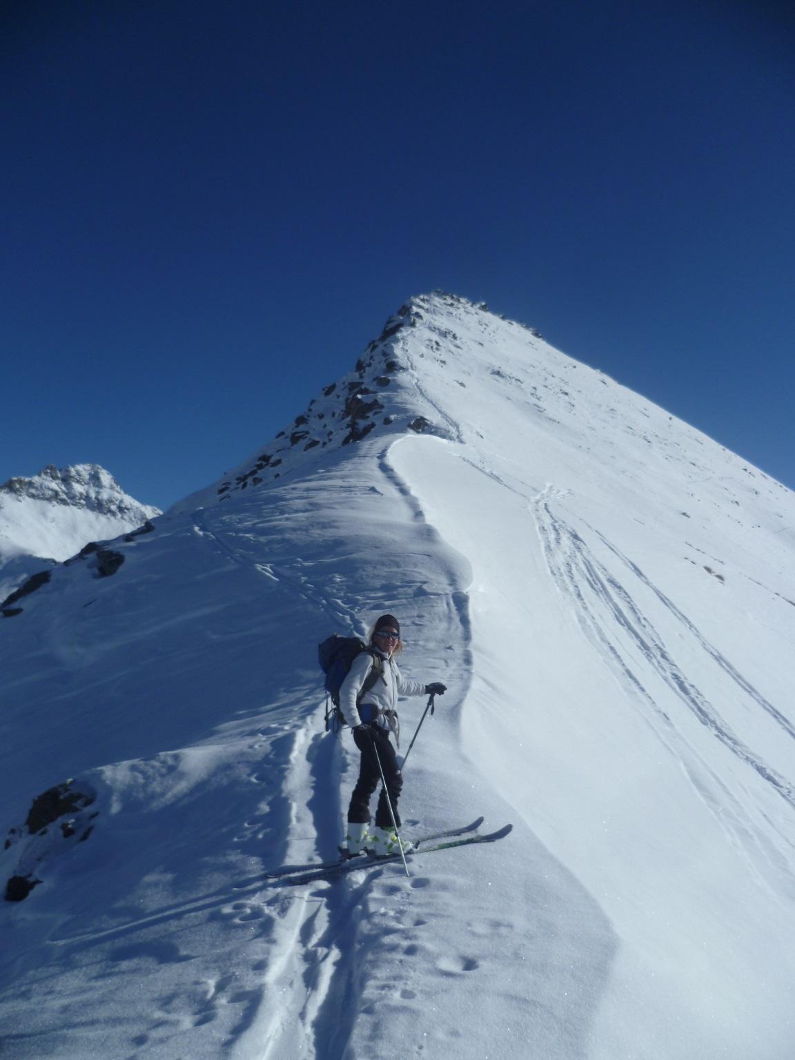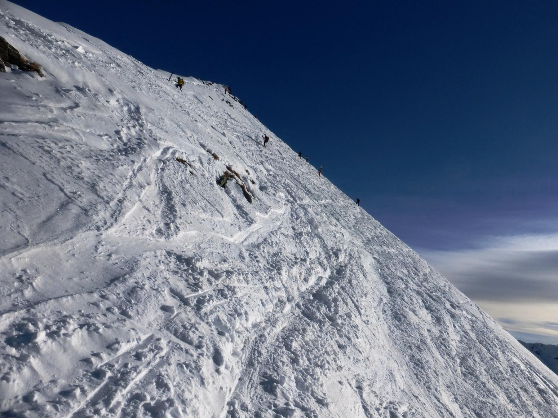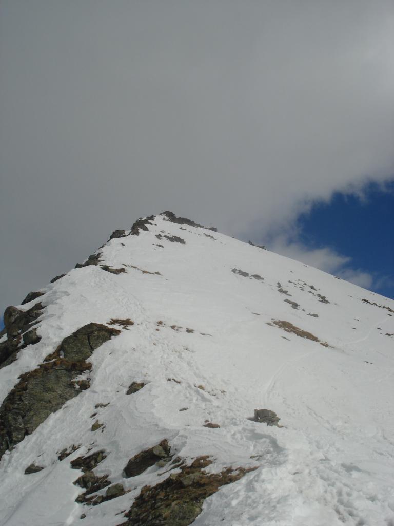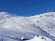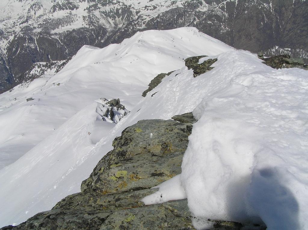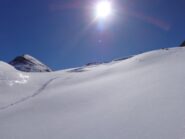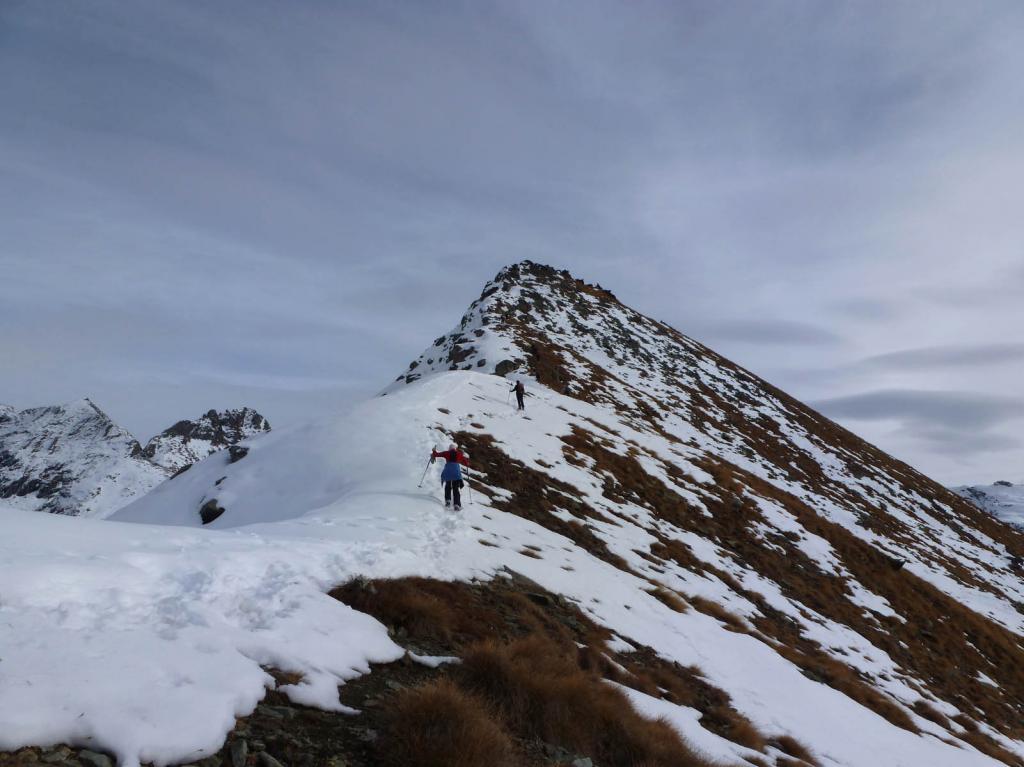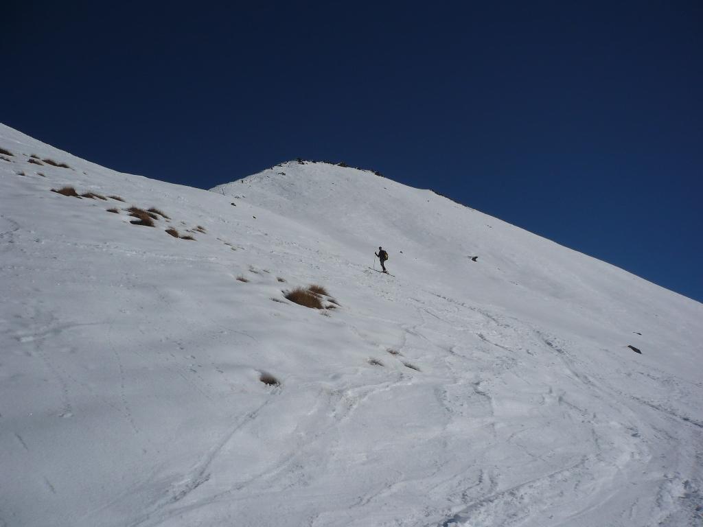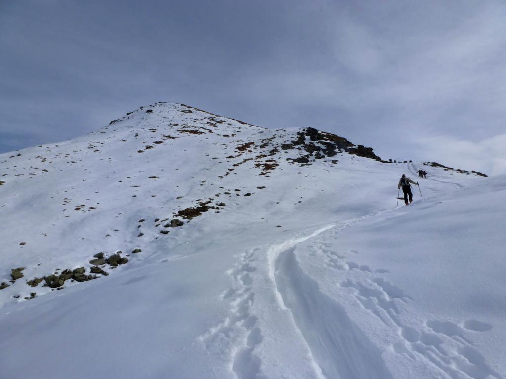 Dal colle ci si dirige a sx e si rimonta il ripido pendio sotto a quota 2680 che si supera uscendone a dx. Ci si dirige quindi verso la cresta proseguendo sempre su pendenze sostenute. Qui giunti (si possono lasciare gli sci) si prosegue lungo la cresta di erba e rocce rotte fino alla croce della Pointe Falinére (2763).