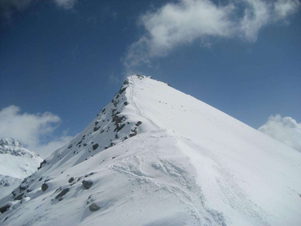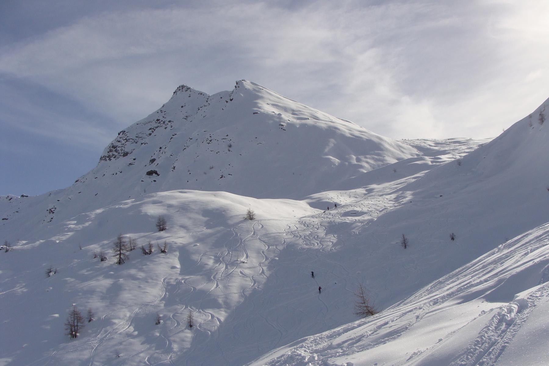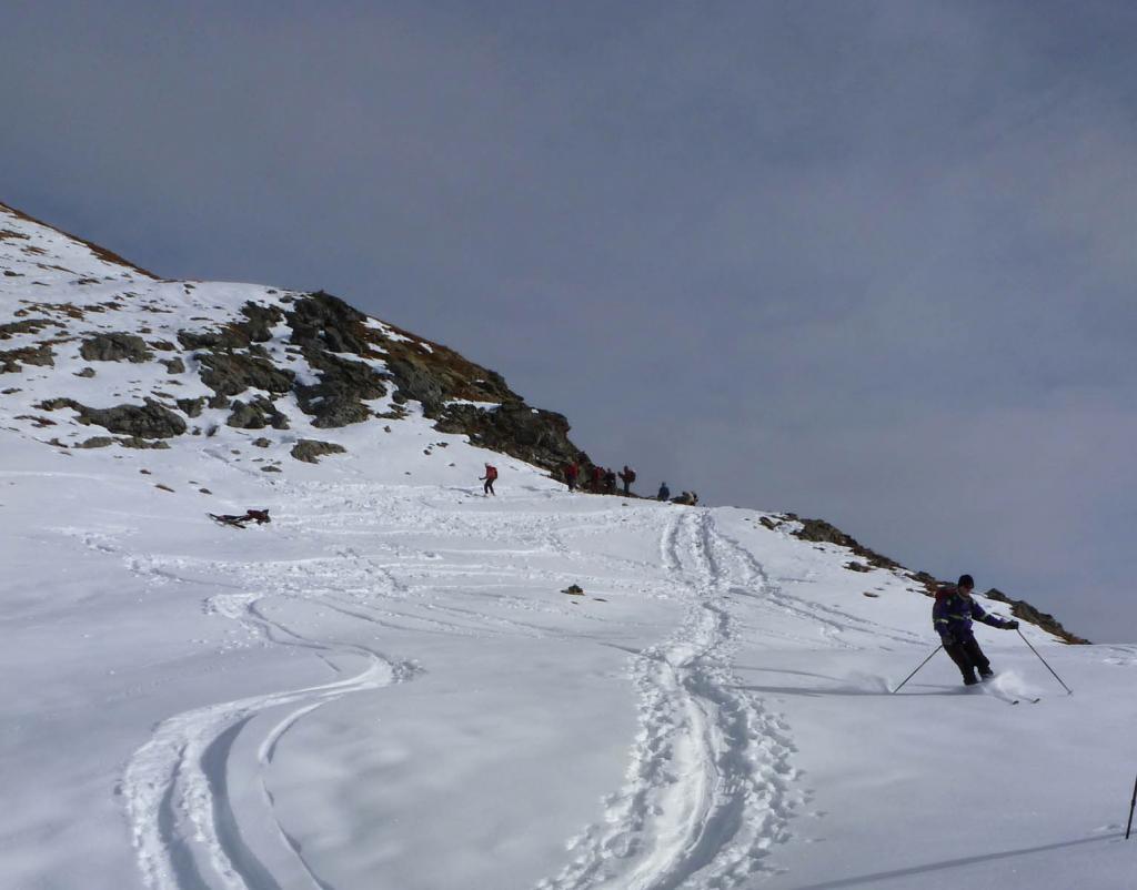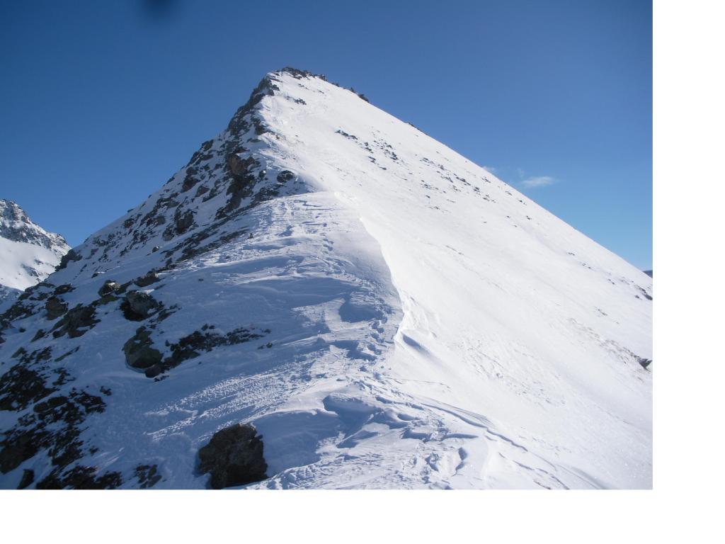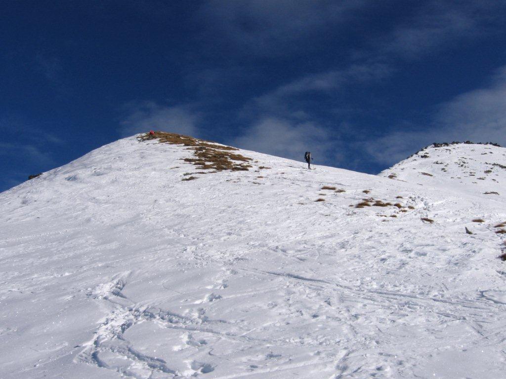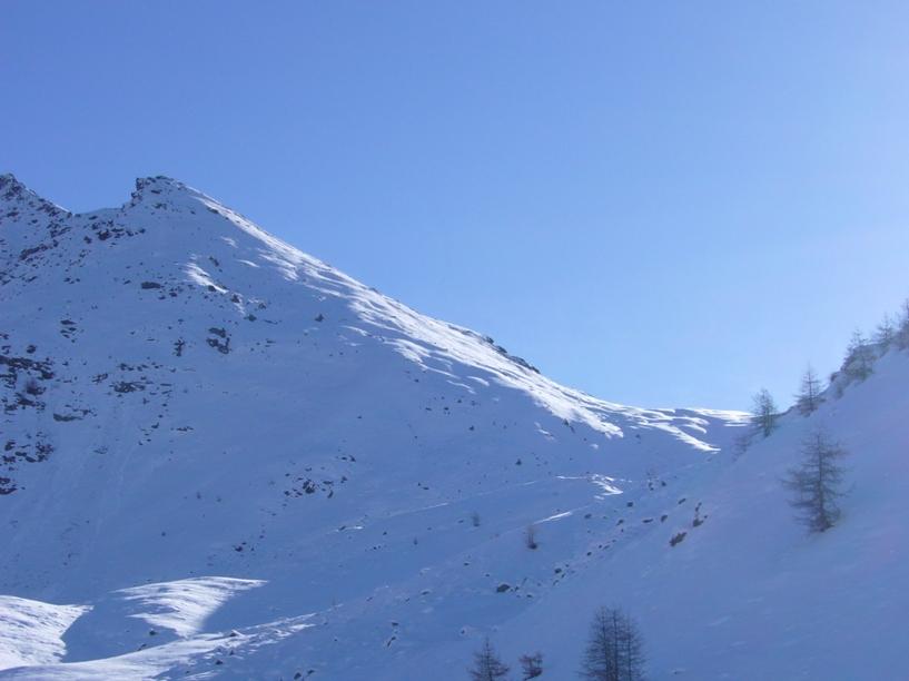Dal colle ci si dirige a sx e si rimonta il ripido pendio sotto a quota 2680 che si supera uscendone a dx. Ci si dirige quindi verso la cresta proseguendo sempre su pendenze sostenute. Qui giunti (si possono lasciare gli sci) si prosegue lungo la cresta di erba e rocce rotte fino alla croce della Pointe Falinére (2763).