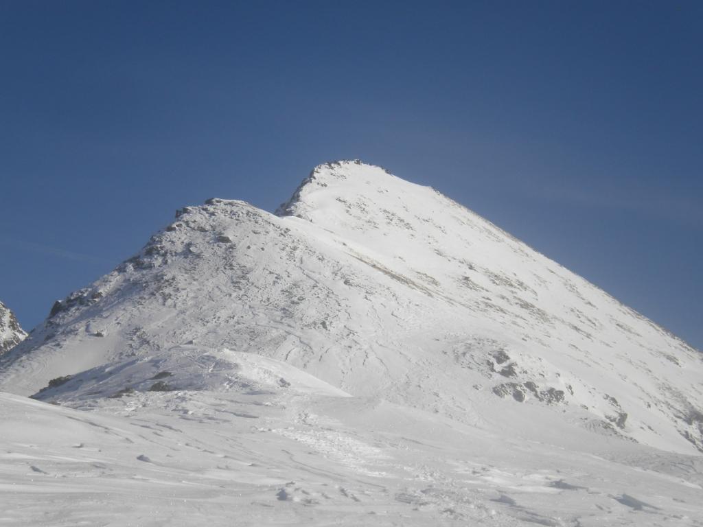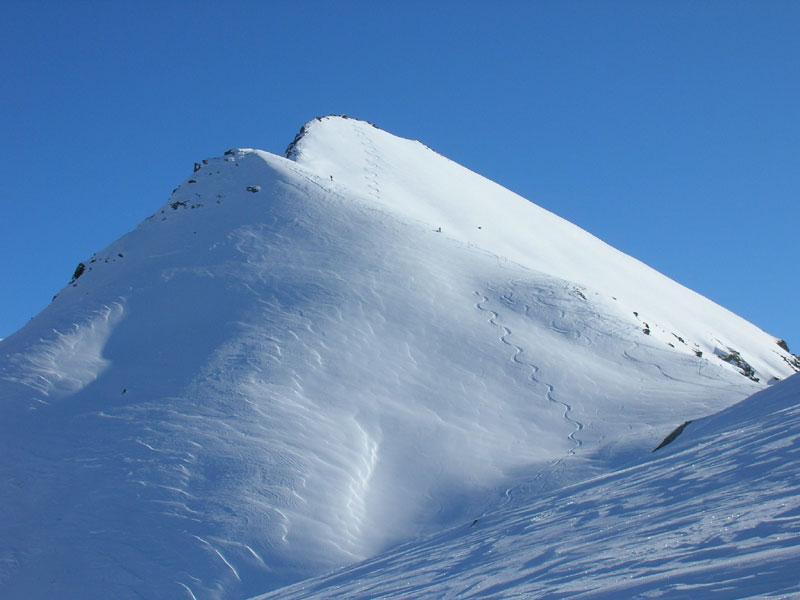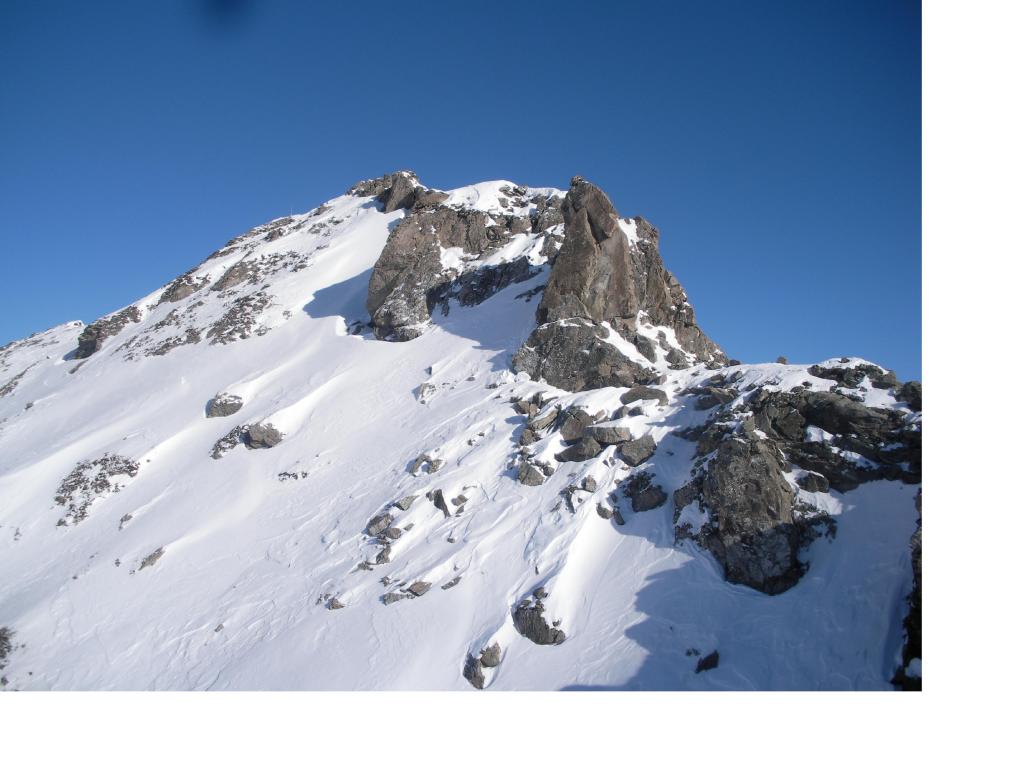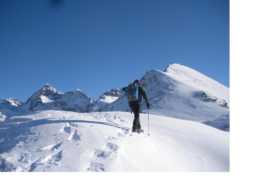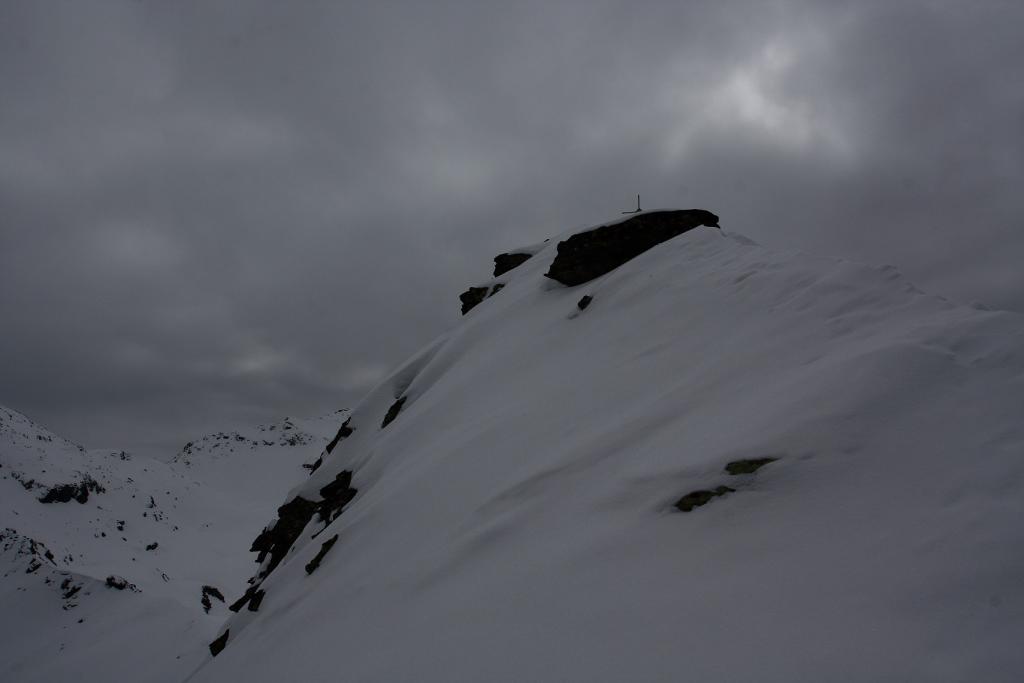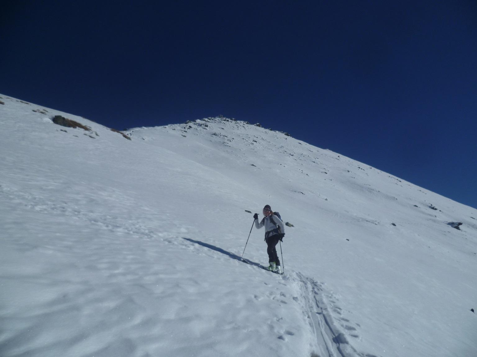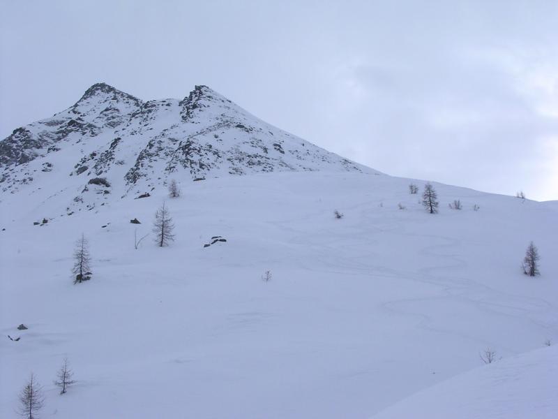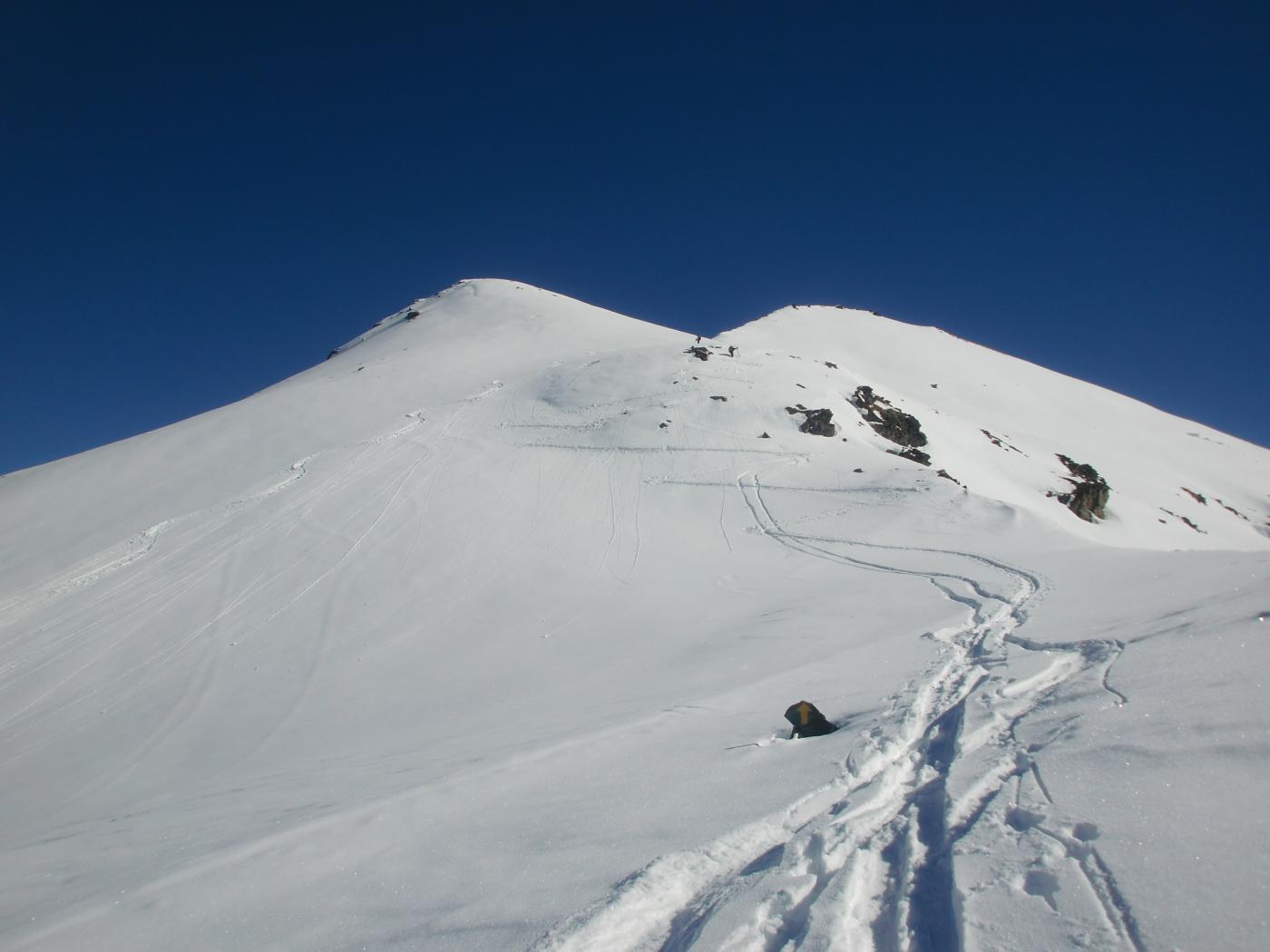 Dal colle ci si dirige a sx e si rimonta il ripido pendio sotto a quota 2680 che si supera uscendone a dx. Ci si dirige quindi verso la cresta proseguendo sempre su pendenze sostenute. Qui giunti (si possono lasciare gli sci) si prosegue lungo la cresta di erba e rocce rotte fino alla croce della Pointe Falinére (2763).