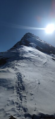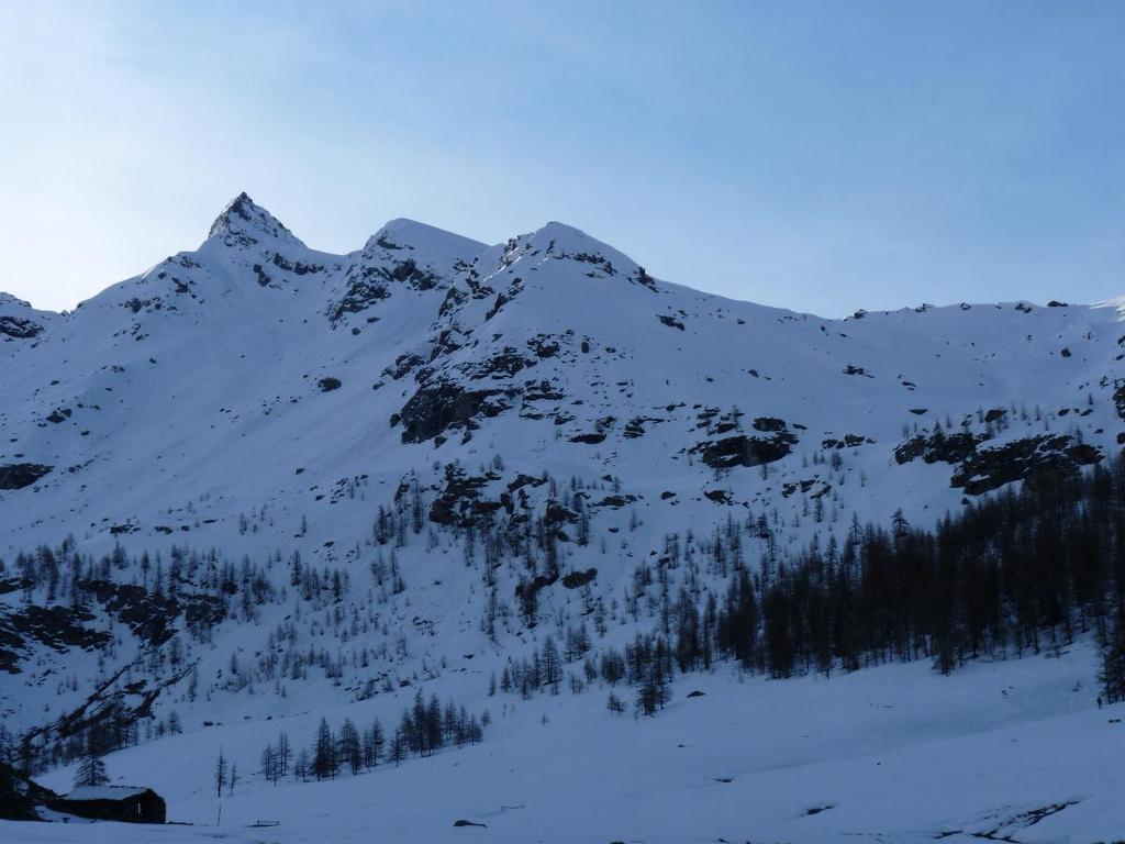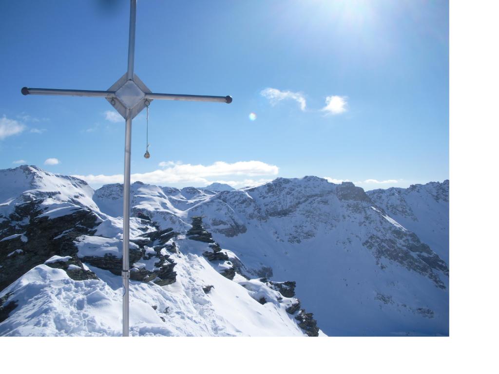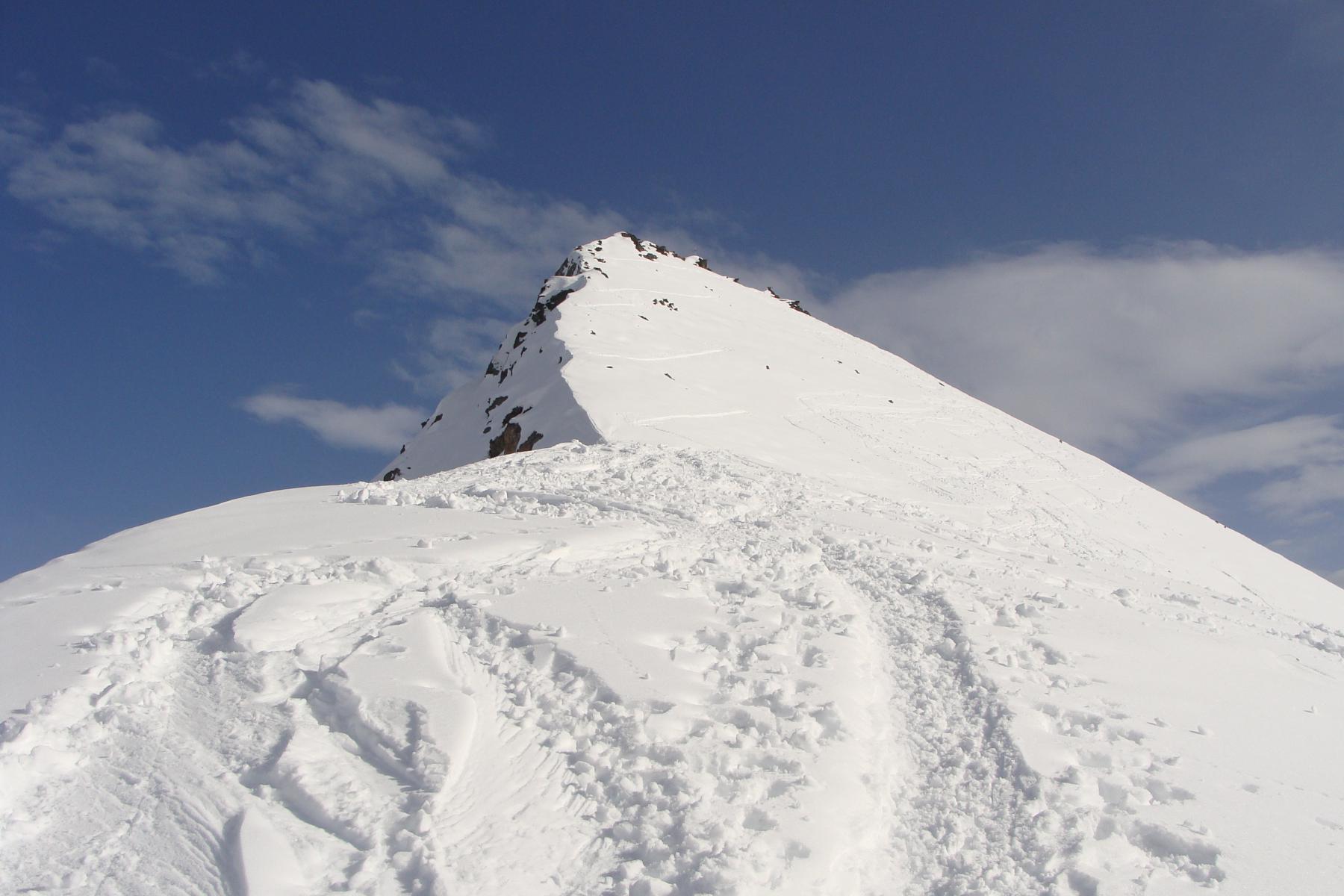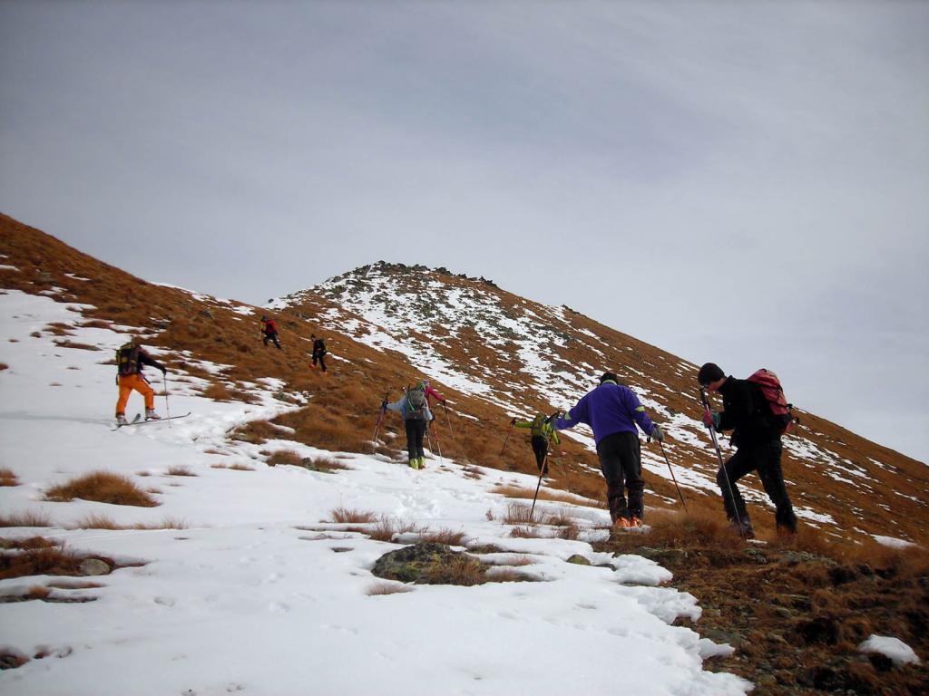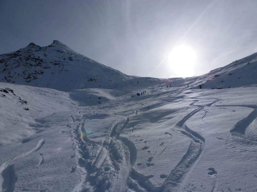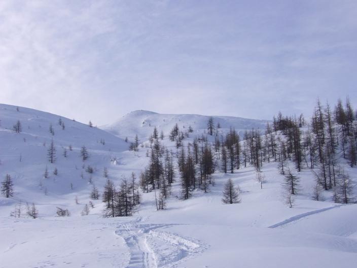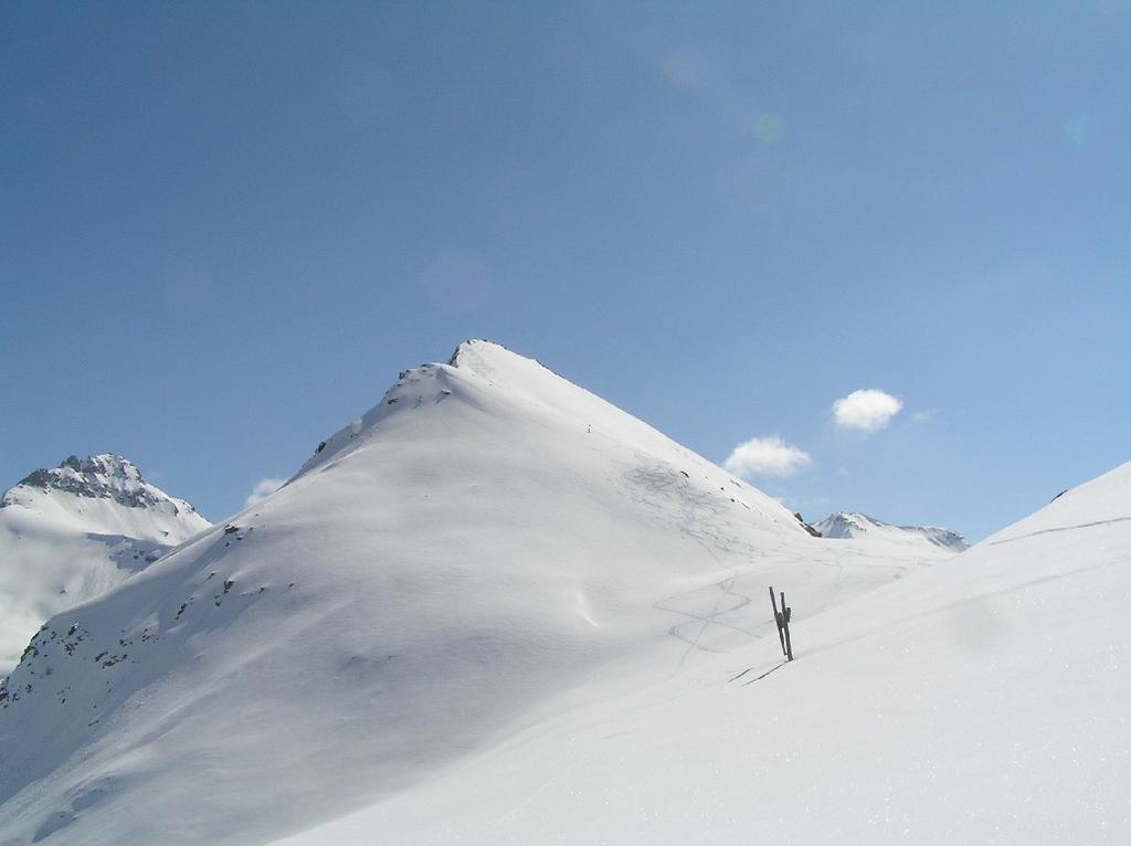 Dal colle ci si dirige a sx e si rimonta il ripido pendio sotto a quota 2680 che si supera uscendone a dx. Ci si dirige quindi verso la cresta proseguendo sempre su pendenze sostenute. Qui giunti (si possono lasciare gli sci) si prosegue lungo la cresta di erba e rocce rotte fino alla croce della Pointe Falinére (2763).