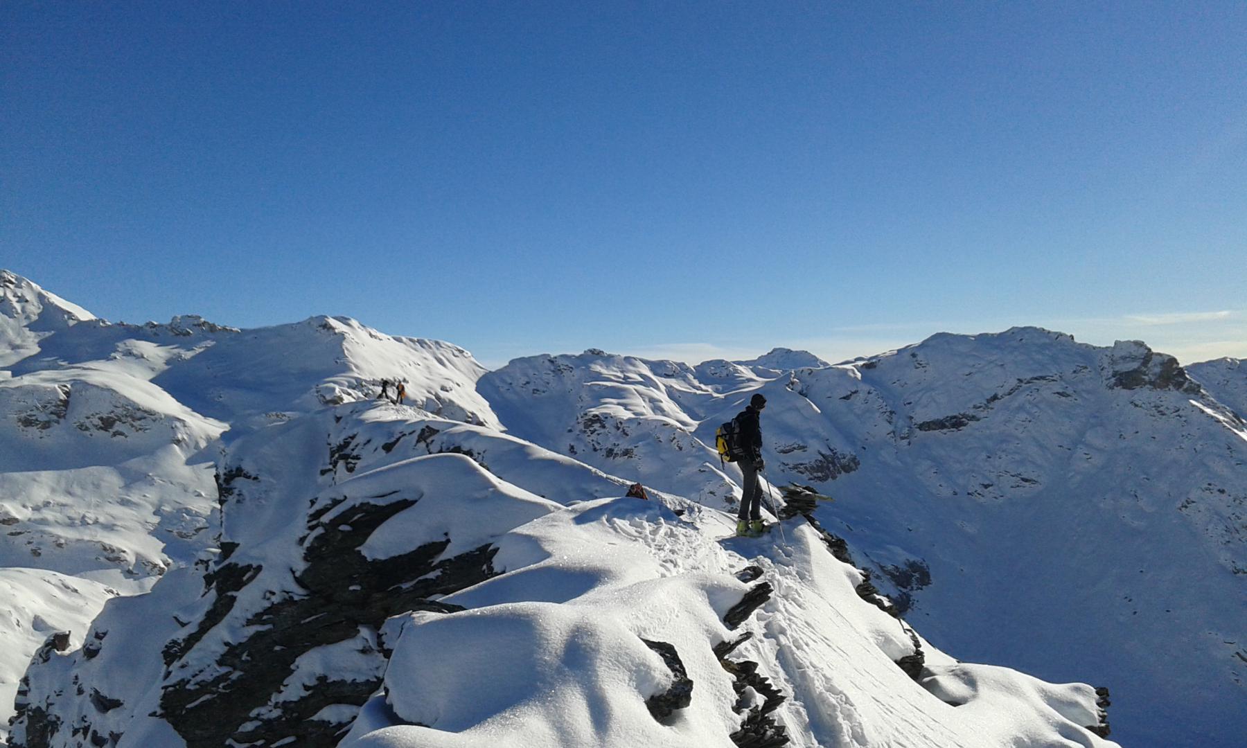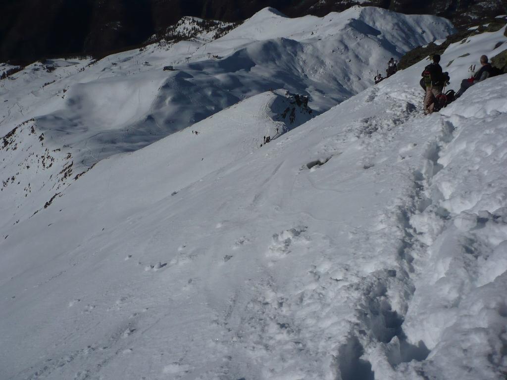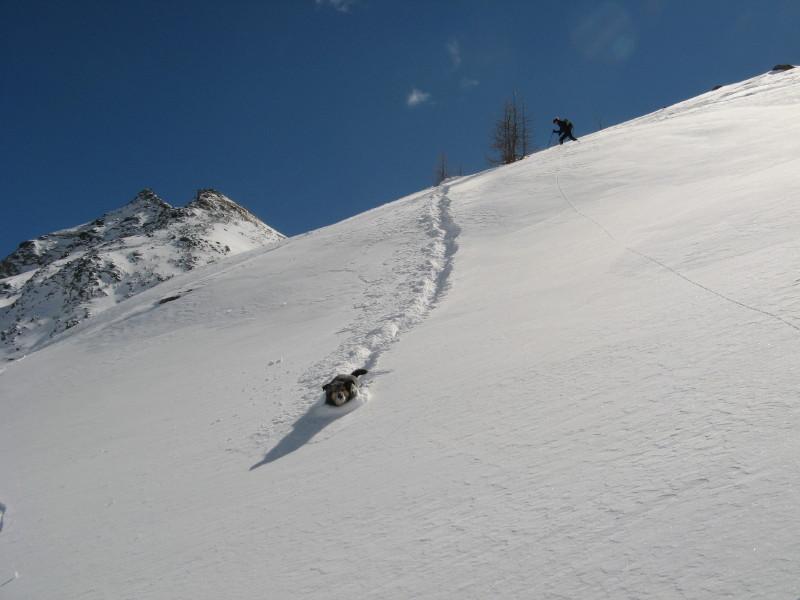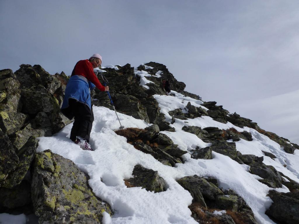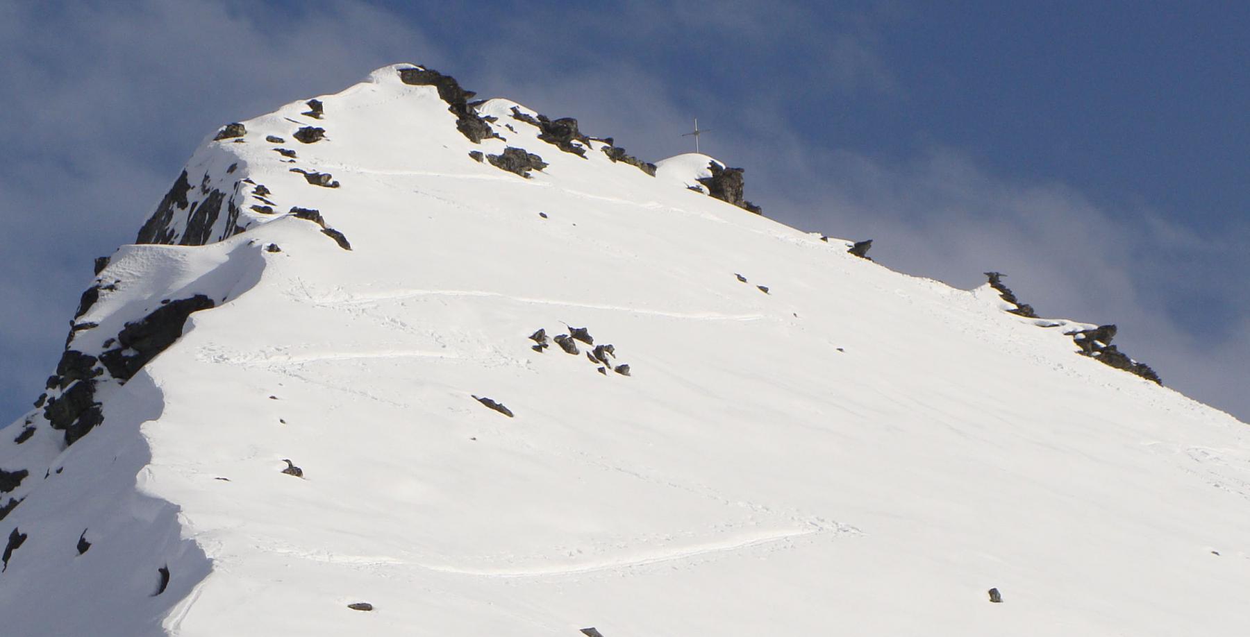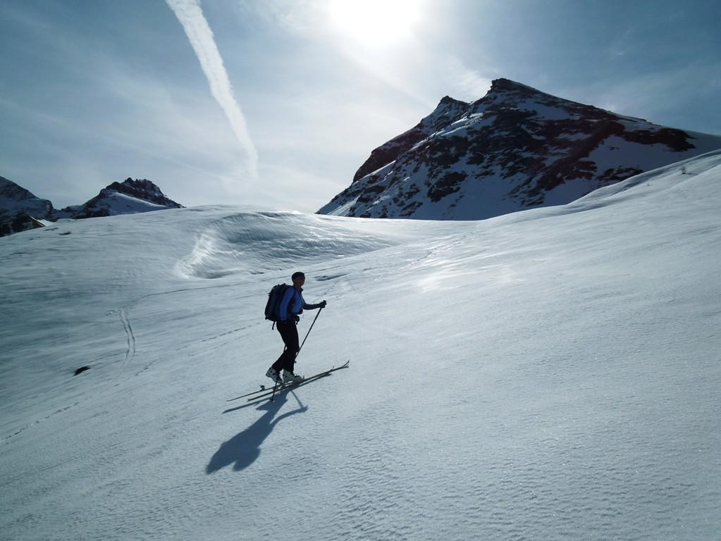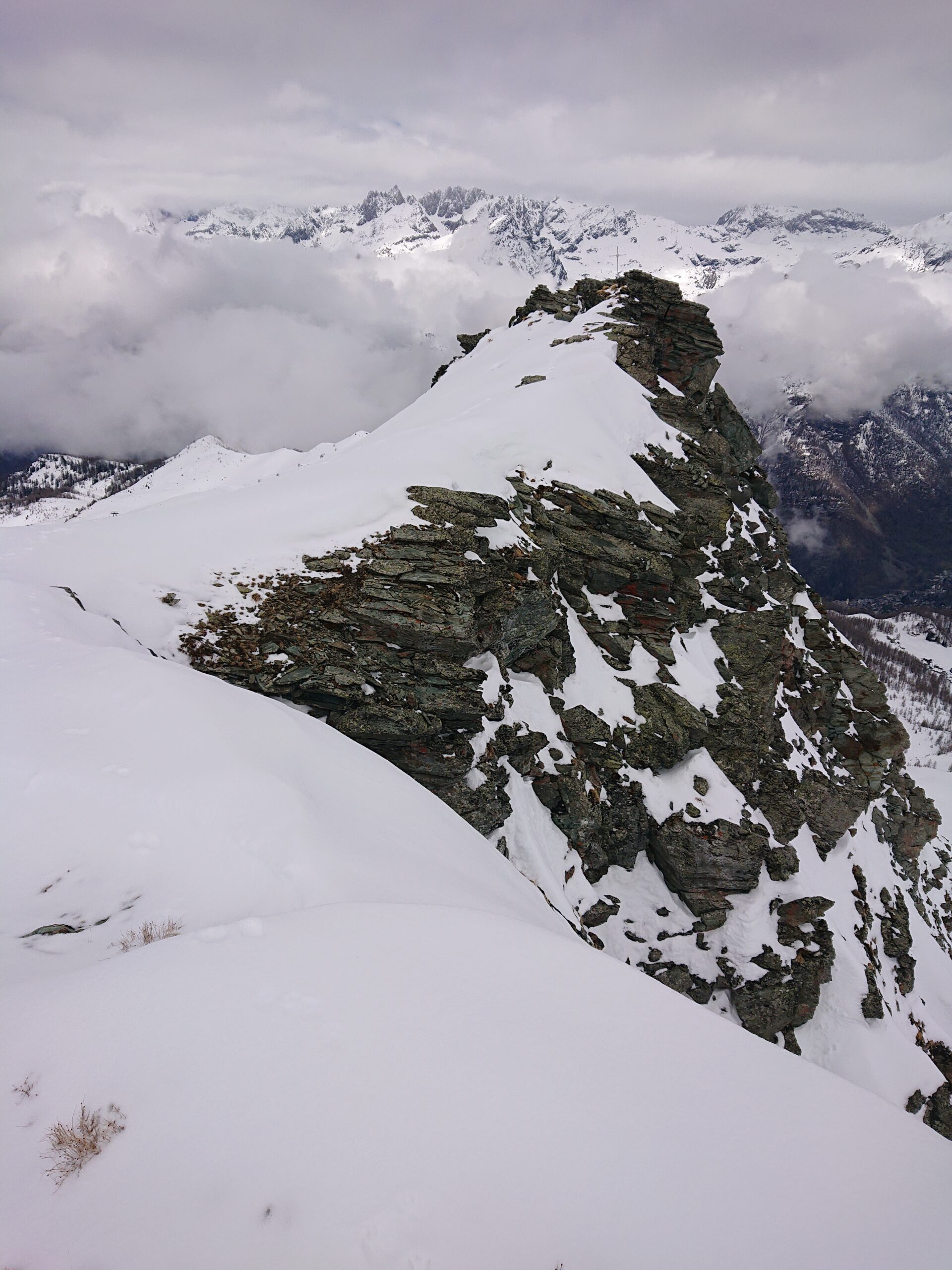Dal colle ci si dirige a sx e si rimonta il ripido pendio sotto a quota 2680 che si supera uscendone a dx. Ci si dirige quindi verso la cresta proseguendo sempre su pendenze sostenute. Qui giunti (si possono lasciare gli sci) si prosegue lungo la cresta di erba e rocce rotte fino alla croce della Pointe Falinére (2763).
