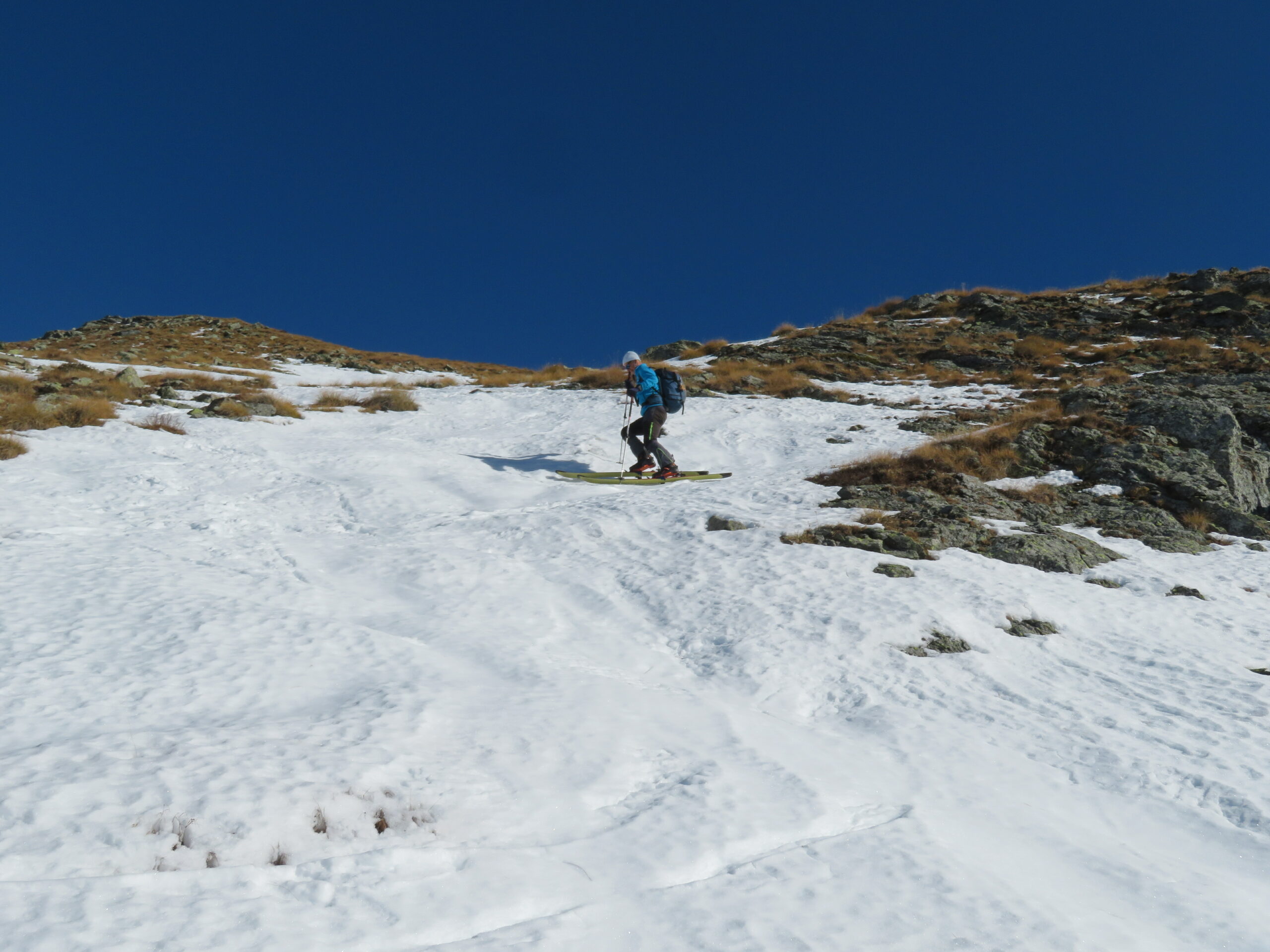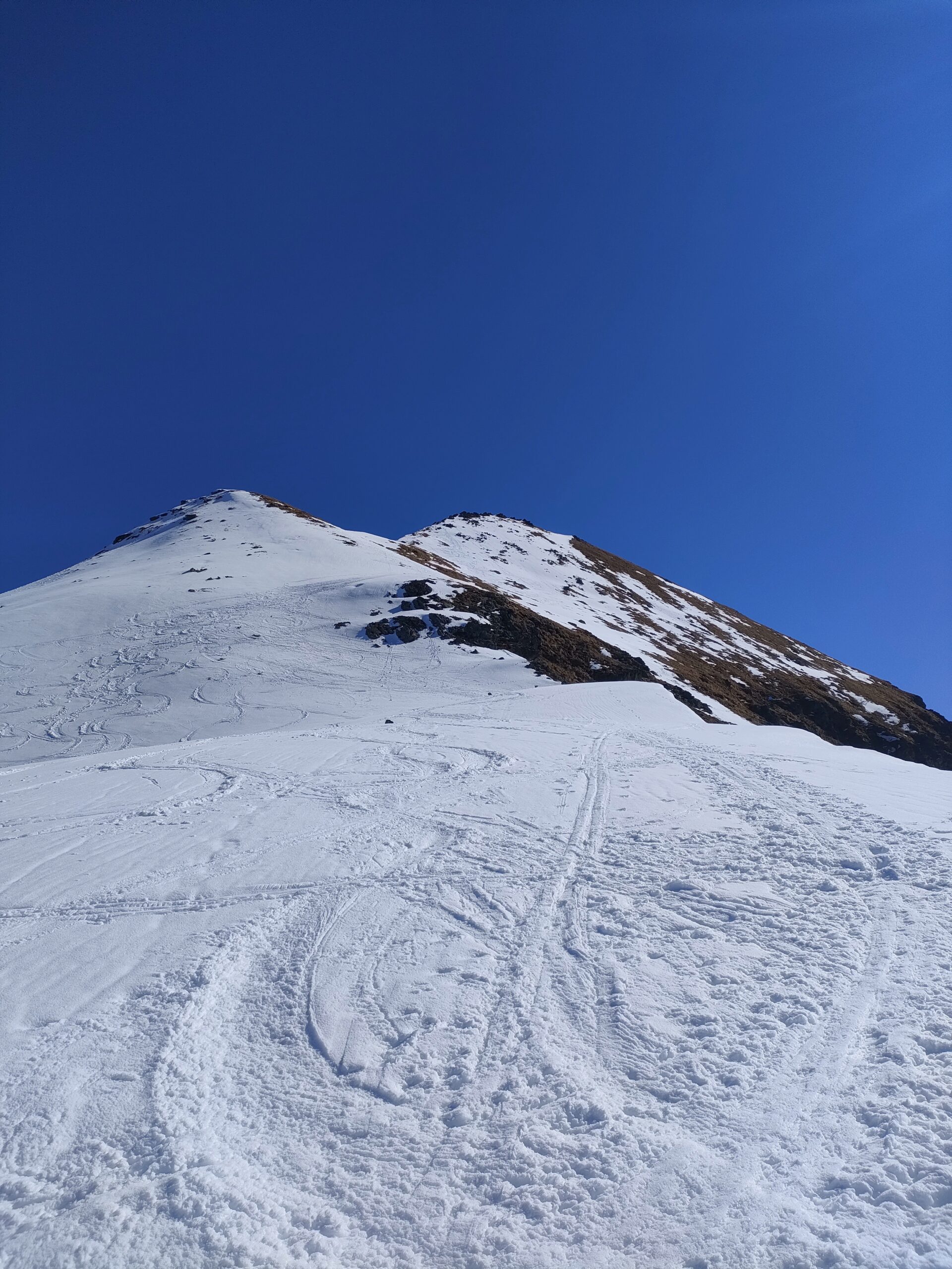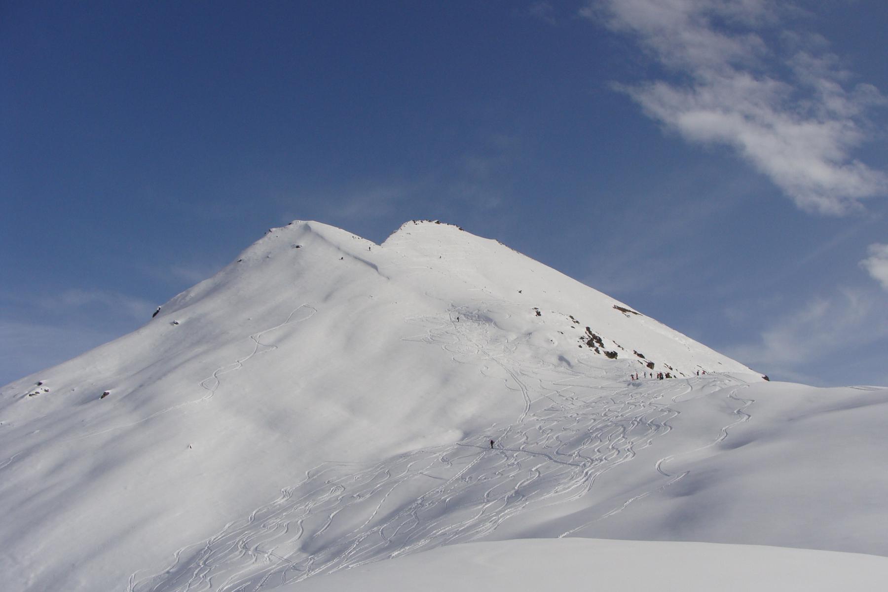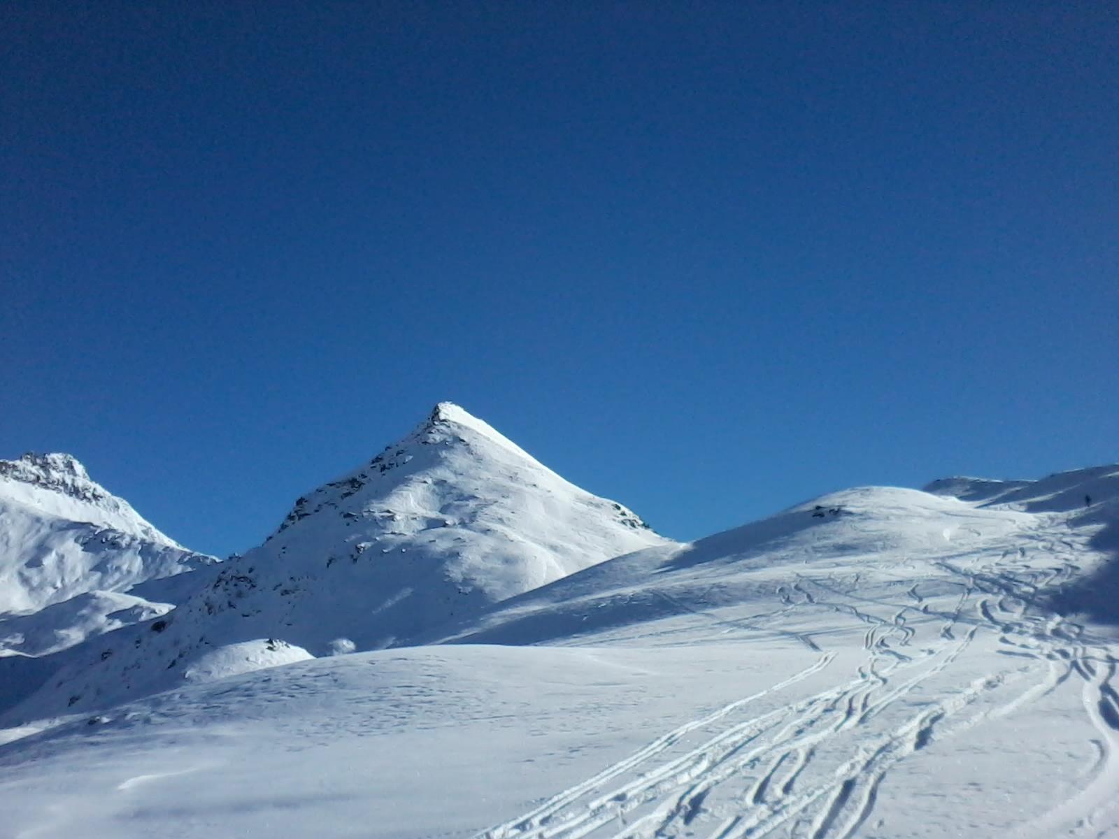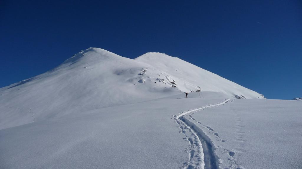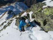 Dal colle ci si dirige a sx e si rimonta il ripido pendio sotto a quota 2680 che si supera uscendone a dx. Ci si dirige quindi verso la cresta proseguendo sempre su pendenze sostenute. Qui giunti (si possono lasciare gli sci) si prosegue lungo la cresta di erba e rocce rotte fino alla croce della Pointe Falinére (2763).