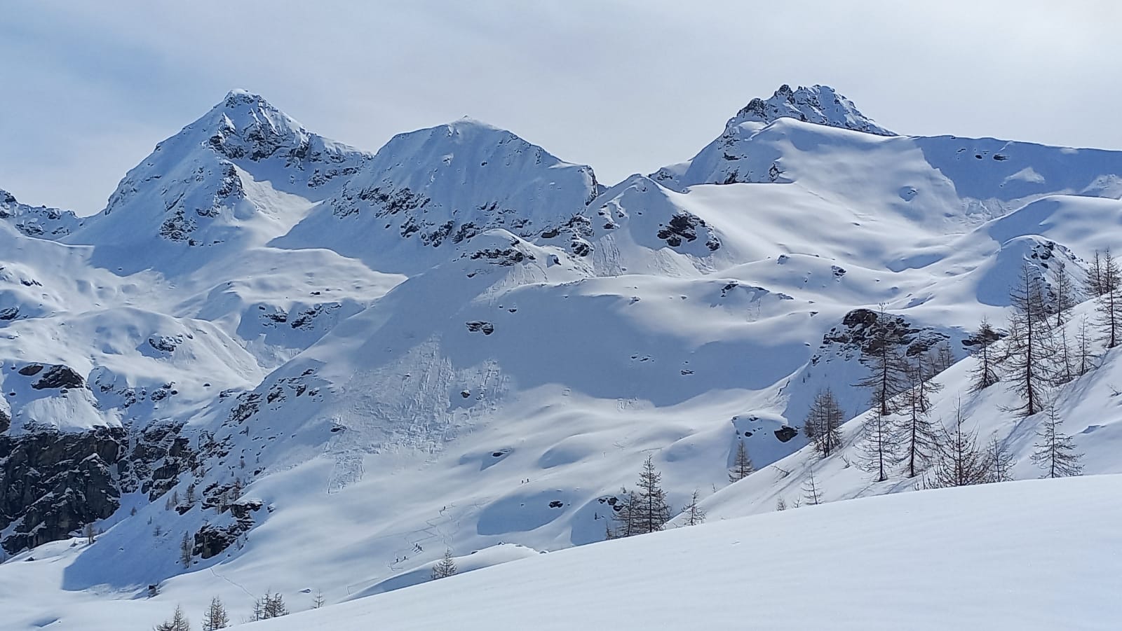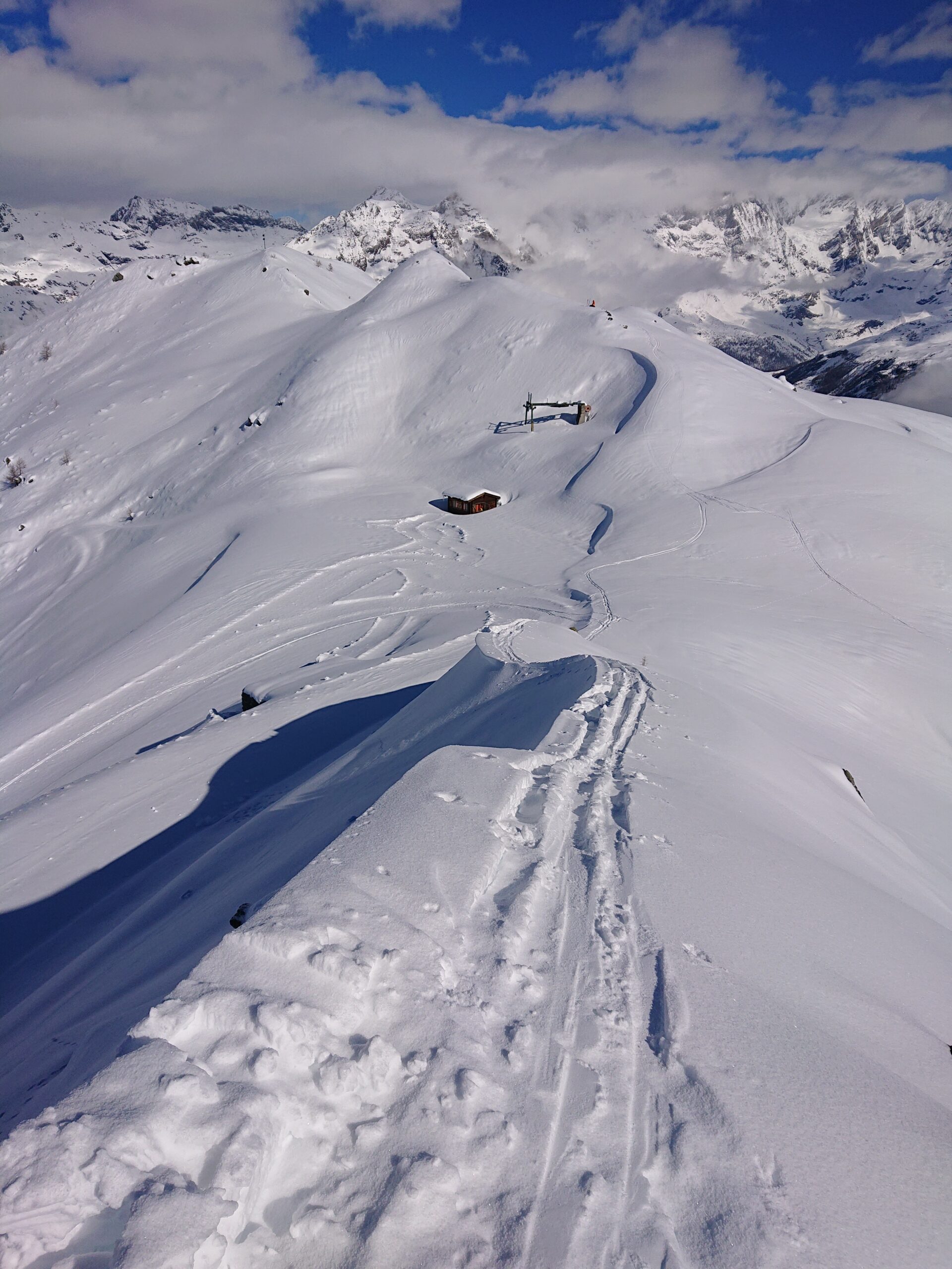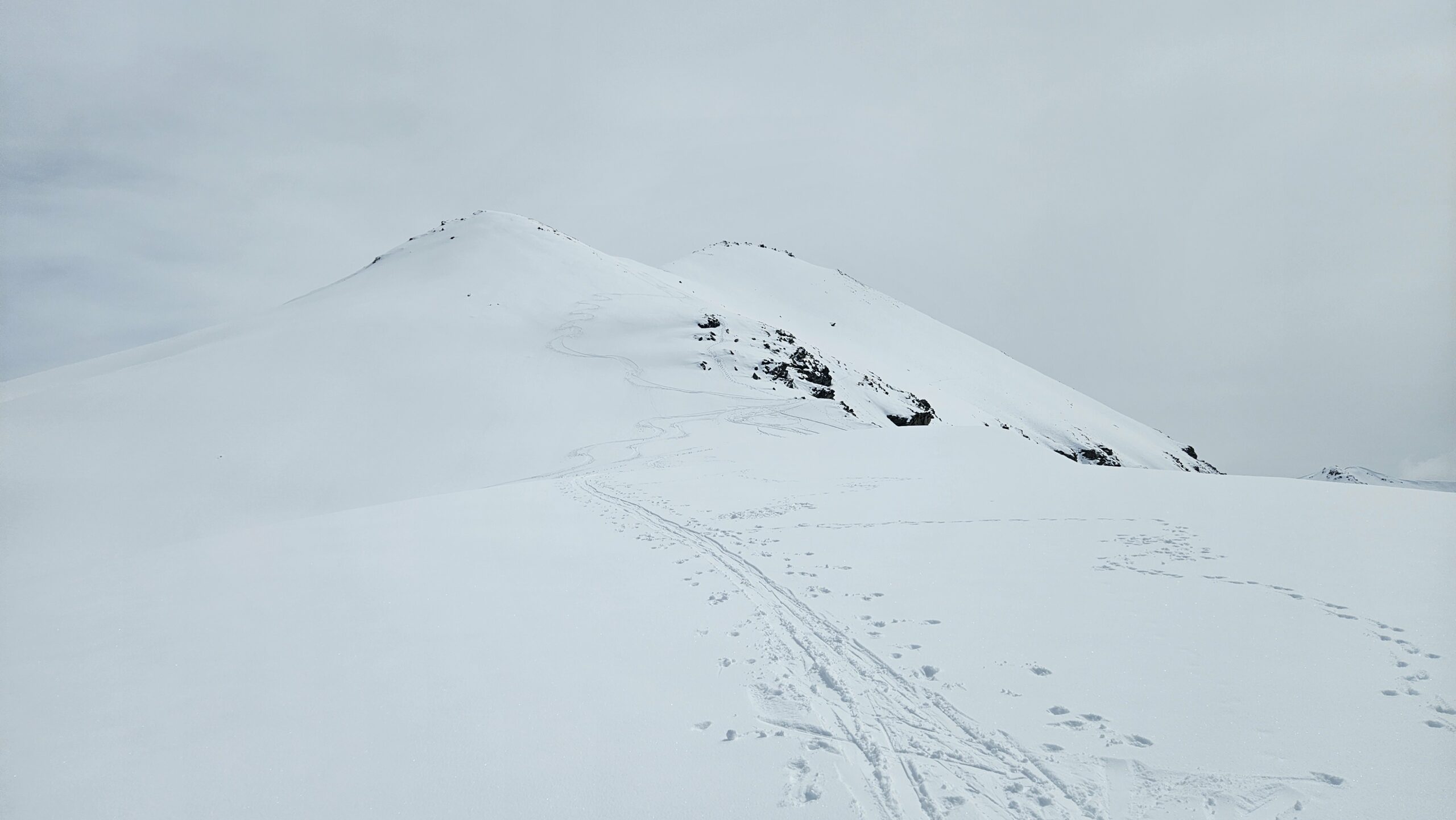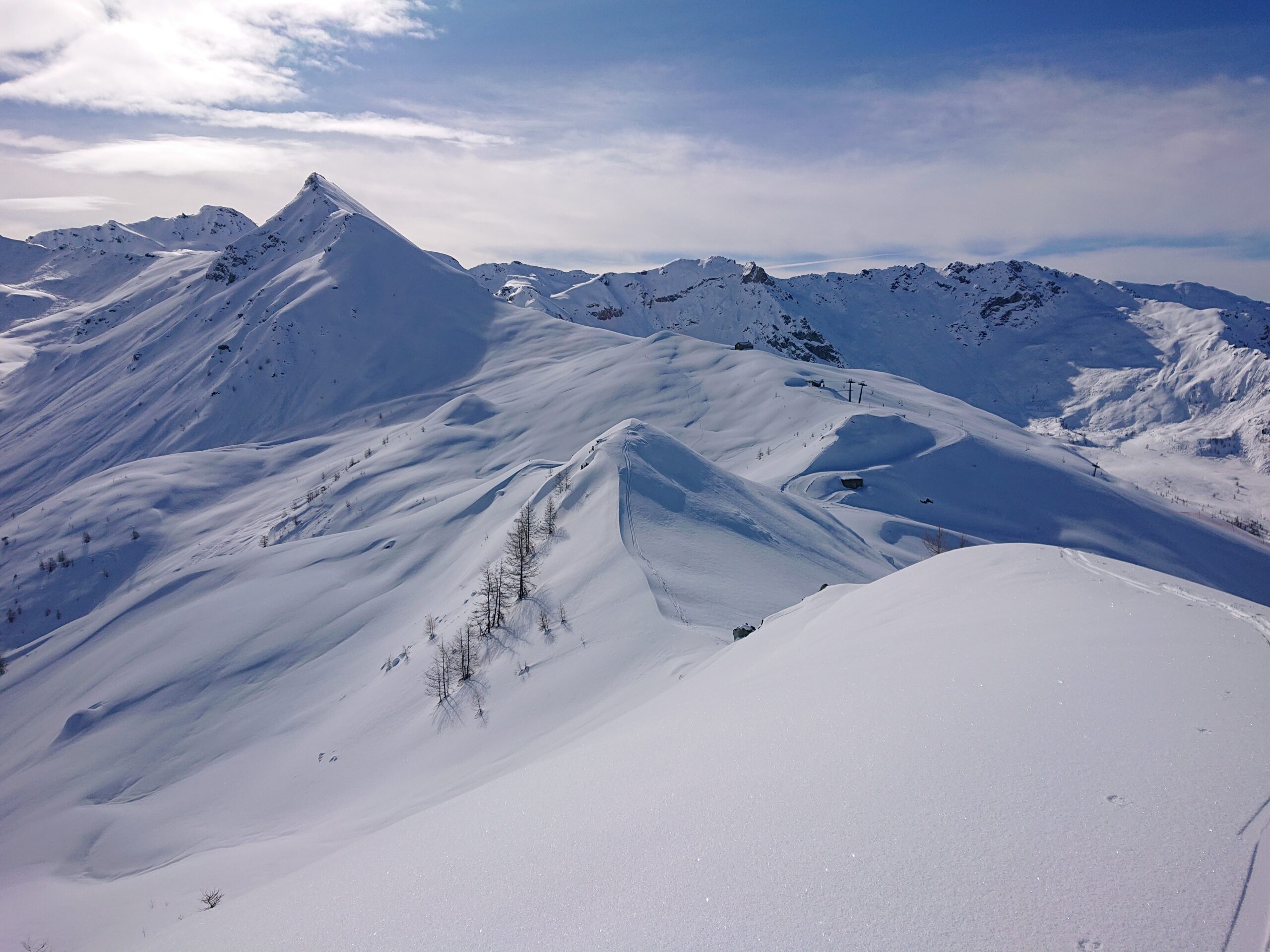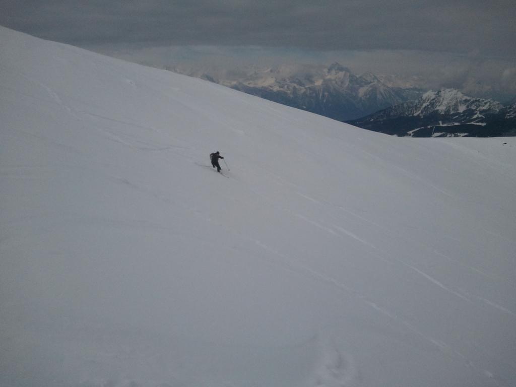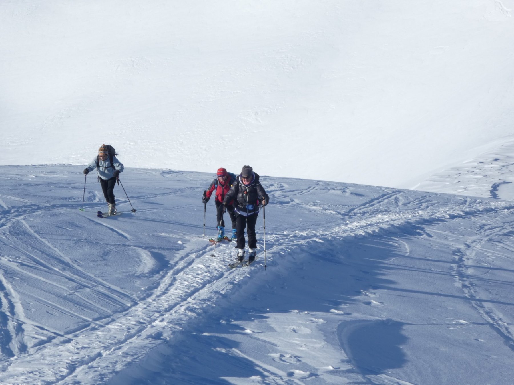 Dal colle ci si dirige a sx e si rimonta il ripido pendio sotto a quota 2680 che si supera uscendone a dx. Ci si dirige quindi verso la cresta proseguendo sempre su pendenze sostenute. Qui giunti (si possono lasciare gli sci) si prosegue lungo la cresta di erba e rocce rotte fino alla croce della Pointe Falinére (2763).