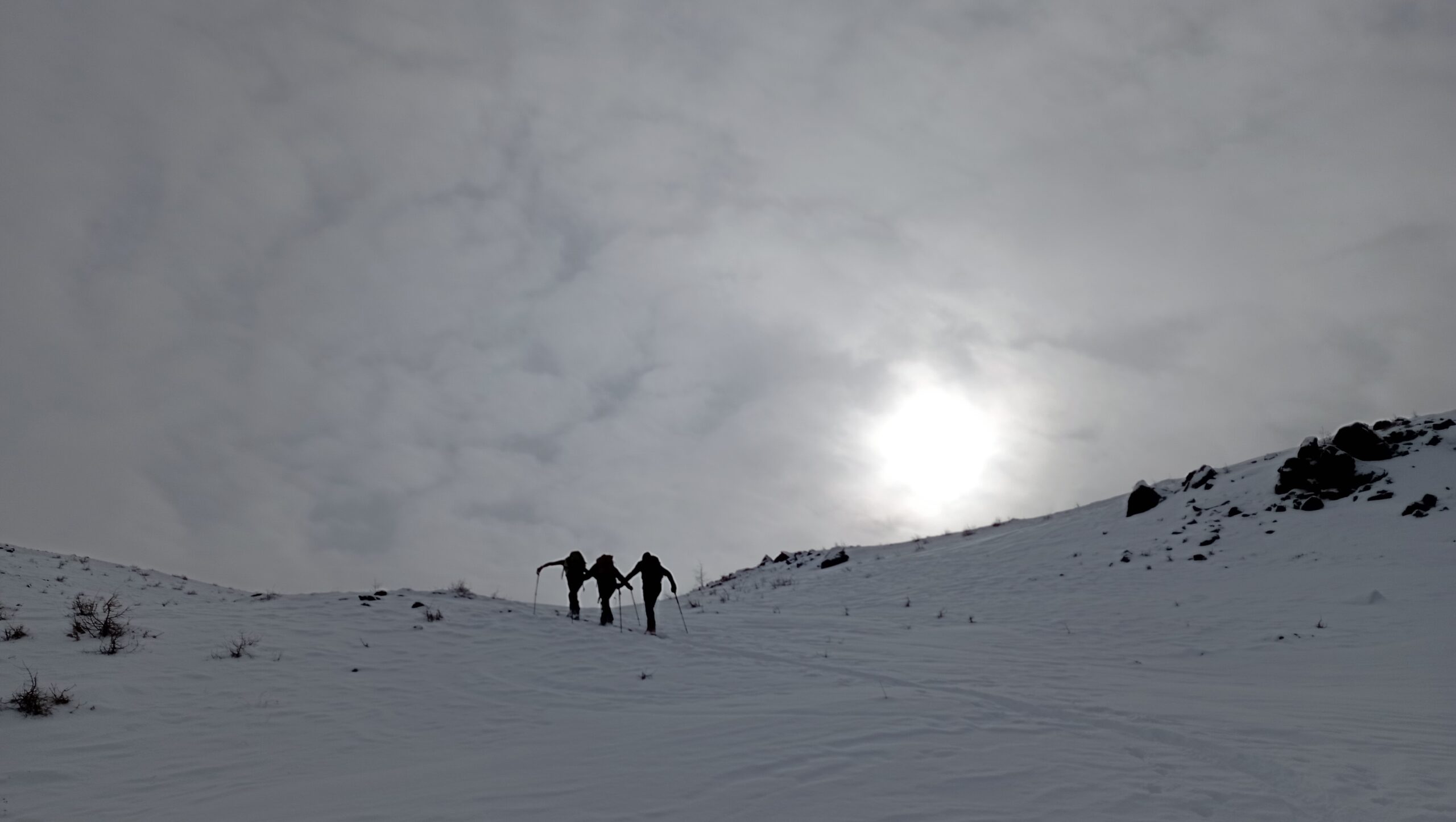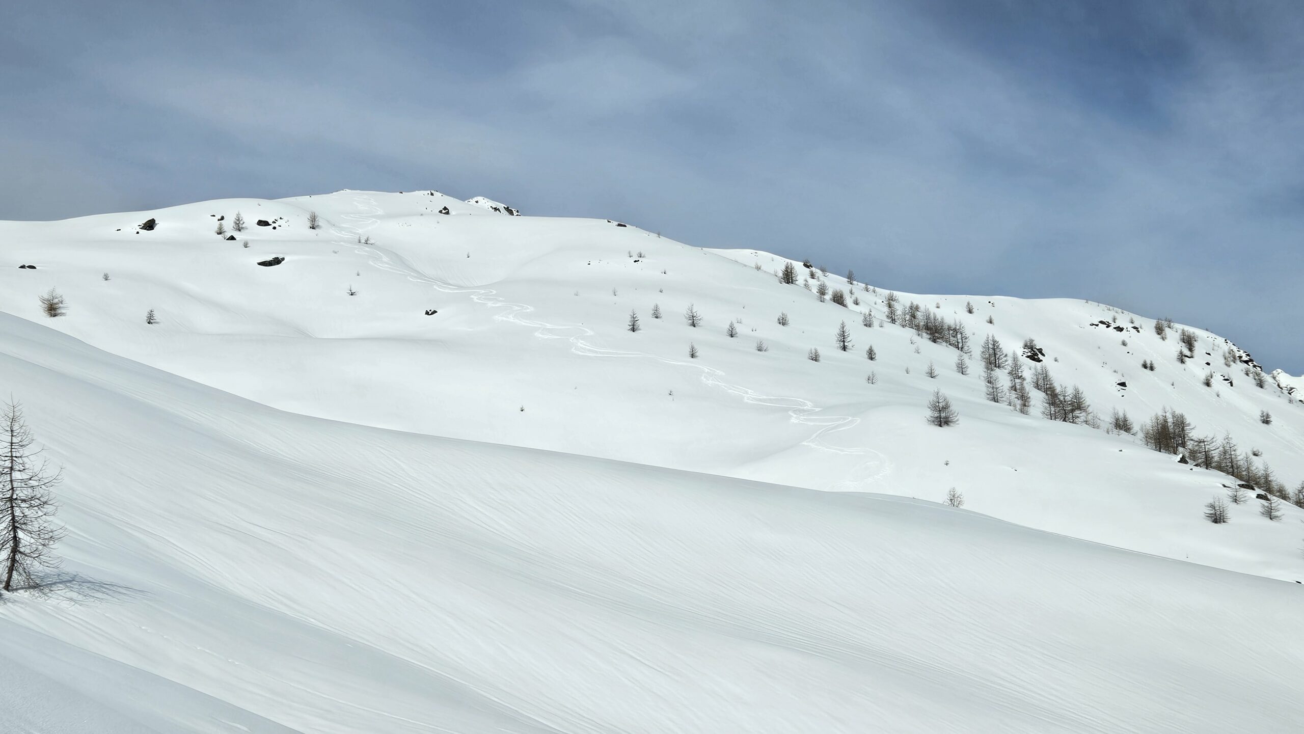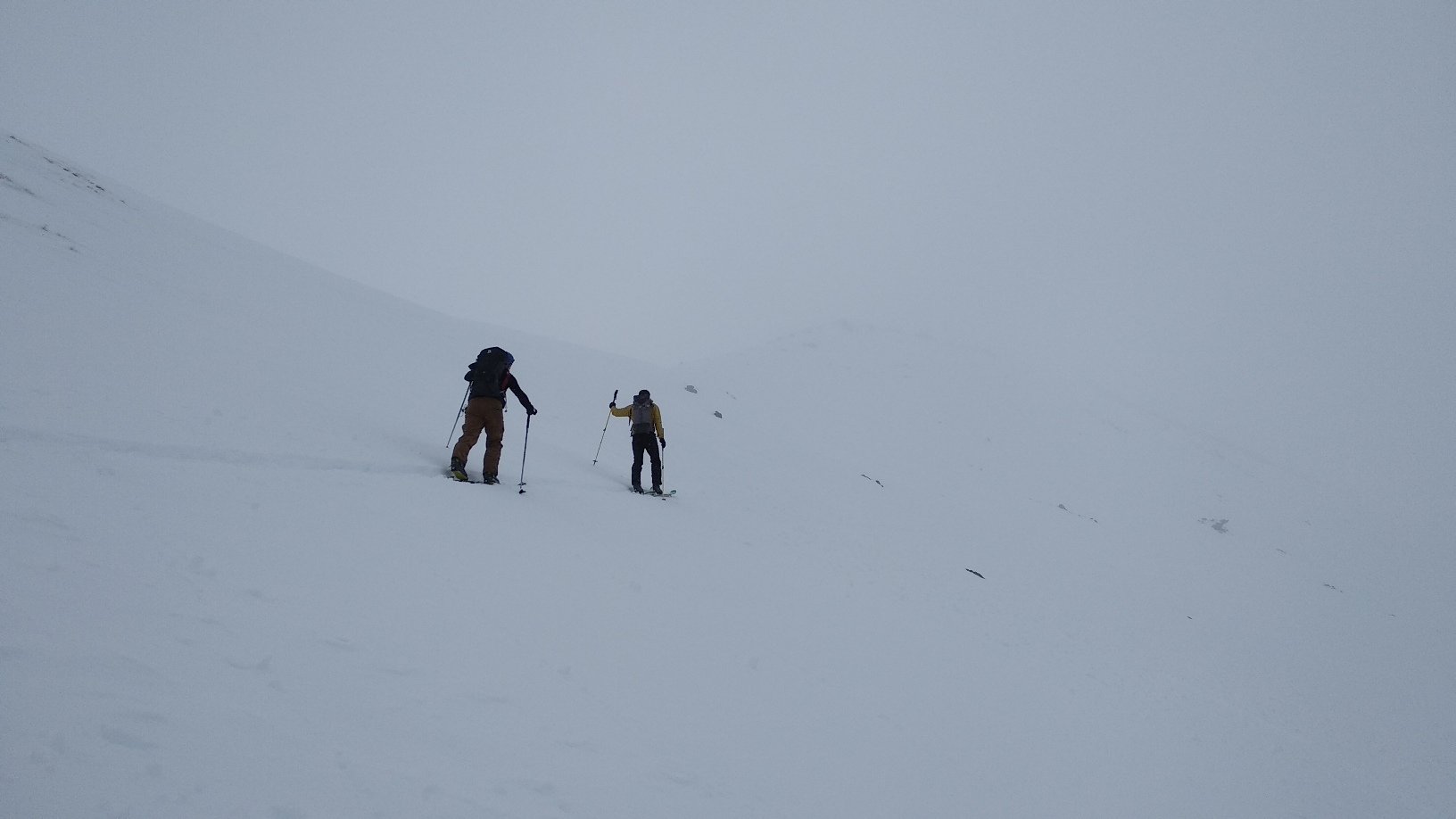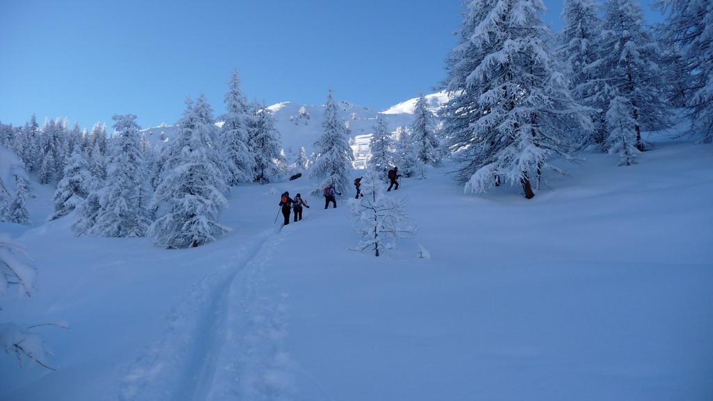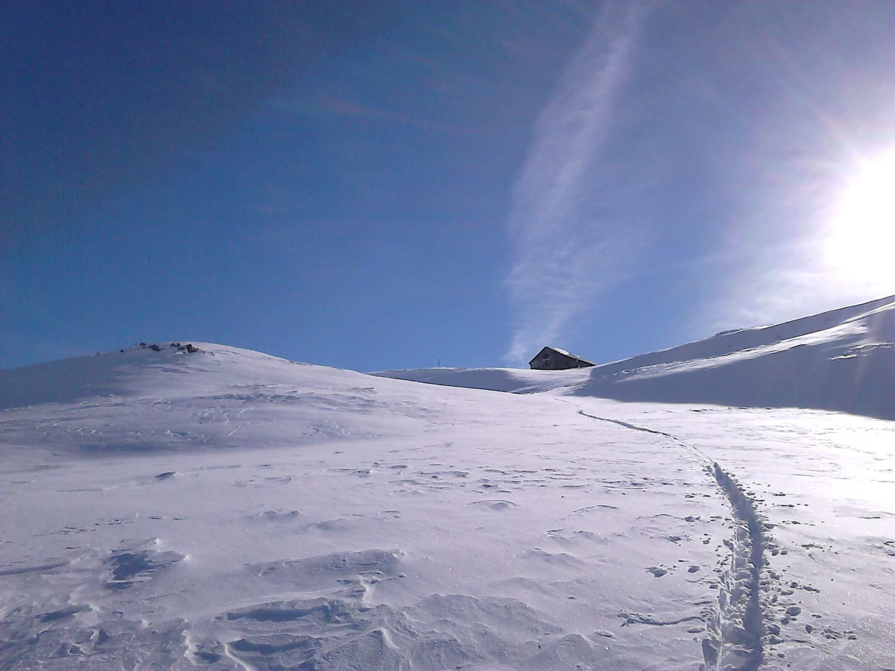 Dal colle ci si dirige a sx e si rimonta il ripido pendio sotto a quota 2680 che si supera uscendone a dx. Ci si dirige quindi verso la cresta proseguendo sempre su pendenze sostenute. Qui giunti (si possono lasciare gli sci) si prosegue lungo la cresta di erba e rocce rotte fino alla croce della Pointe Falinére (2763).