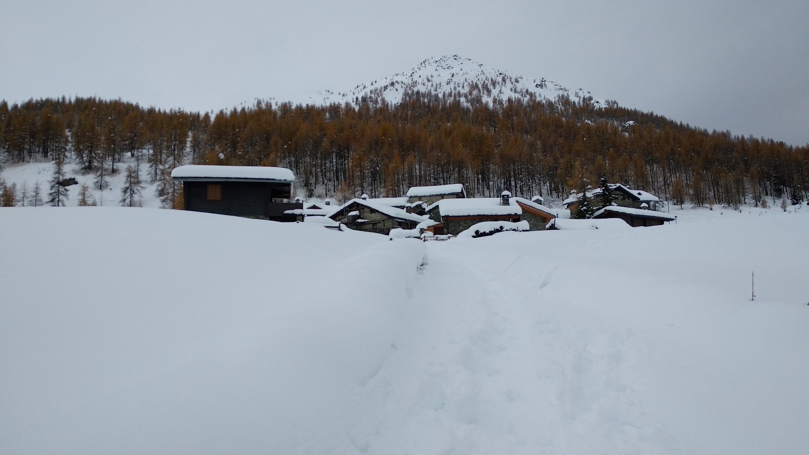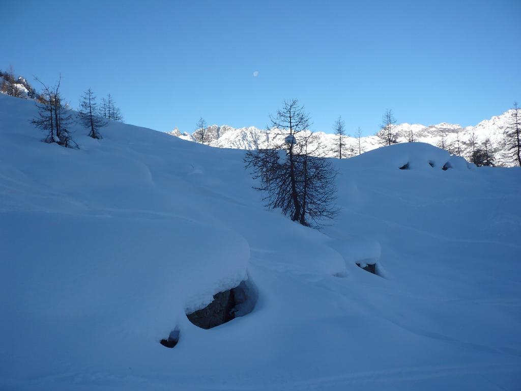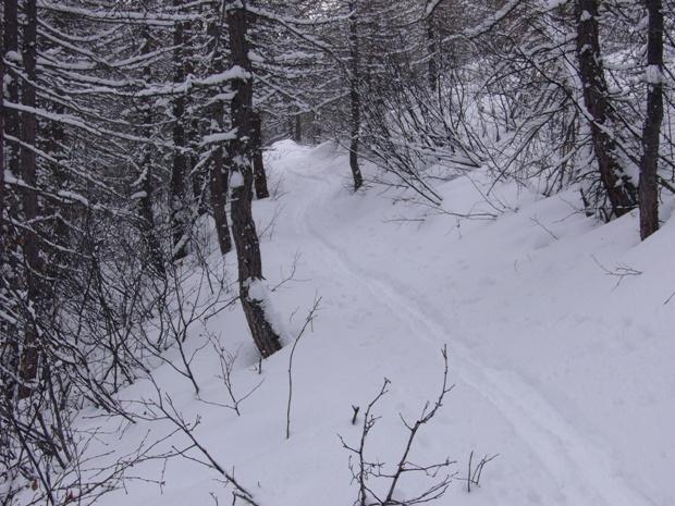 Dall’Alpe la Barmaz (2023) si prende la stradina piuttosto ripida che in breve conduce al pianoro dove sorgono le baite di Cheneil (2105). Si passa alle spalle dell’abitato e si entra nel lariceto che si attraversa all’incirca da NW verso SE. Usciti dal bosco si giunge in una zona aperta e pianeggiante.