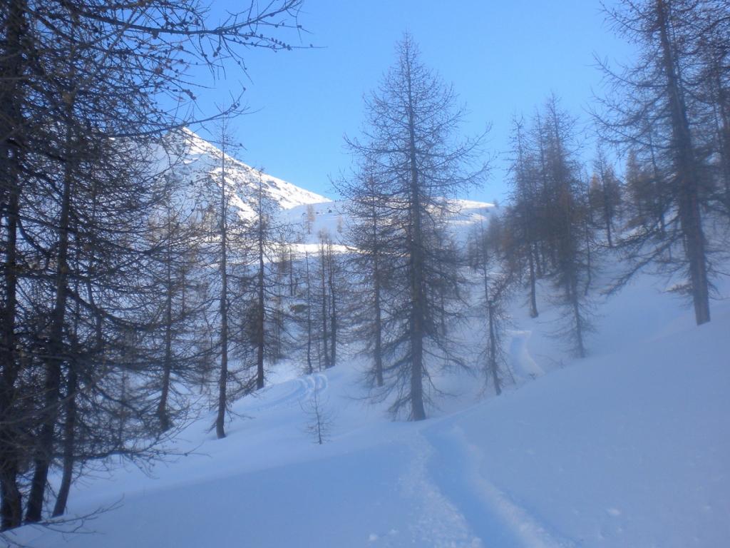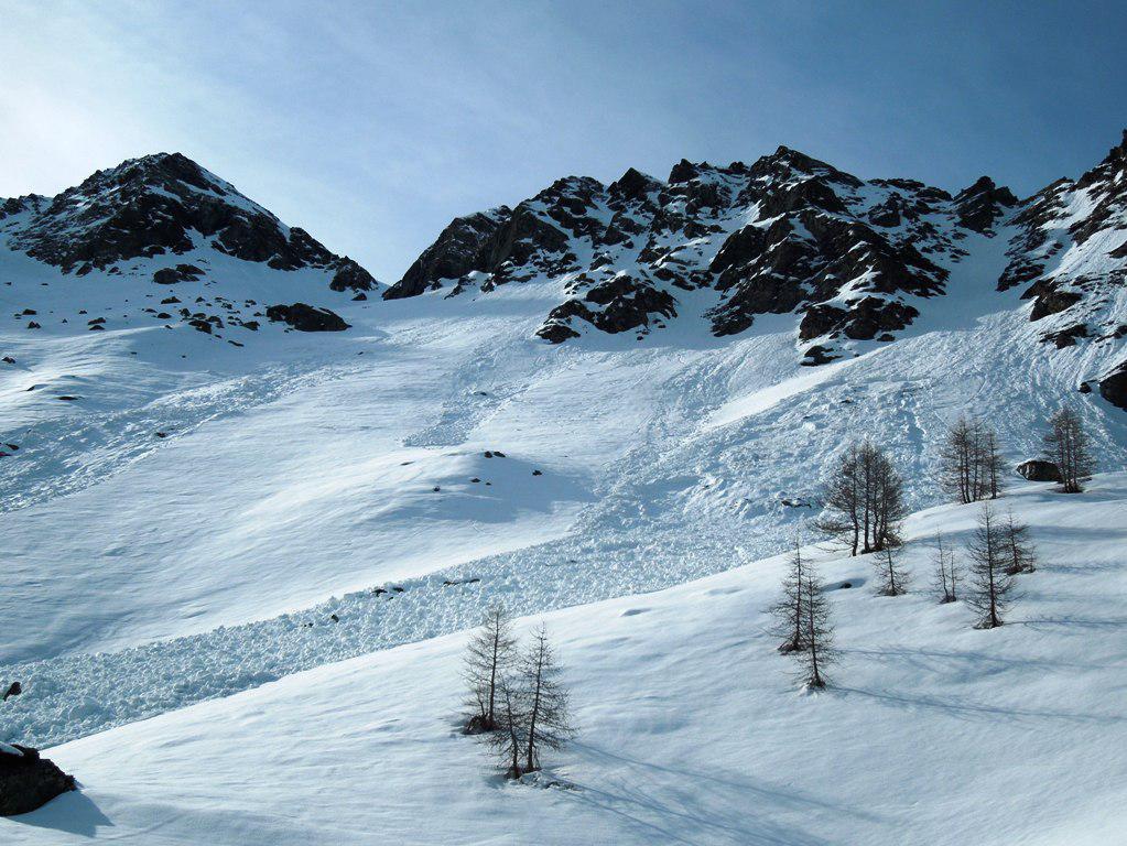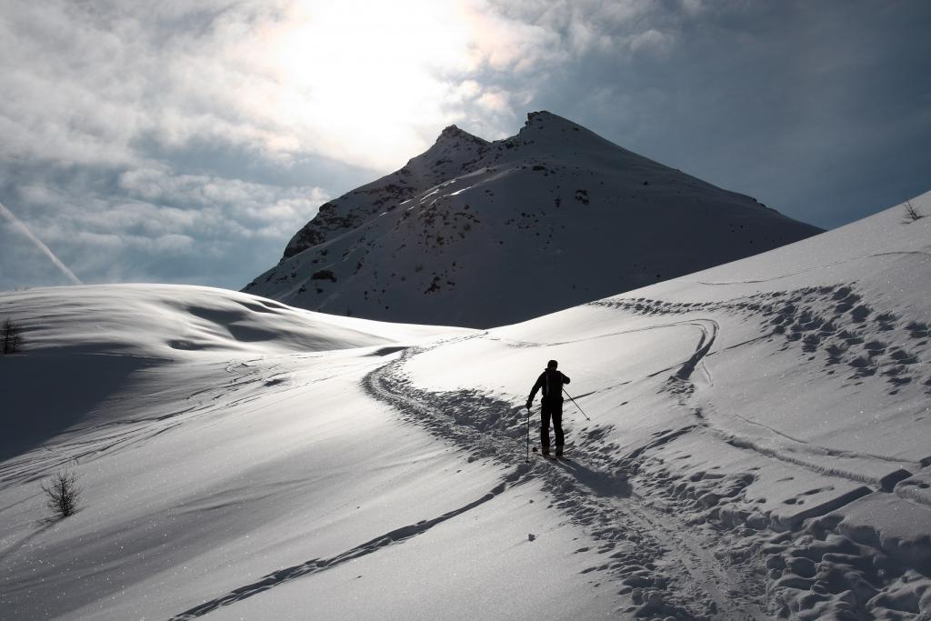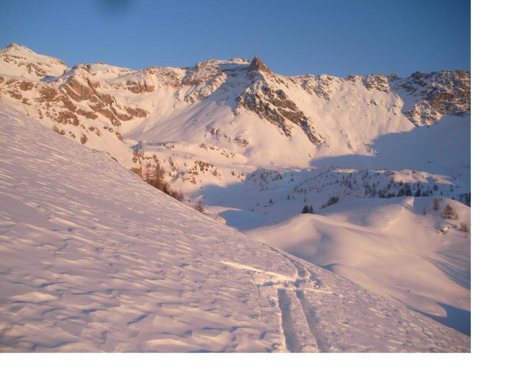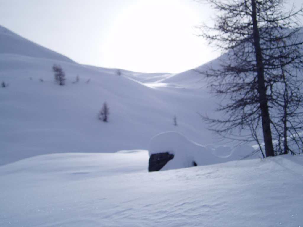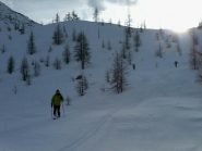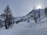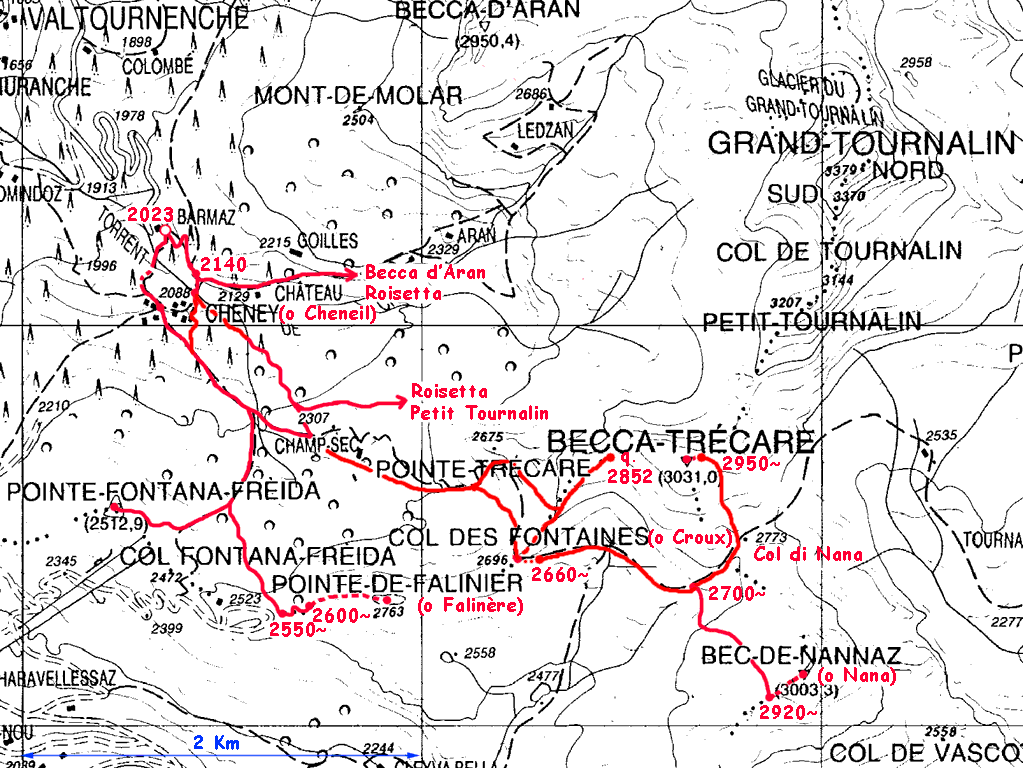 Si trascura la traccia che punta all’ alpeggio di Champsec (Col di Croux – Col di Nana) e si prosegue invece sulla dx superando un pendio canale che immette più sopra in un valloncello più marcato. Si percorre interamente il valloncello fino a circa 2350 m dove si lascia alla propria dx la traccia per la Punta Fontana Fredda. Si prende quindi a sx, si supera un breve pendio e poi si prosegue su modeste pendenze fino a raggiungere in breve il valico a ovest della Pointe Falinére (ca. 2550).