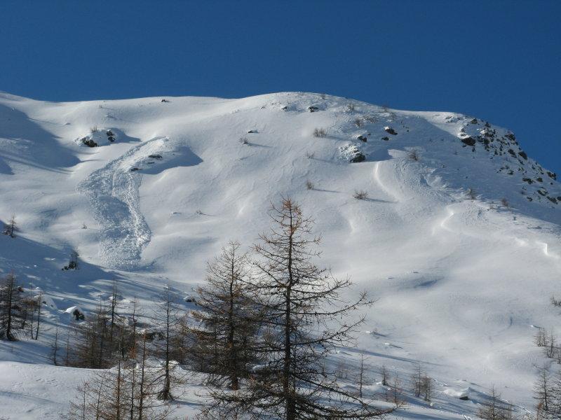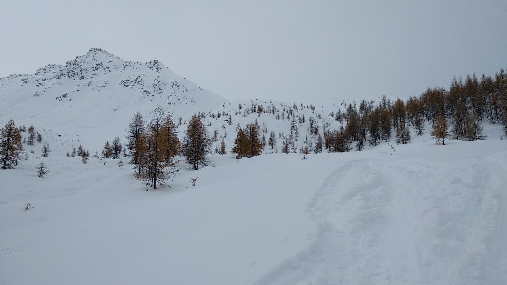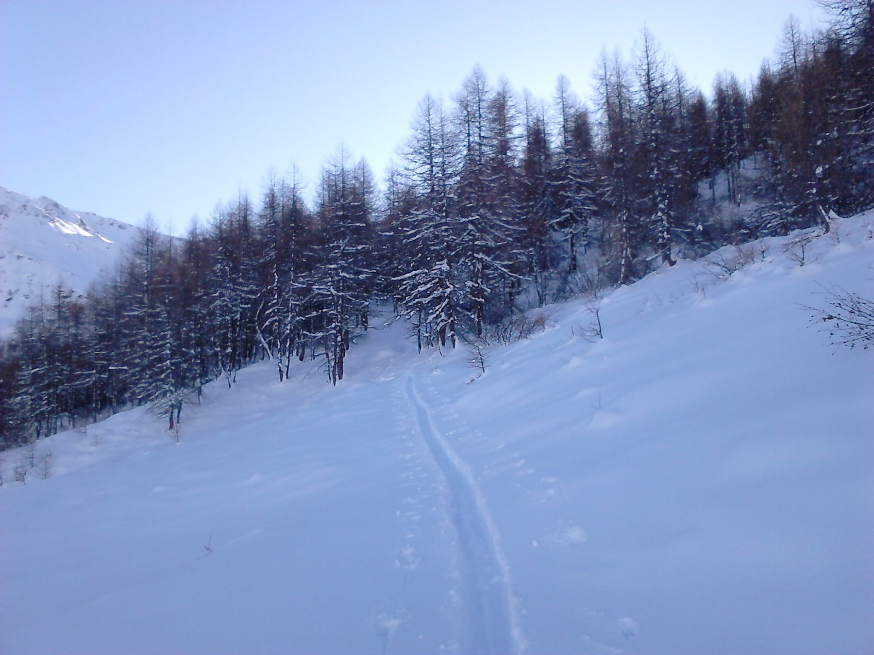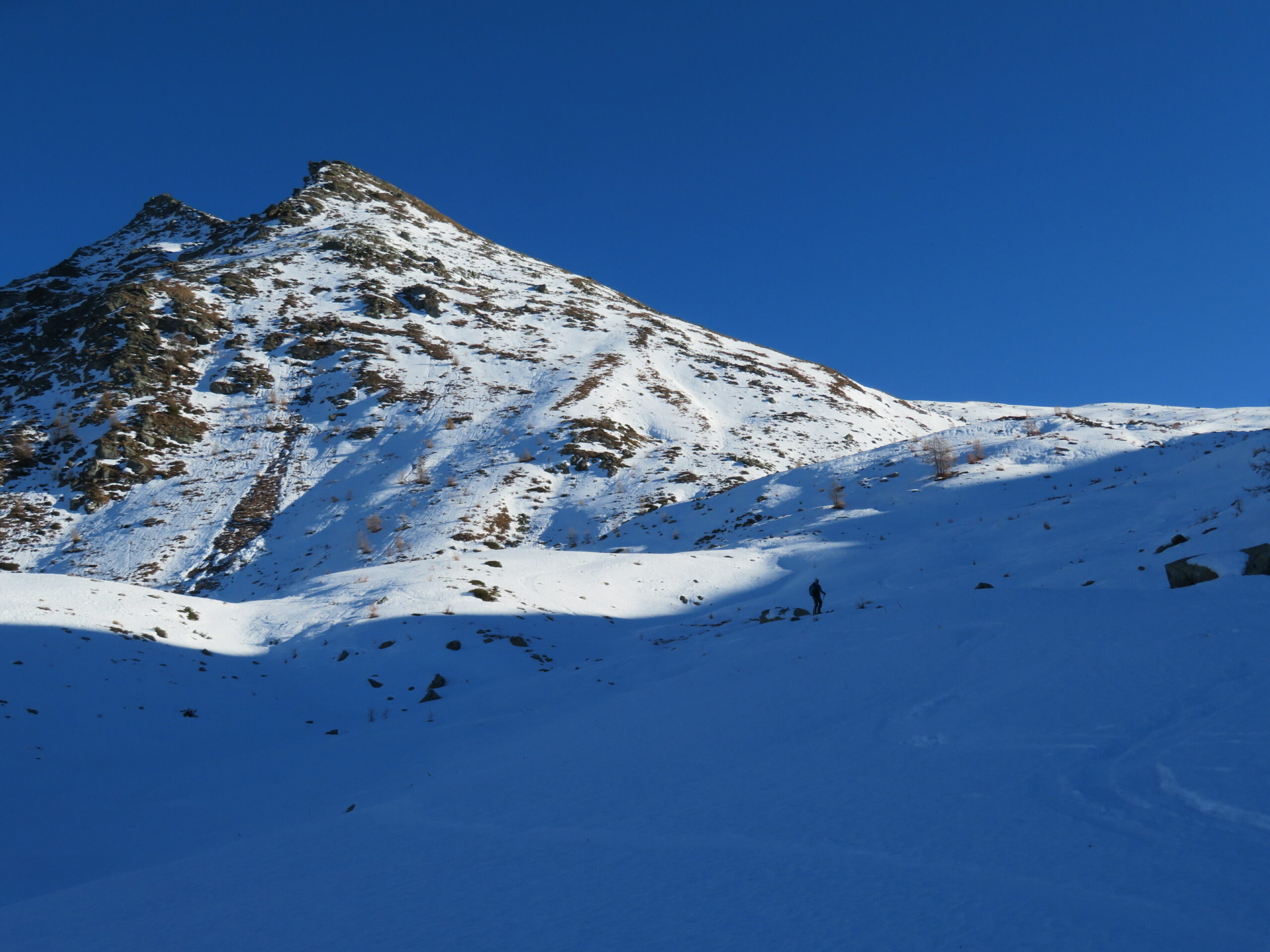 Si trascura la traccia che punta all’ alpeggio di Champsec (Col di Croux – Col di Nana) e si prosegue invece sulla dx superando un pendio canale che immette più sopra in un valloncello più marcato. Si percorre interamente il valloncello fino a circa 2350 m dove si lascia alla propria dx la traccia per la Punta Fontana Fredda. Si prende quindi a sx, si supera un breve pendio e poi si prosegue su modeste pendenze fino a raggiungere in breve il valico a ovest della Pointe Falinére (ca. 2550).