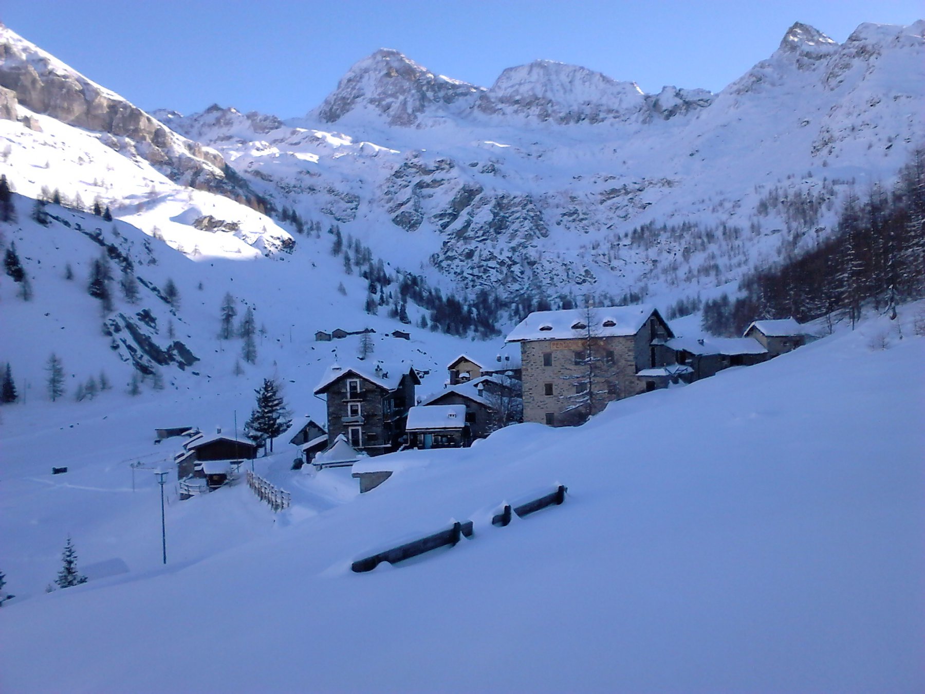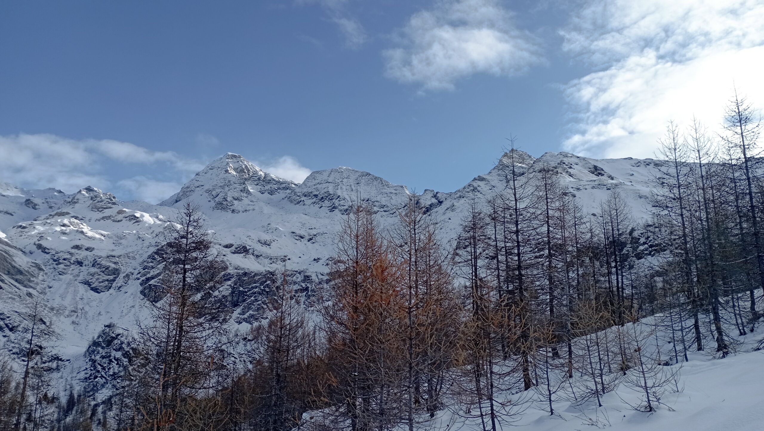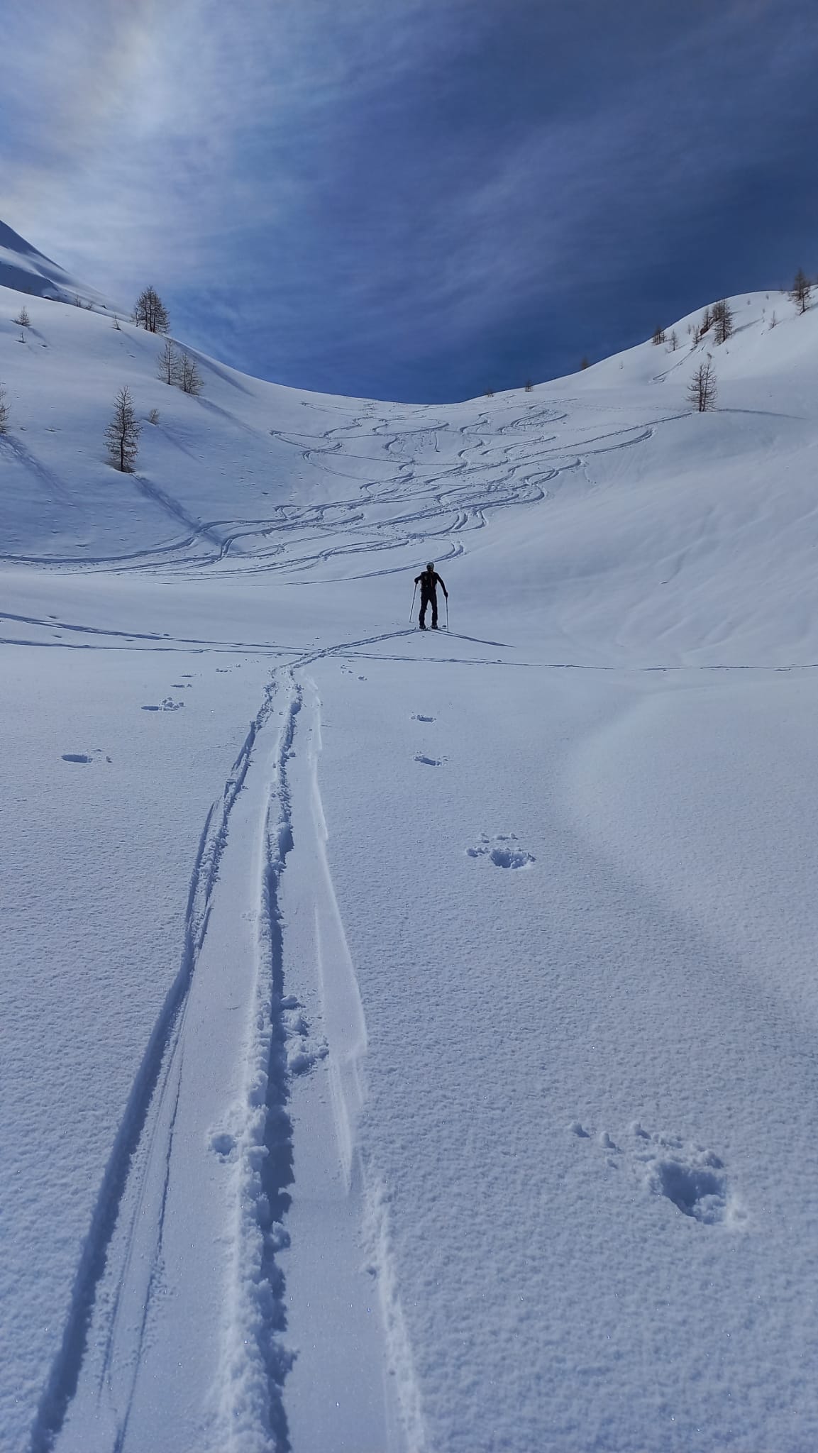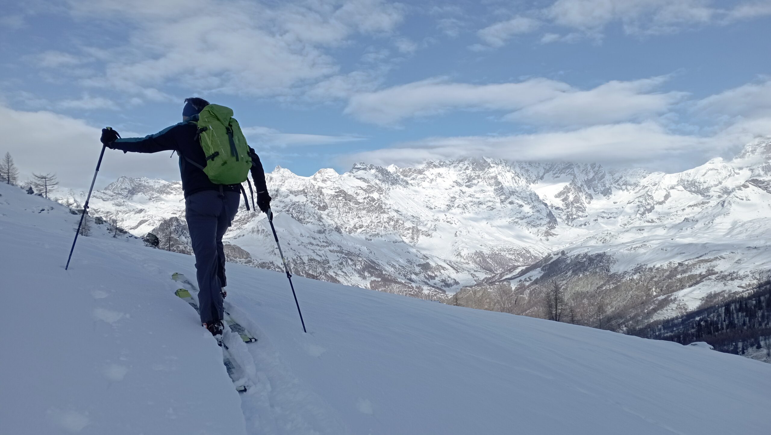 Si trascura la traccia che punta all’ alpeggio di Champsec (Col di Croux – Col di Nana) e si prosegue invece sulla dx superando un pendio canale che immette più sopra in un valloncello più marcato. Si percorre interamente il valloncello fino a circa 2350 m dove si lascia alla propria dx la traccia per la Punta Fontana Fredda. Si prende quindi a sx, si supera un breve pendio e poi si prosegue su modeste pendenze fino a raggiungere in breve il valico a ovest della Pointe Falinére (ca. 2550).
