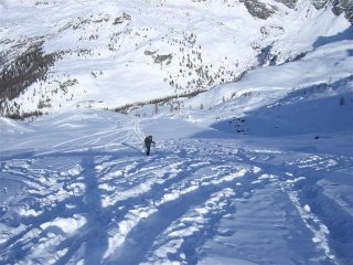 Salve a tutti. Tanto era bella la gita e forse tanto poco mi dedico al lavoro che ho deciso di replicarla il giorno appresso. Identiche ottime condizioni. Scendendo a destra si evitano anche le poche pietre del giorno prima. Ottima compagna di gita Elisabetta alla sua prima esperienza di skialp.