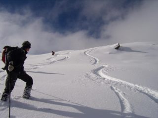 Partiti da Cheneil ore 9 tempo coperto neve presente già dal piazzale 30 cm farinosa .Saliti al colle sotto la punta Falinere discesa su farina da sballo per 300 m. ripellato e saliti alla Fontana Fredda arrivati in punta è uscito il sole.