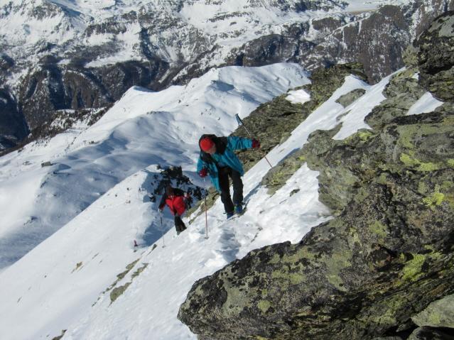 Nessun problema sin sulla dorsale ovest a quota 2600. Di lì in su, dove si drizza il pendio, sino al colletto sotto la punta sono necessari i rampant e di lì in punta i ramponi (tracce gelate); naturalmente questo vale per gli umani che preferiscono viaggiare in sicurezza.