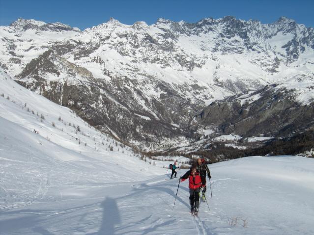 La discesa del versante Sud alle12, dall’ultimo colletto alla quota 2600, è crosta portante un po’ delicata (Bruno docet) . Nella parte alta si trovano strati irregolari di neve fresca sulle vecchie tracce che poggiano su strati di vecchia crosta non sempre portanti. Noi siamo scesi nel primo canalone addossato alla parete N-O della Falinère trovando farina canadese profonda, ma anche qui il fondo su cui appoggia non è costante, per cui qualche caduta ci può anche stare. Scegliendo oculatamente il percorso si trovano queste condizioni sino nella conca di Cheneil, ma come usa dire il caro Guidox sempre ben sciabile. Magari mezza stella in più ci stava.