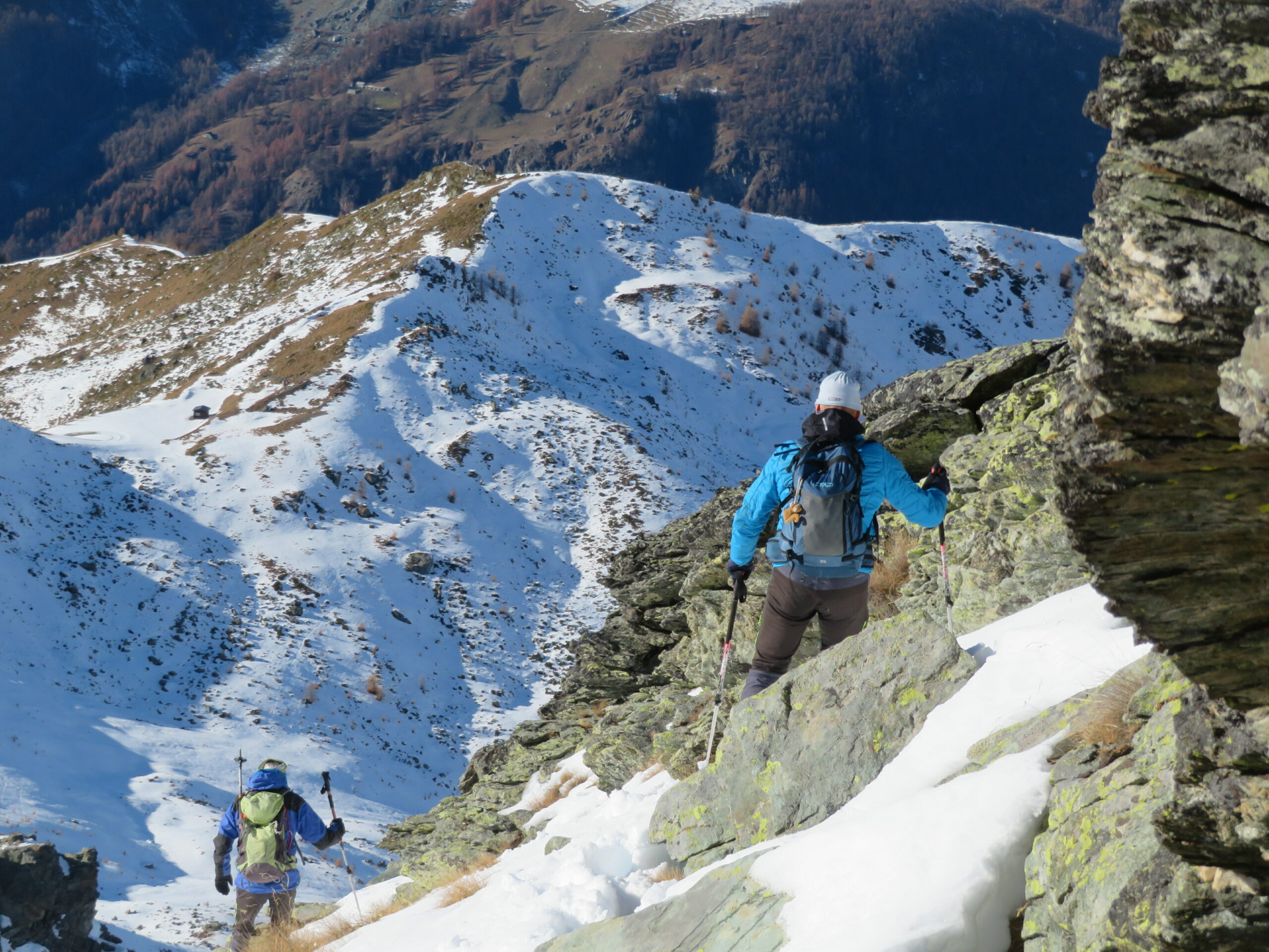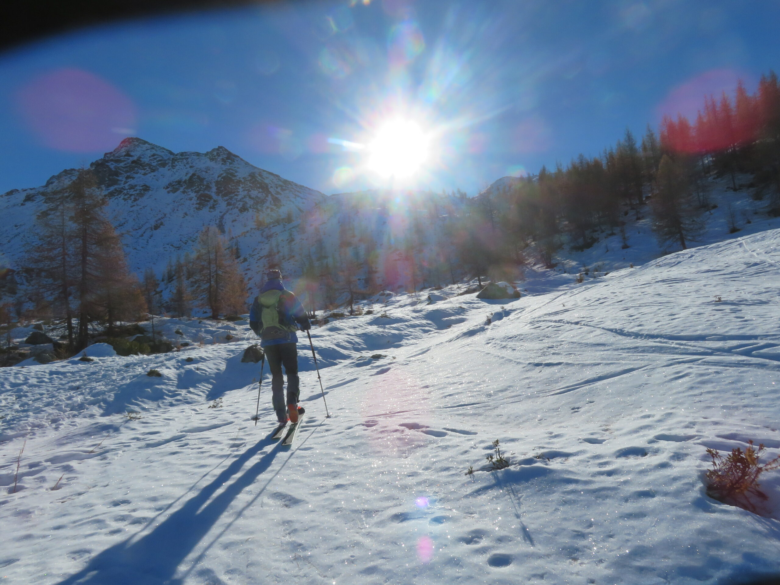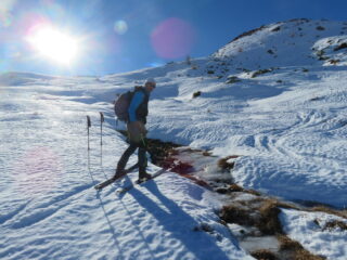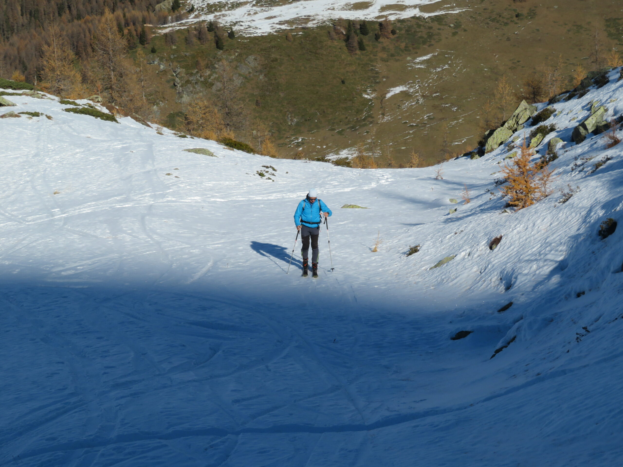 Discesa finale in basso per il largo canale all’estrema sx orografica , sotto la P. Fontanafredda.