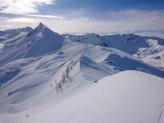 Percorso su oltre 1 metro di neve, in basso crosta portante (mattino) in alto mediamente dura e portante, giusto 10 cm di fresca qua e là. Usato i rampanti sul ripido per la cresta, da sotto la spalla in su. Ramponi per l’ultimo tratto di cresta per sicurezza viste le recenti nevicate record, tanta neve con brevi tratti non coesi. Salito alla Punta di Fontana Fredda e poi sulla linea di cresta fino alla vetta oltre la croce della Falinere. Discesa nei valloncelli su 10-20 cm di neve fresca eccellente.
