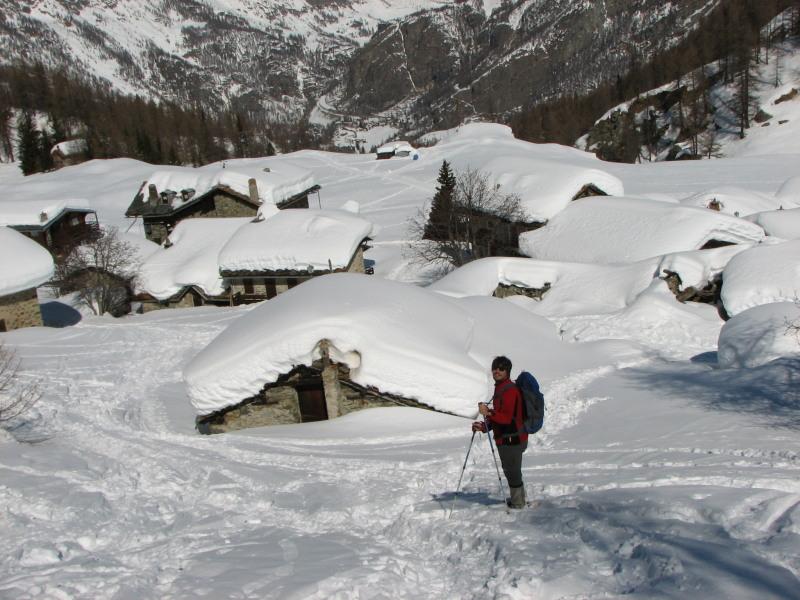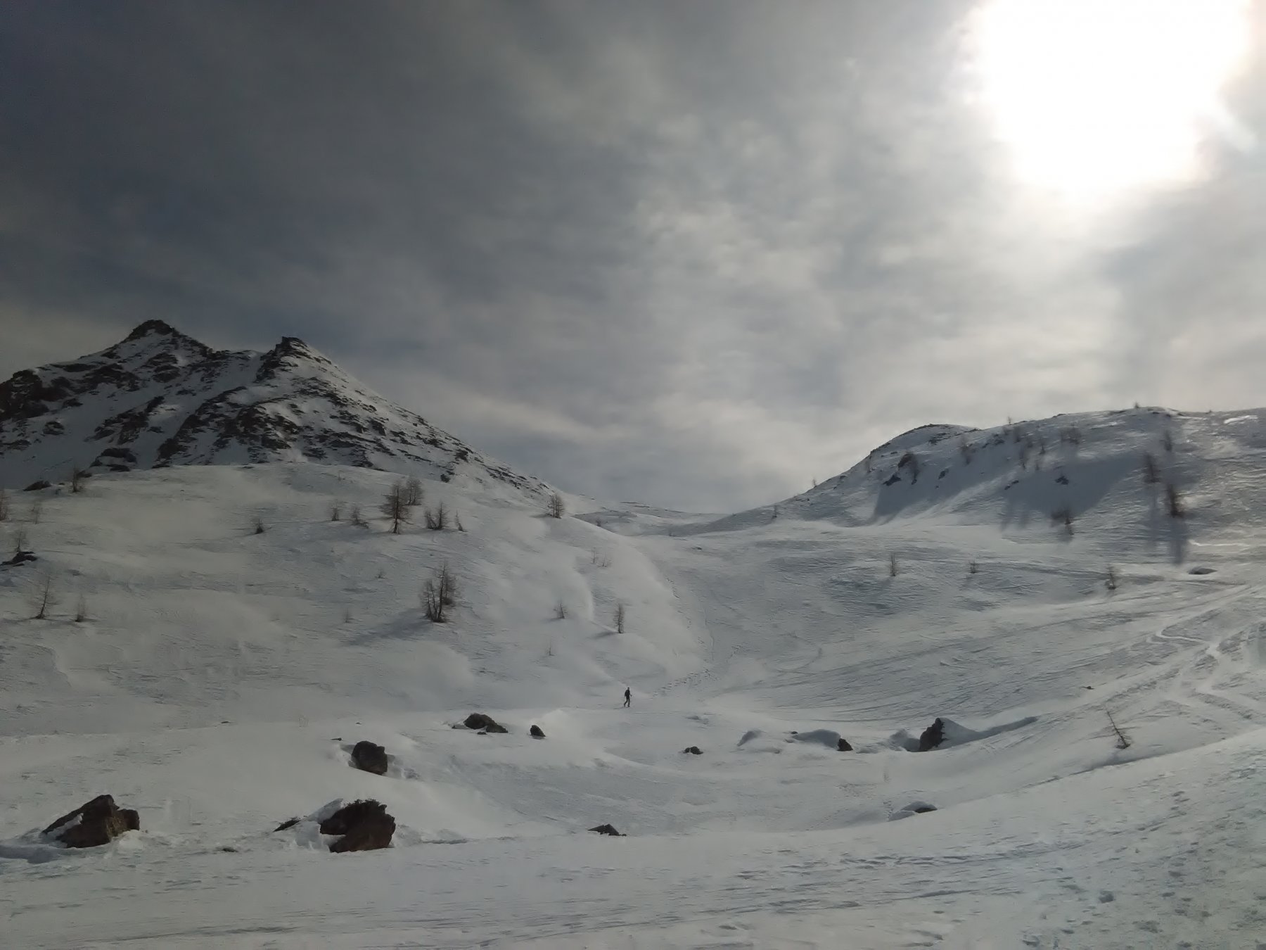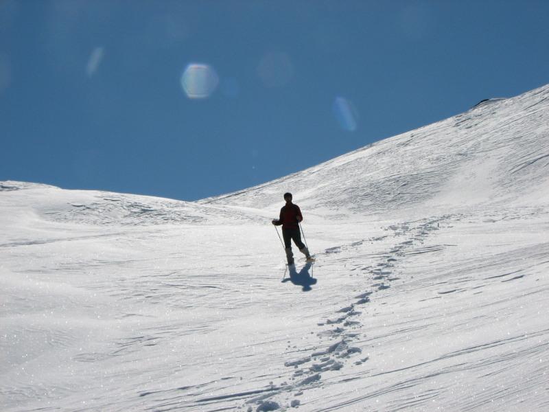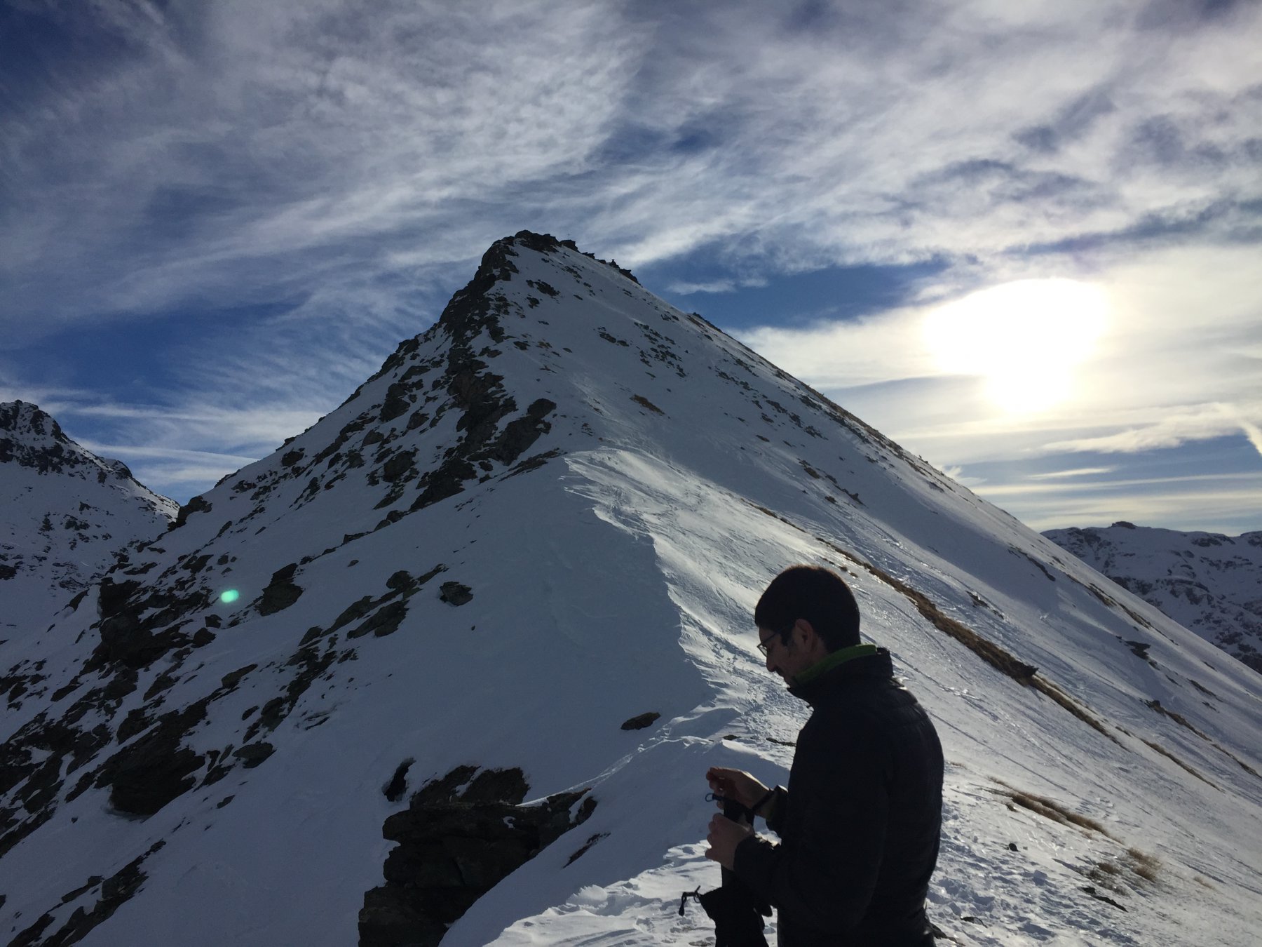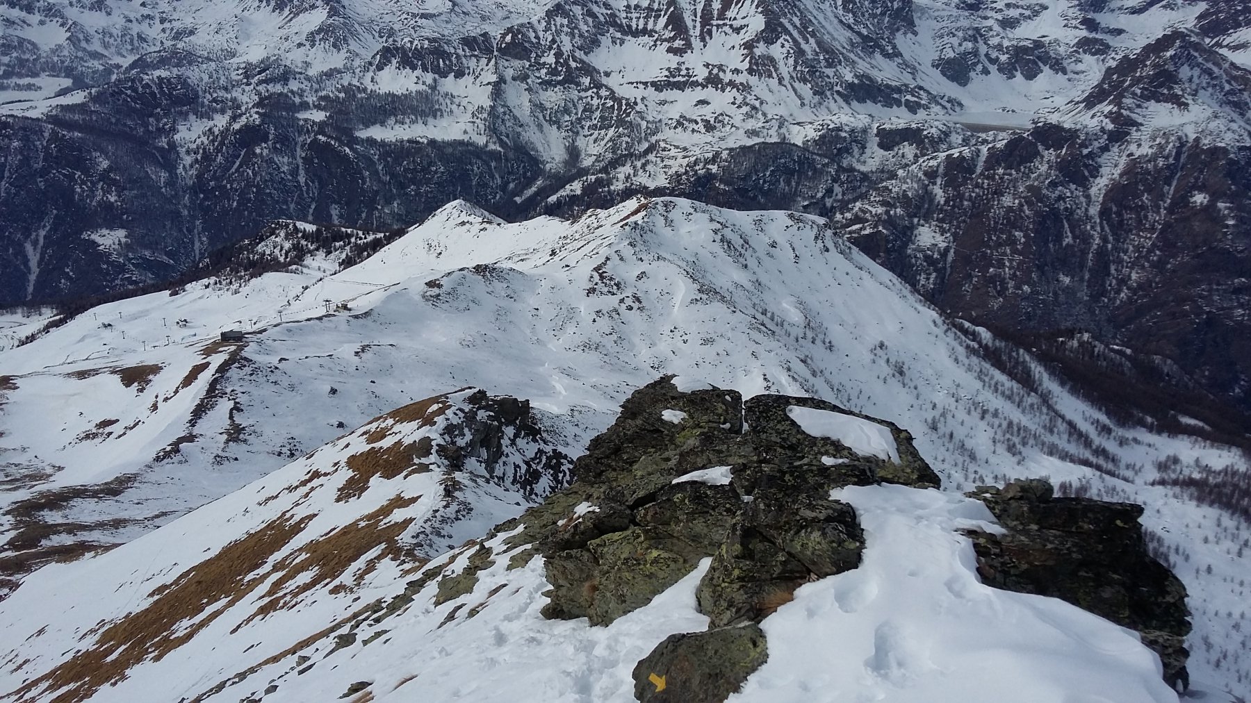 Risalire il pendio, raggiungendo la spalletta superiore, quindi mantendosi sul versante SO raggiungere la cresta rocciosa che con percorso panoramico porta in vetta alla Punta Falinere. Discesa per il percorso di andata. Gli ultimi 60m sotto la cima non sono ciaspolabili e potrebbero richiedere l’uso dei ramponi.