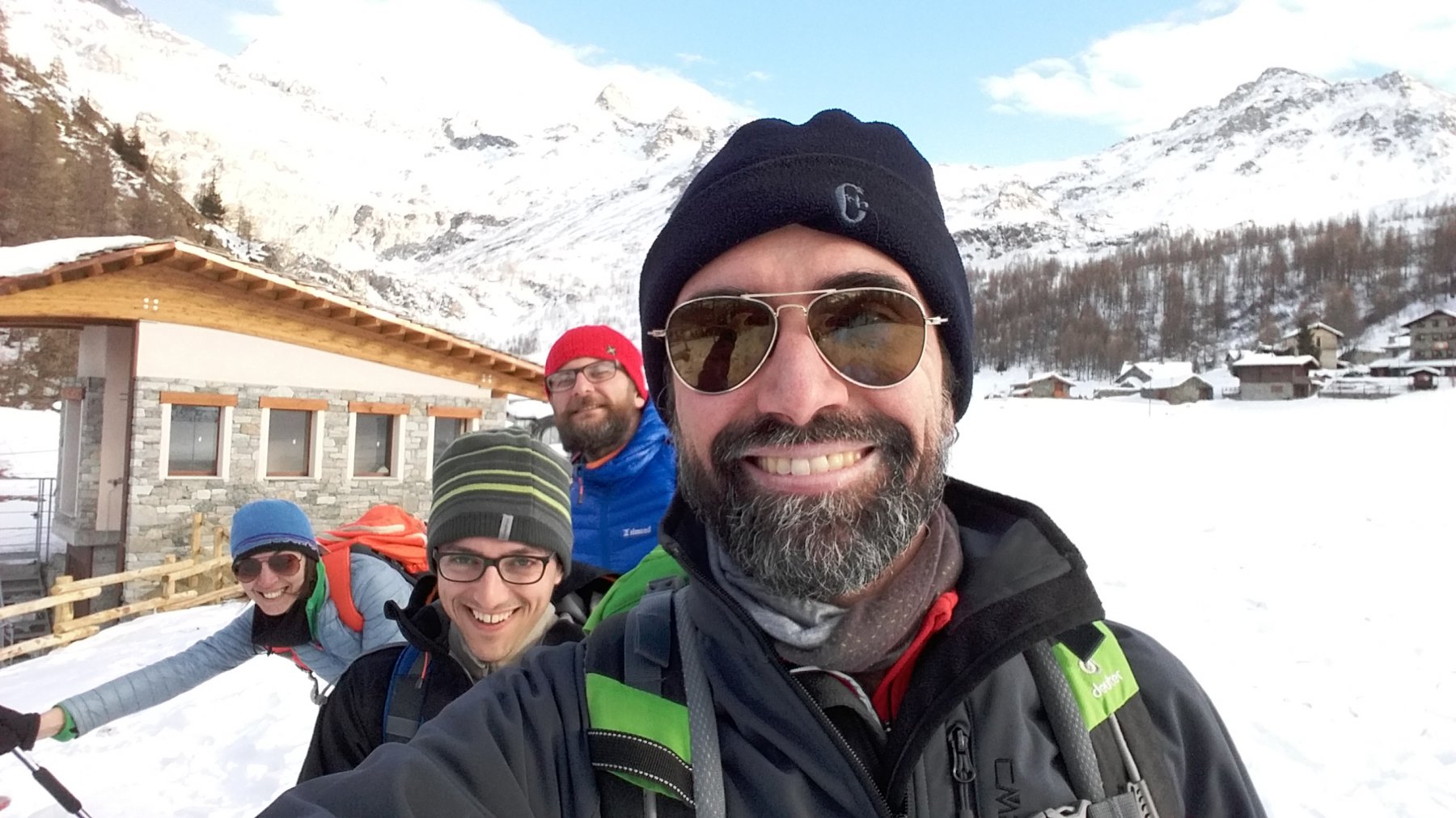 Partiti per raggiungere solo il santuario di clavalitè, data la brevità della gita (1h circa fino a lì) abbiamo deciso di proseguire. Le ciaspole si usano dalla macchina fino appunto al santuario: dopo sono inutili, la cresta è quasi del tutto pelata e il pendio più ripido (fino alla spalletta prima della cima) totalmente privo di neve. Per l’ultimo tratto consiglio di portarsi dietro almeno i ramponcini da escursionismo: la neve è ben tracciata ma, se dovesse fare più freddo di ieri, potrebbe nascondere qualche insidia. Io non li avevo e sono salito lo stesso, ma in qualche punto non mi sarebbero dispiaciuti…giornata meravigliosa, la gran becca sempre a sorvegliarci. Con Federico, Felice e Gabriella.