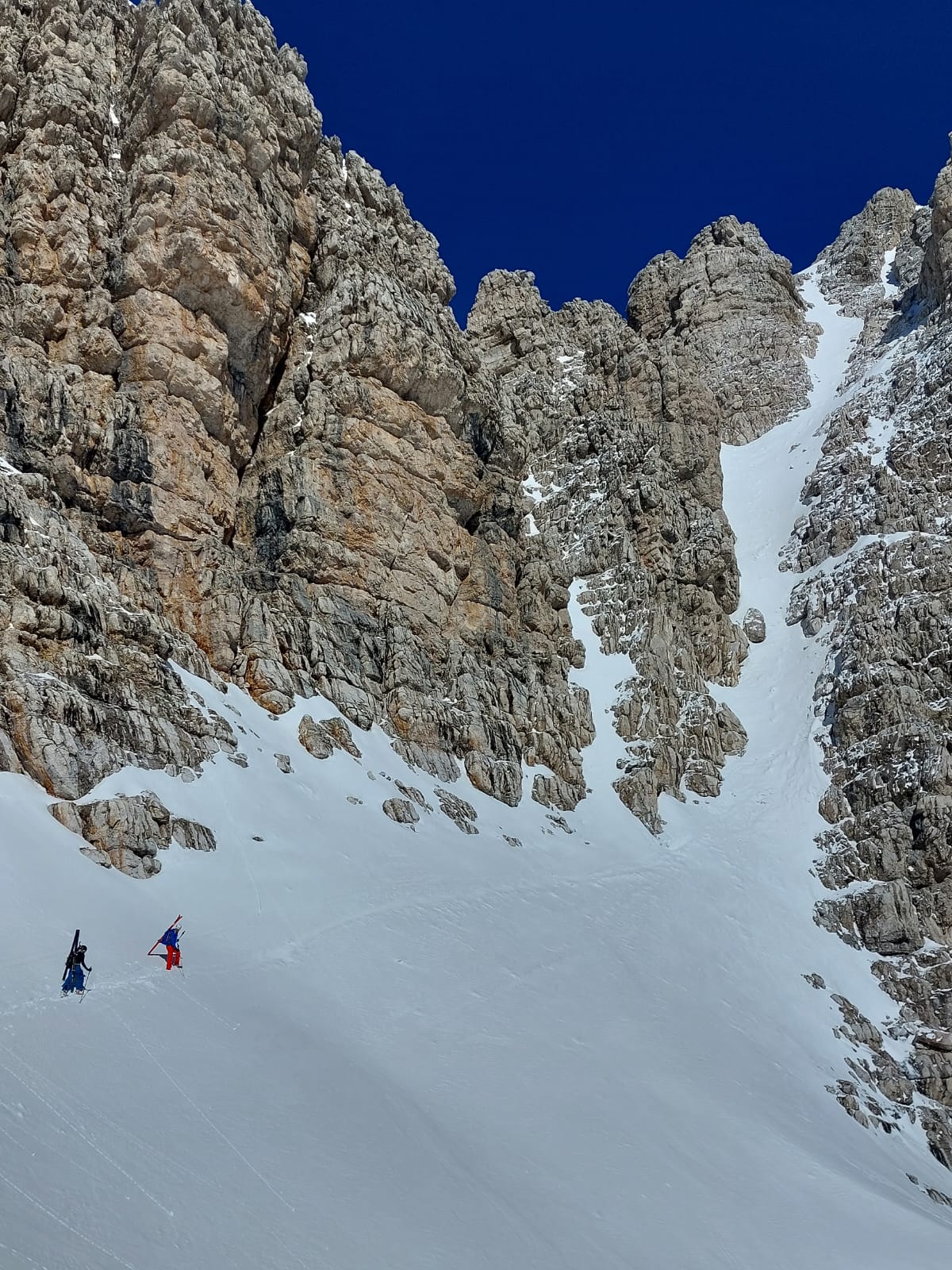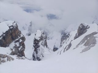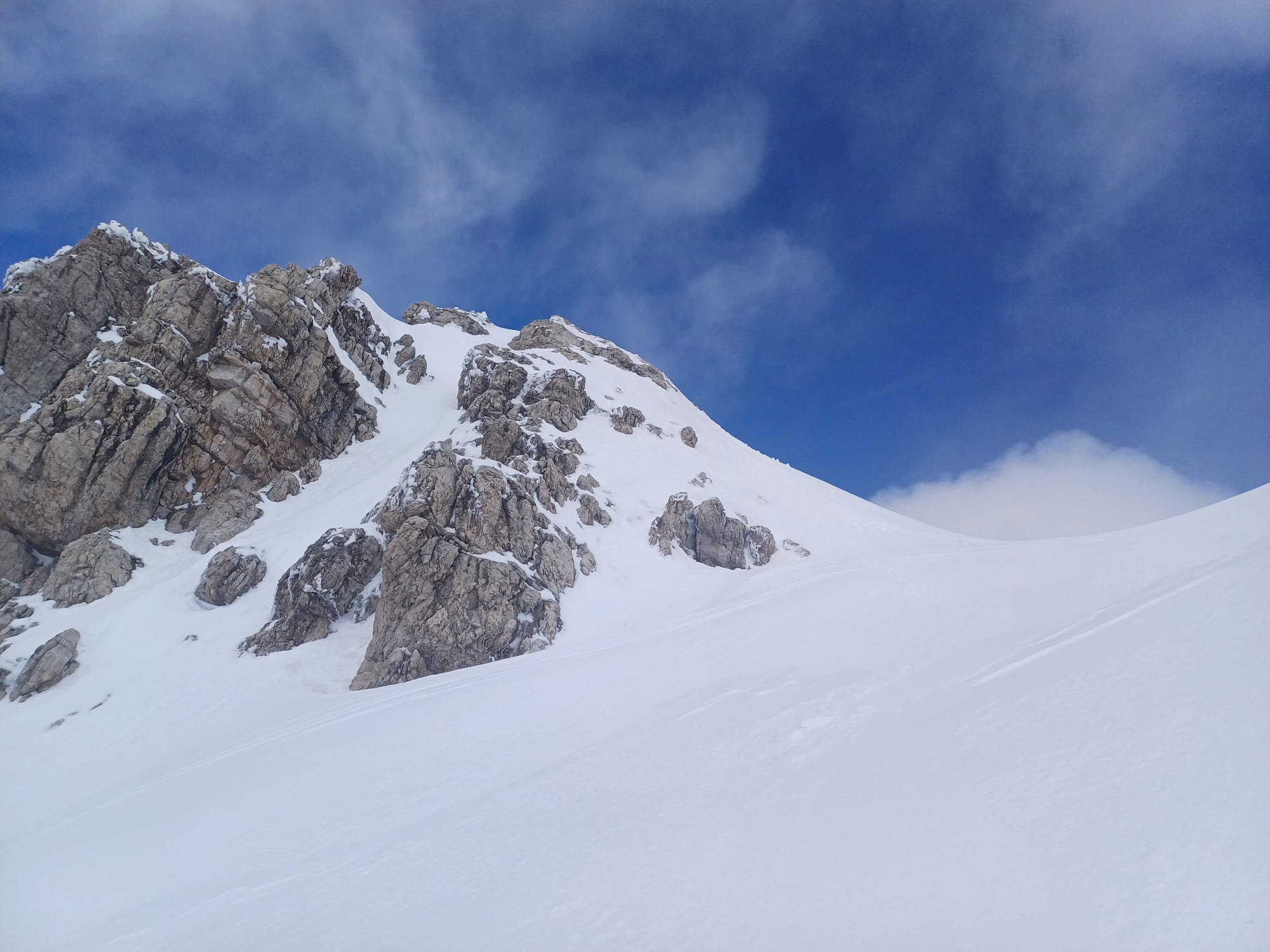 Da li si effettua un traverso dove appare evidente il secondo canale che porta direttamente in cima. Ultimi metri su facili roccette.