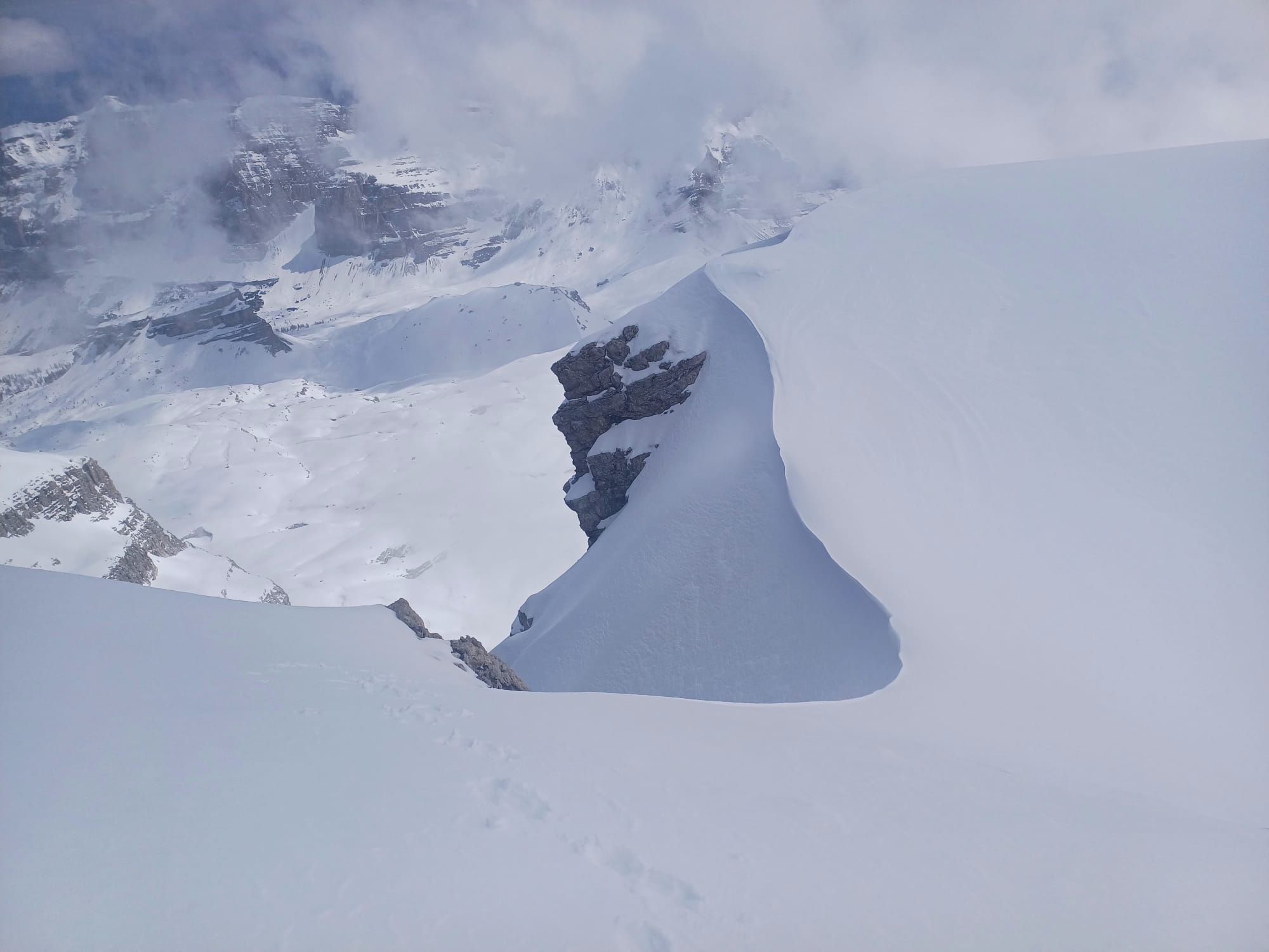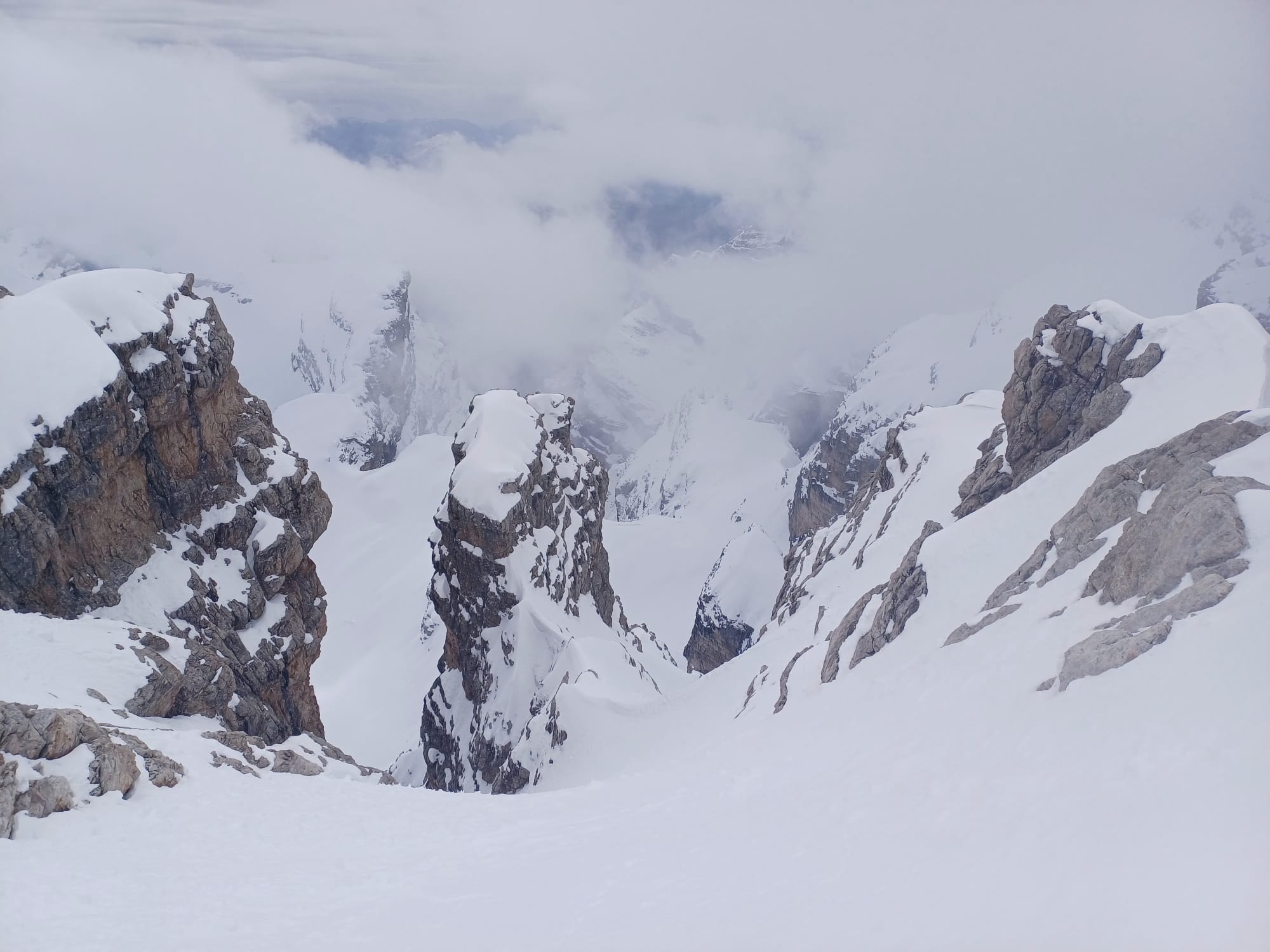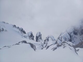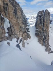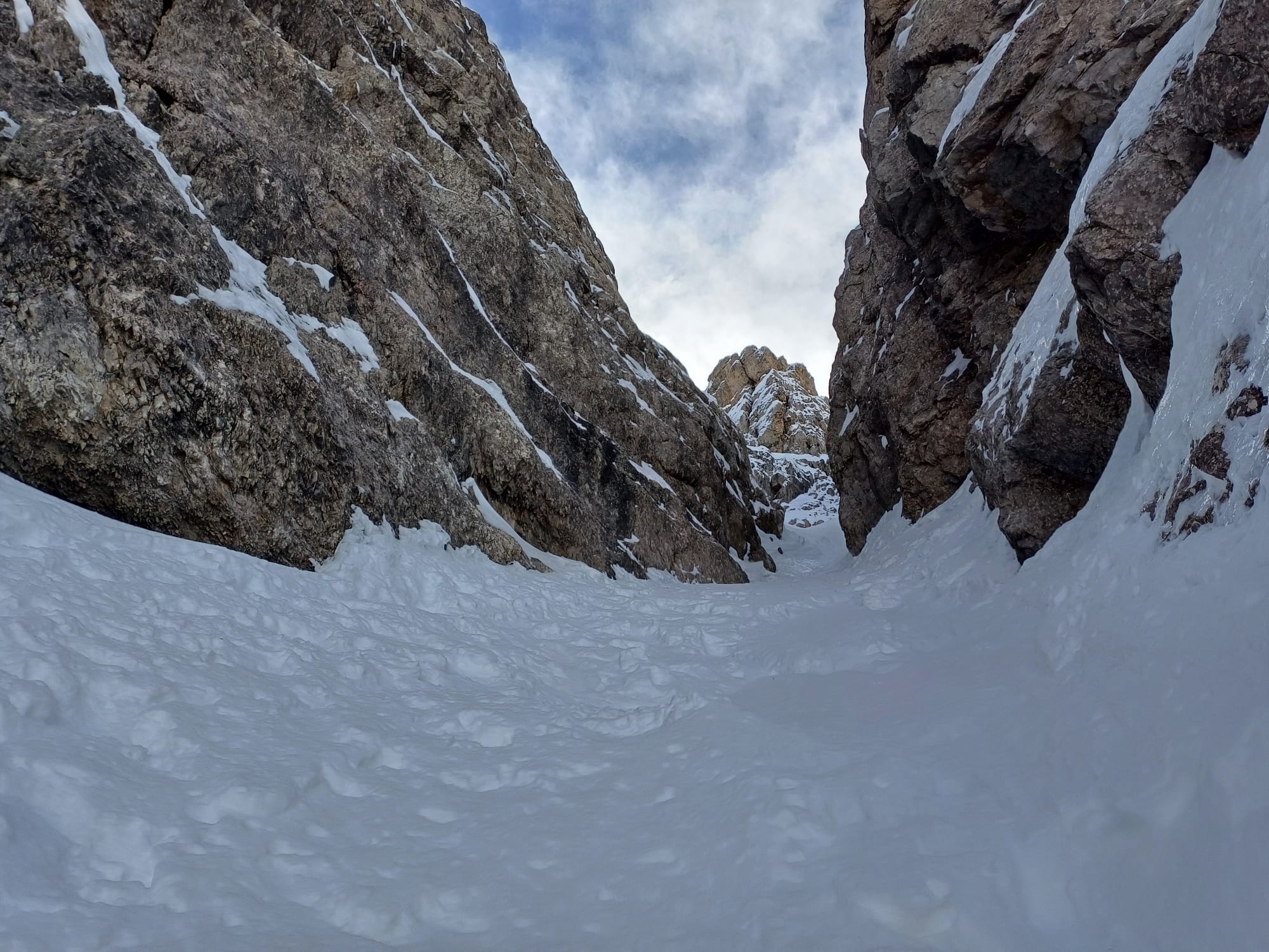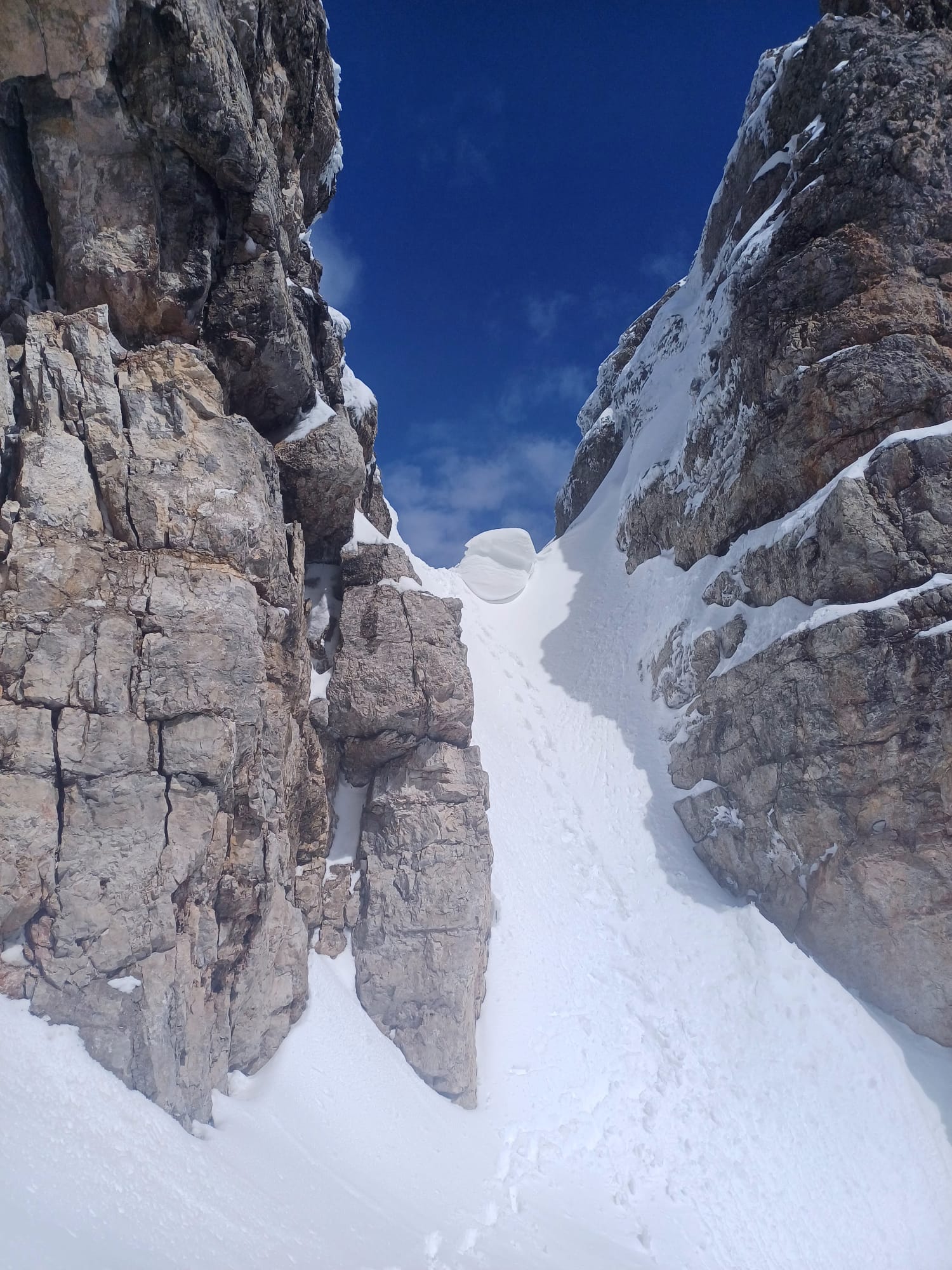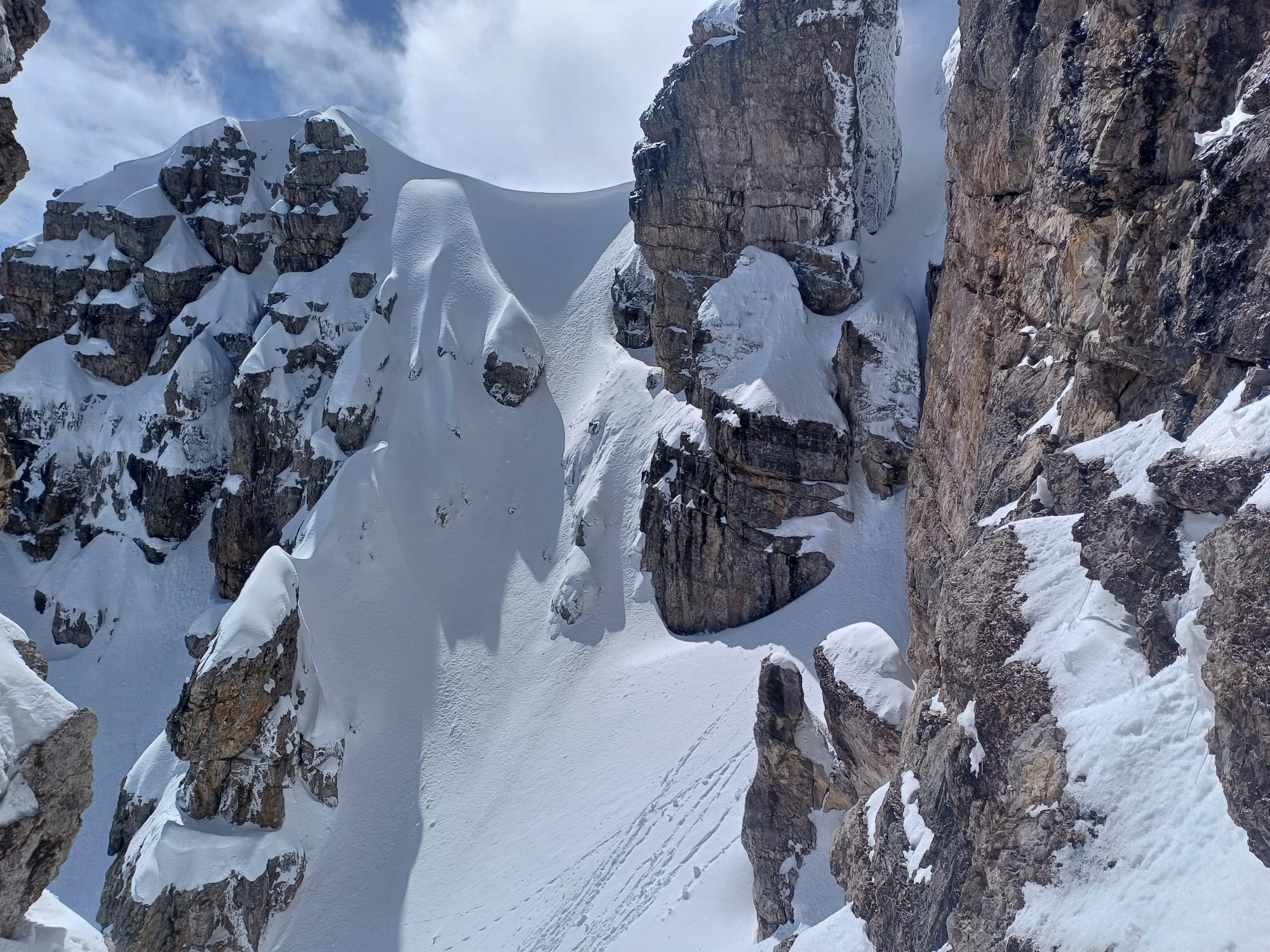 Una volta lasciata la stazione a monte della cabinovia del Grostè, risalire verso l’arrivo della seggiovia e puntare decisamente a sud in continui saliscendi lasciando alla vostra destra la cima Grostè, contornarla completamente, risalire il vallone tenendosi sulla destra (direzione bocchetta dei camosci per intenderci) per un centinaio di metri individuando a sinistra la grande cengia ascendente che porta all’imbocco del canale della cima Falkner.
