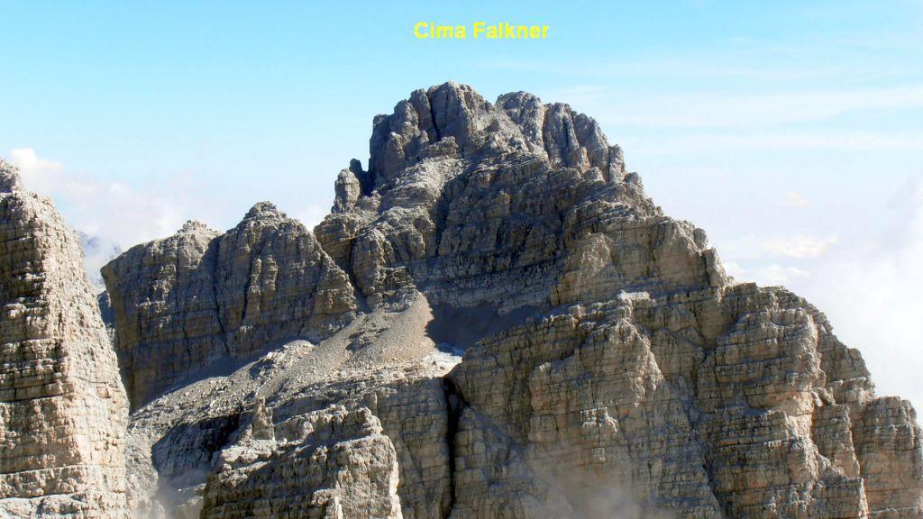 Si contorna sulla sinistra la Cima Grostè per cui percorrere lungamente una cengia attrezzata nei punti + scabrosi che segna tutto il fianco orientale di Cima Falkner. Giunti nei pressi del punto + alto del Sentiero Benini (quota 2910), si può raggiungere la vetta di Cima Falkner in 15′ mediante un facile canalone e alcune roccette elementari. (scritta sulla roccia, ometti).
