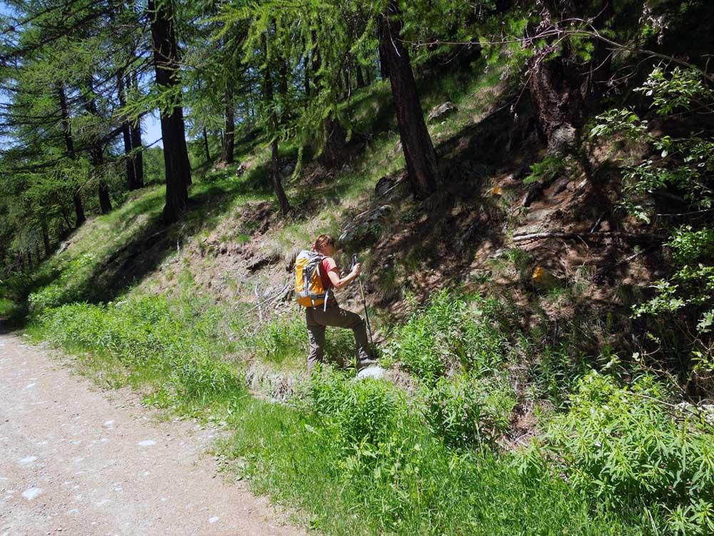 Sterrate e sentieri puliti sino al lago dove si stanno ultimando i lavori di costruzione del muretto di contenimento dell’emissario. L’inizio del sentiero 8A, che si stacca dalla poderale (quota 1845 m), si trova a pochi minuti dal ponte di una cascatella ed è segnalato da due bolli gialli su sassi poco visibili (abbiamo messo un ometto sul ciglio della strada); anche se lo si oltrepassa si raggiunge comunque l’alpe Morgnoz continuando sulla strada e salendo poi per prati. Da qui in poi la segnaletica è ben visibile.