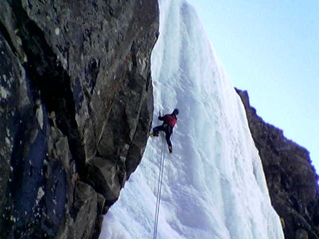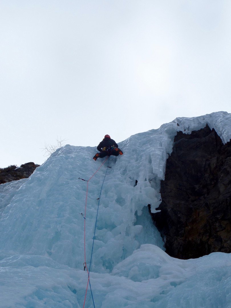 Il colonnato si può salire centralmente 30 m 85/90° oppure all’estrema dx (vicino alla roccia), stesse difficoltà ma meno estetico, entrambe le soluzioni sono di grande soddisfazione.
