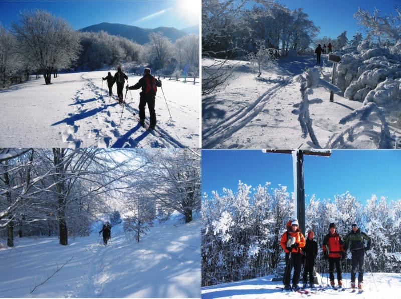 Partiti sci ai piedi dal tornante q. 863, tagliando diverse volte la strada Fonte Borlotto. Ci siamo poi alzati seguendo grosso modo il segnavia 16 ma perdendolo più volte per i tronchi intonsi di neve ghiacciata. Da fiaba la parte alta stracolma di neve, ma tutto l’itinerario è stato fantastico con tantissima neve sul terreno e la galaverna sui boschi. Grandiosa discesa nella neve farinosa dei ripidi pendii del grandioso bosco di faggi secolari e simpatico il ritorno lungol a strada e i tagli fino alle auto.