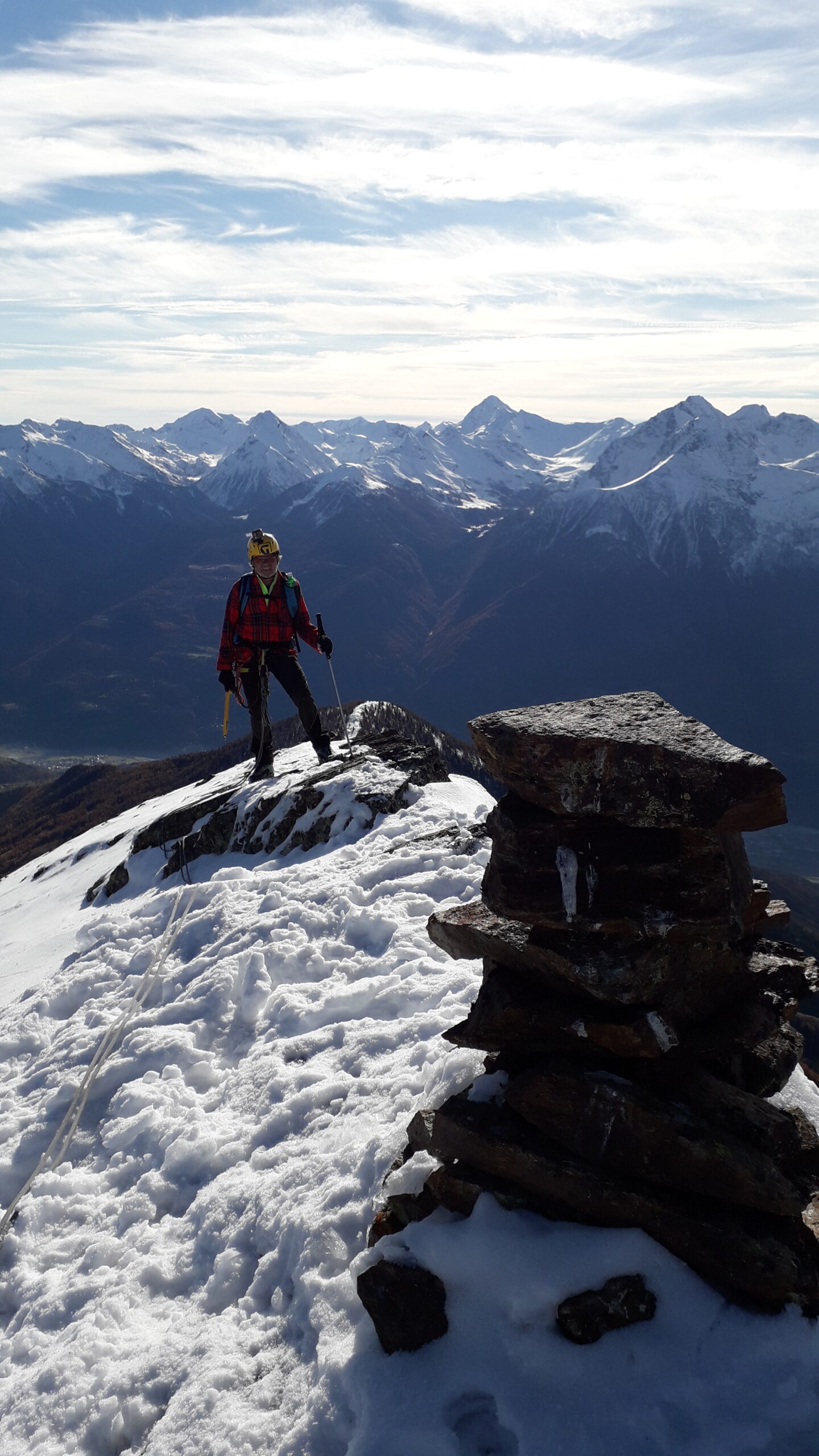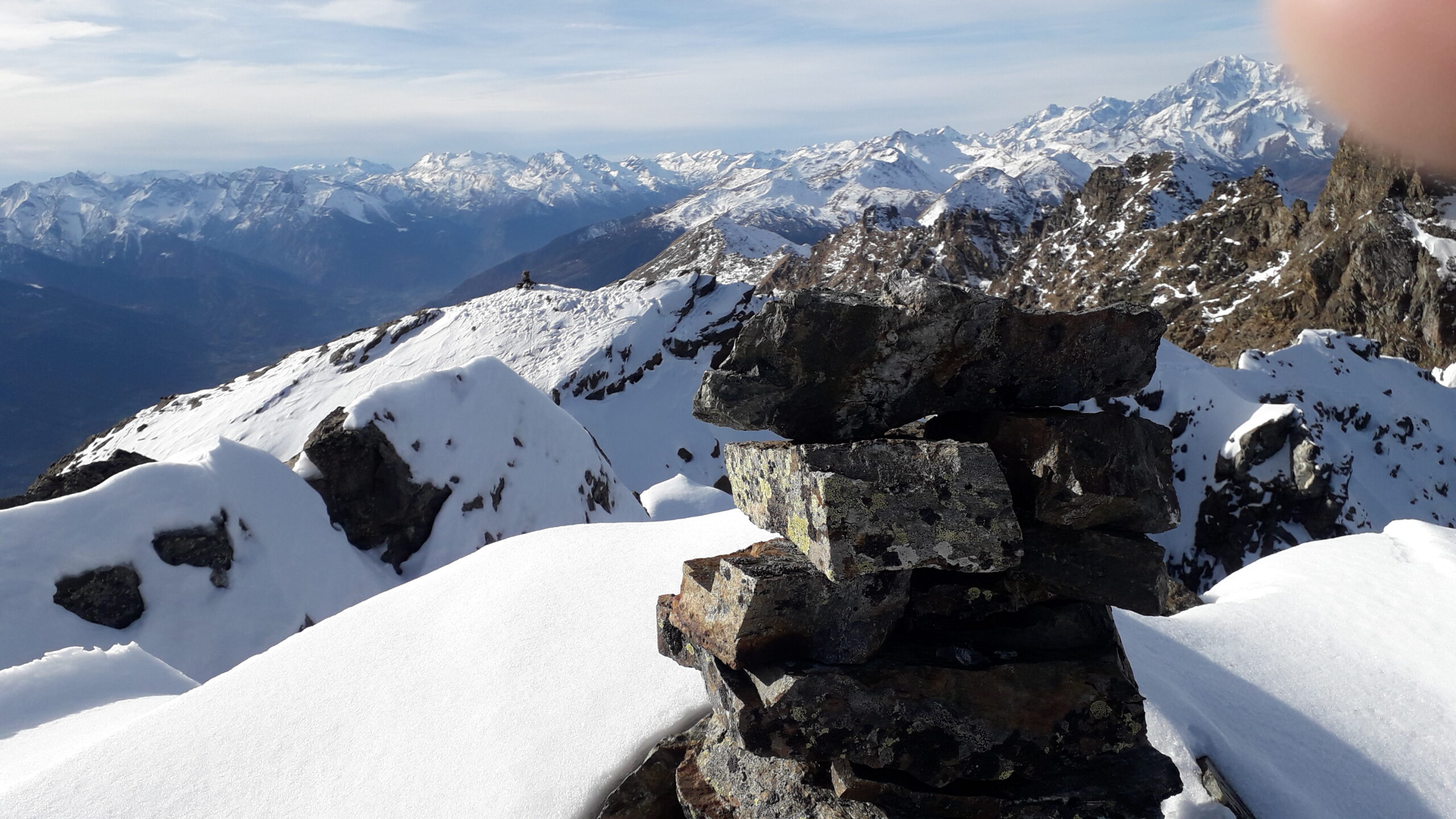 Punto massimo di soli pochi metri piu’ alto dell’anticima e di poco piu’ spostato a est, ma il salto da superare dovendo perdere dislivello per raggiungerne l’attacco, e’ di una 40ina di metri effettivi.