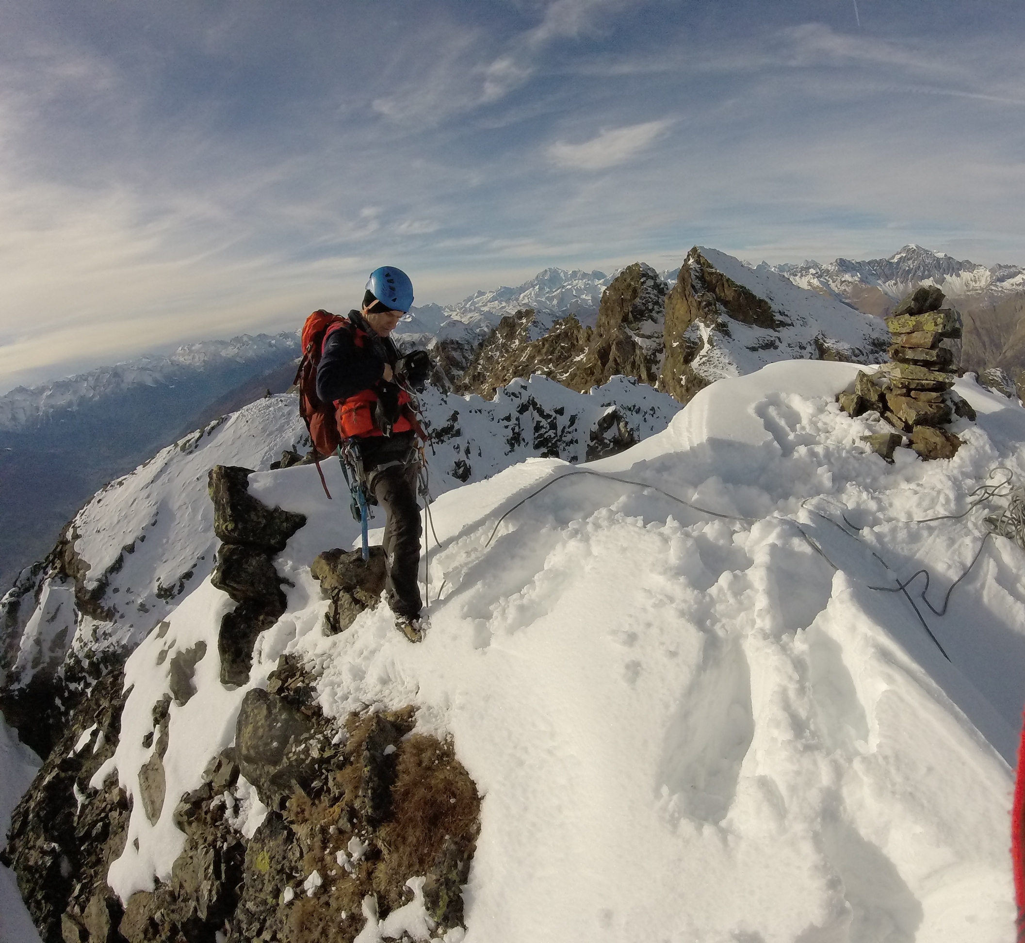come già descritto da Enzo,la mtb sarebbe di grande aiuto, io ci avevo pensato ma lui preferisce di gran lunga camminare, dal vallone di Senevè si raggiunge facilmente la quota 2540 poi all’inizio delle roccette ci siamo spostati a sx verso le punte del Tsaat a l’Ezeina a SW per canaloni annevati mai banali sino a tornare sulla cresta a pochi metri della punta occidentale,utili i ramponi. scesi una trentina di mt a E risaliti con un passaggio di III poi aggirando a dx su cengie esposte in poco tempo si giunge sulla punta centrale 2591.