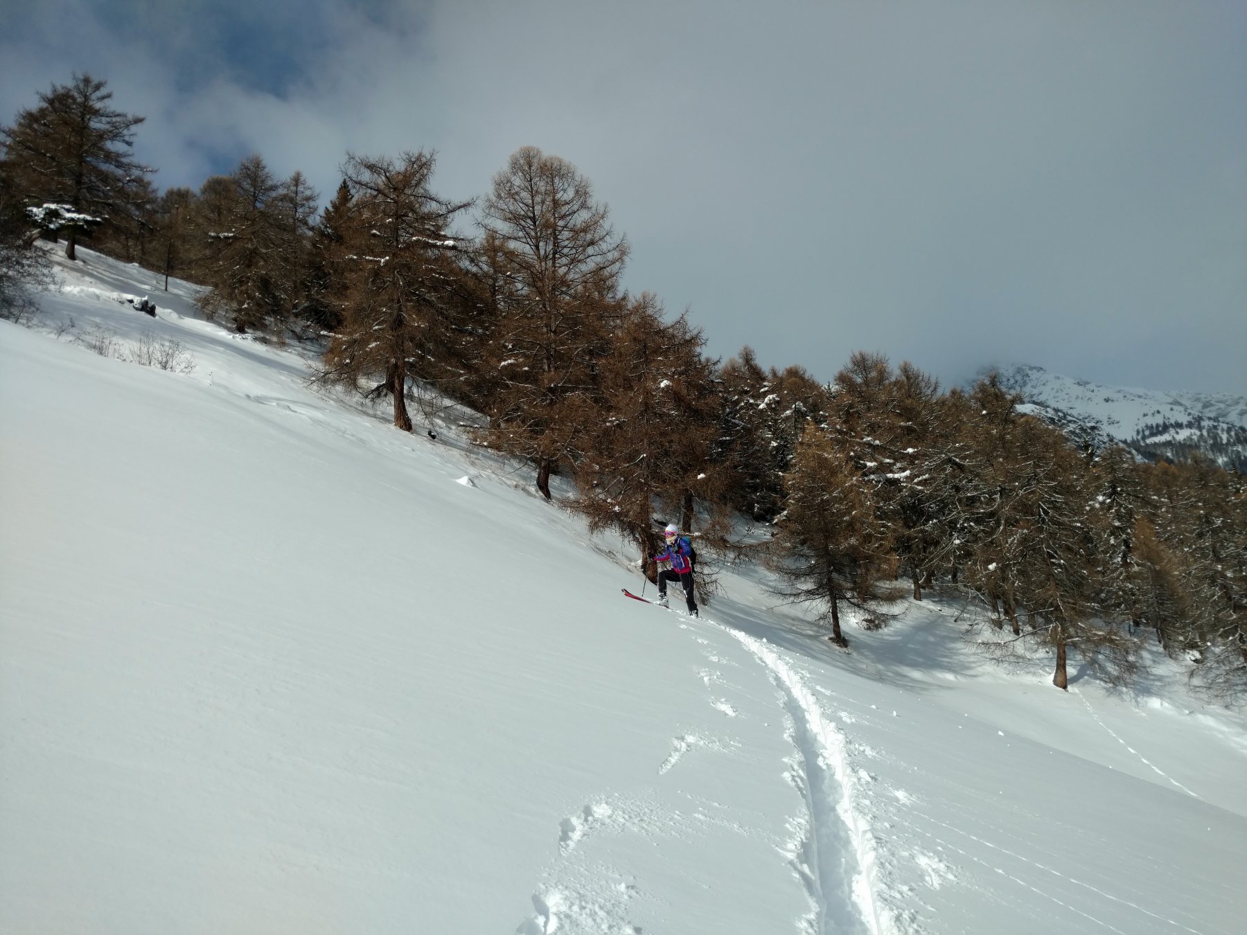 40 cm circa di neve fresca che diventano anche 50 in alto ma non bastano purtroppo, manca il fondo la neve è polverosa da 5 stelle ma si tocca soprattutto nel bosco…comunque partiti da fonteil facendo traccia sulla poderale nel vallone per poi risalire i prati da alpeggio nouva passando al rudere di premoud e poi sentiero estivo sino in vetta. Paesaggio da cartolina oggi sempre bella gitarella….come già detto il bellissimo bosco manca di fondo quindi qualche toccatina soprattutto in coda, poi migliora nei prati per poi riprendere la poderale quindi più nessun problema…