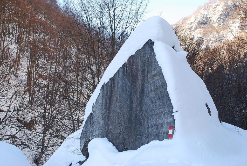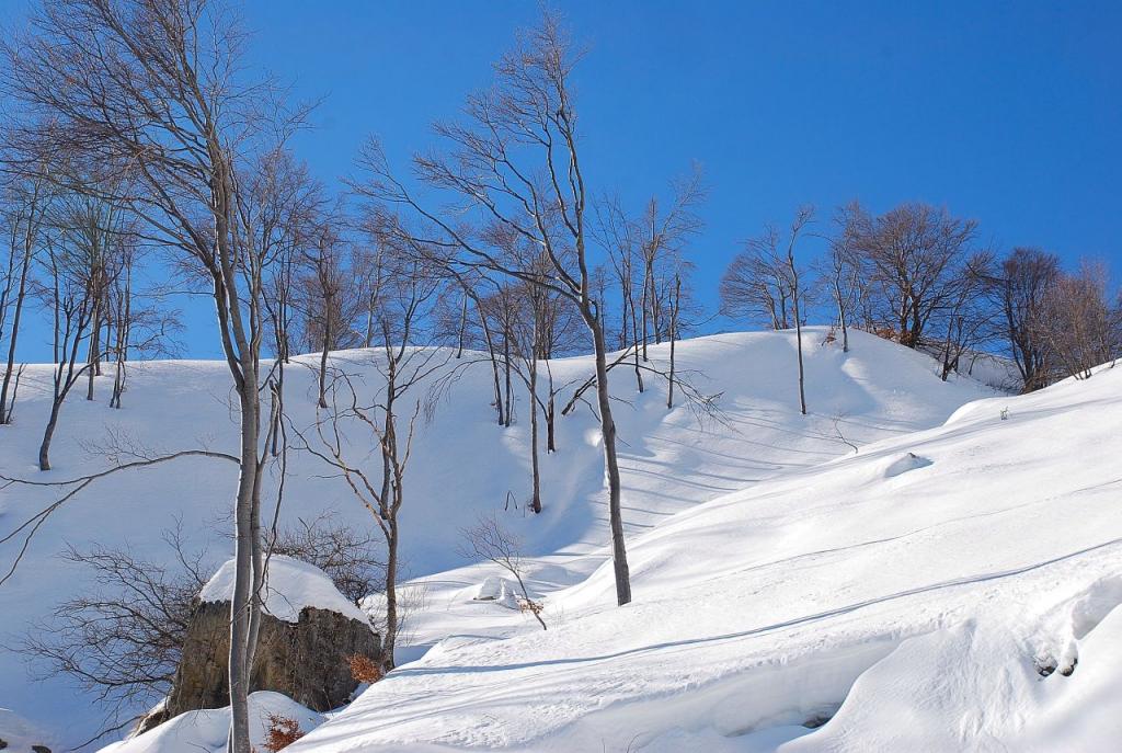 Seguiamo la traccia fatta che, ahimè, volge verso la Val Corsaglia. Da lì a 1000 m c. fino in cima facciamo la traccia (o per meglio dire, salvo qualche tratto, se la smazza il nostro Paolino). A Stalla Buorch c’è il passaggio del torrente, che è sicuramente il tratto più impegnativo della gita. In 2 lo passano sullo pseudo-ponte, io invece passo di sotto e guado il fiume su pietre scivolose, ma ne esco indenne (lo stesso anche al ritorno). Si fa la pista con 40-50 cm di neve fresca. Solitudine totale. Arrivati alla Sella della Brignola ci dirigiamo verso il passaggio tra le rocce, sbucando poi sulla bella cresta dove ci sono larici secolari. 10 m. sotto la punta lasciamo gli sci e in breve in cima. In discesa riusciamo a scendere alla sella con gli sci ai piedi e un po’ di attenzione alle placche rocciose. Poi un traverso verso il Lusco a prendere tutte le pendenze che sono orientate a N ( in quelle orientate a S si è formata già la crosta). Vista l’abbondanza di neve, scendiamo i tratti più ripidi riuscendo anche a curvare. Più in basso la neve è più leggera anche se abbondante. Scendiamo un canale da favola e i pendii sottostanti sino a riprendere la traccia fatta sulla stradina e da lì senza problemi alla partenza (guado a parte!)