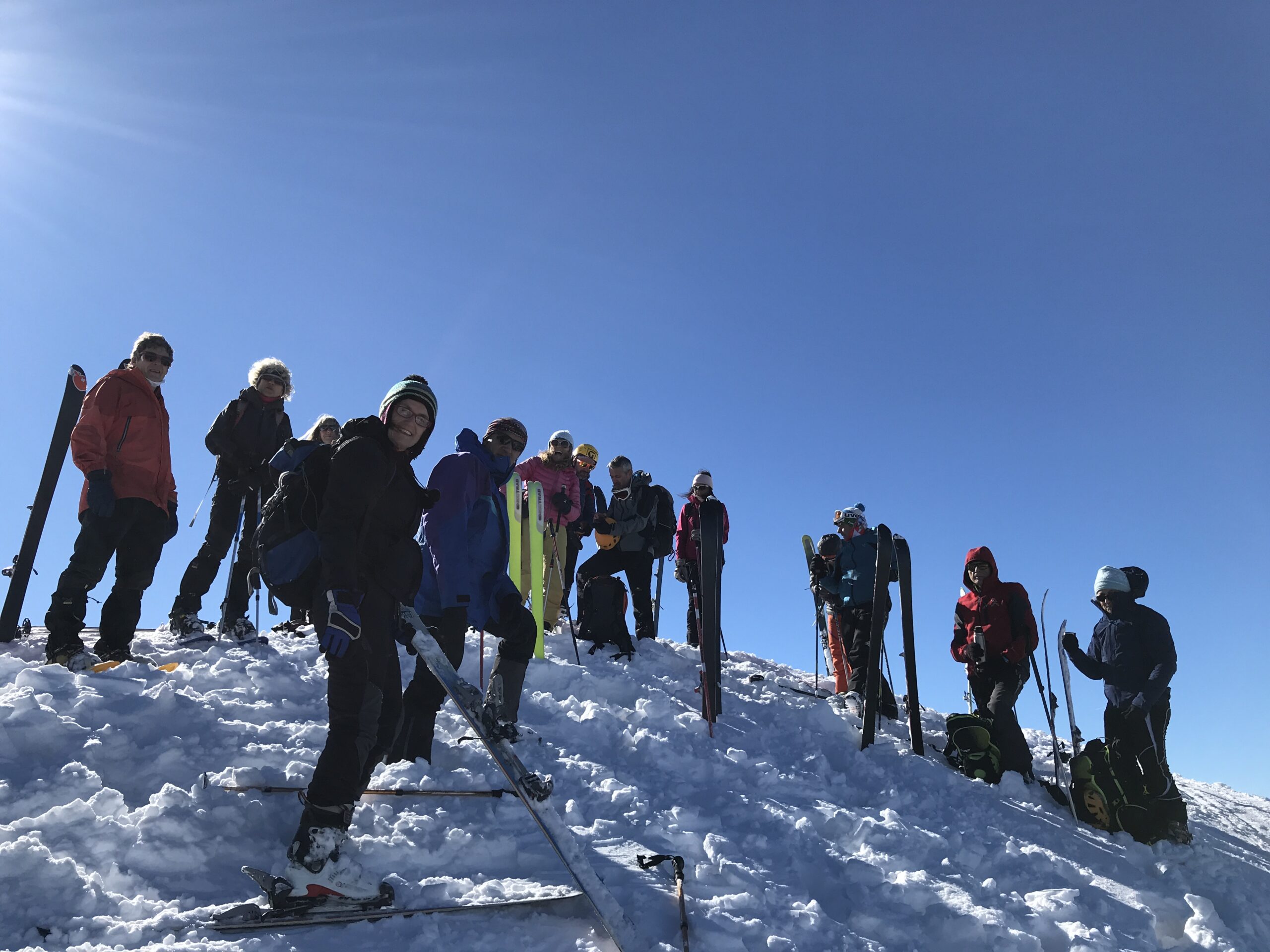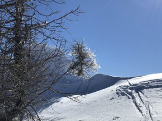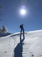 Giornata, in barba al meteo che dava vento, strepitosa -3 alla partenza, due dita di neve polverosa in basso 15/20 in alto in ambiente immacolato, fatto traccia ben diretta, visto piccoli accumuli nelle valletti sottovento e cornici belle cariche ed insidiose, discesa nella parte alta ” commovente” come dice il buon Ettore….per 500 metri con esposizione nord pieno, in basso zone di primaverile sempre ben sciabili, oggi noi solito gruppone un po casinista e tre ragazzi Liguri che salutiamo ( non abbiamo trovato gli occhiali ) e forse abbiamo lasciato al parcheggio un paio di racchette…..la parte alta meritava 5 stelle ….in basso 3 buona neve a tutti