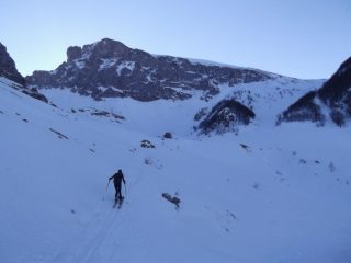 salendo dai paravalanghe (ambiente meno bello che dal vallone)pensavo peggio. In realtà abbiamo trovato neve sempre abbastanza sciabile evitando i profondi solchi di chi è sceso nei giorni precedenti.