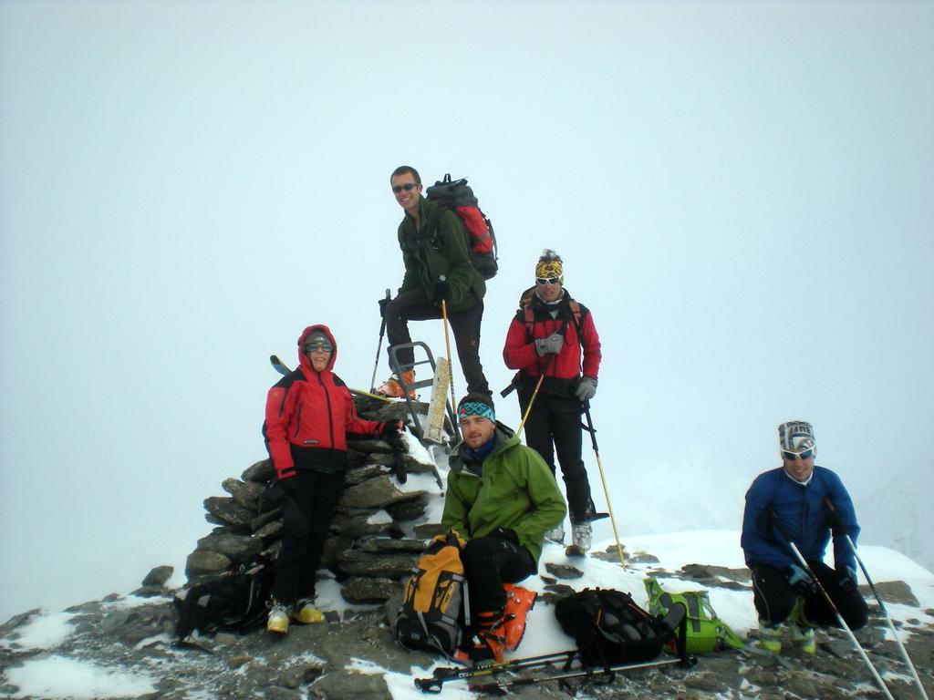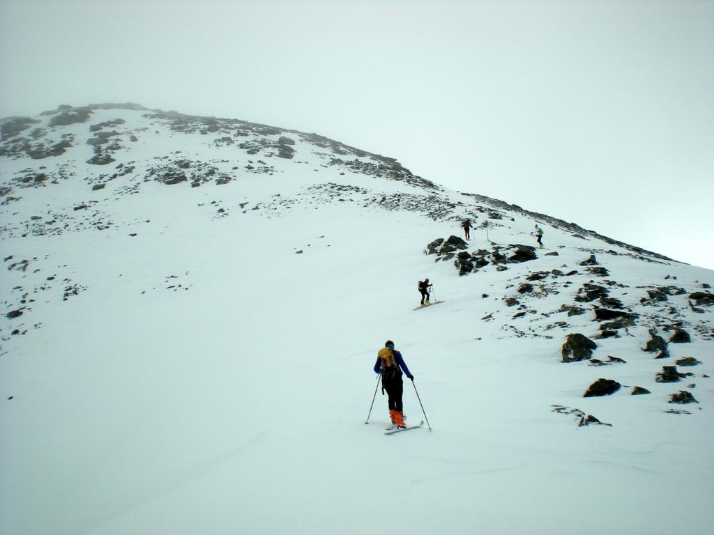 Qualche bel passaggio di dry-skiing ci porta in vetta ma in vetta in vetta, il vento molto forte non ci fa cincischiare, scendiamo rapidamente in stretti canalini verso il fondovalle.