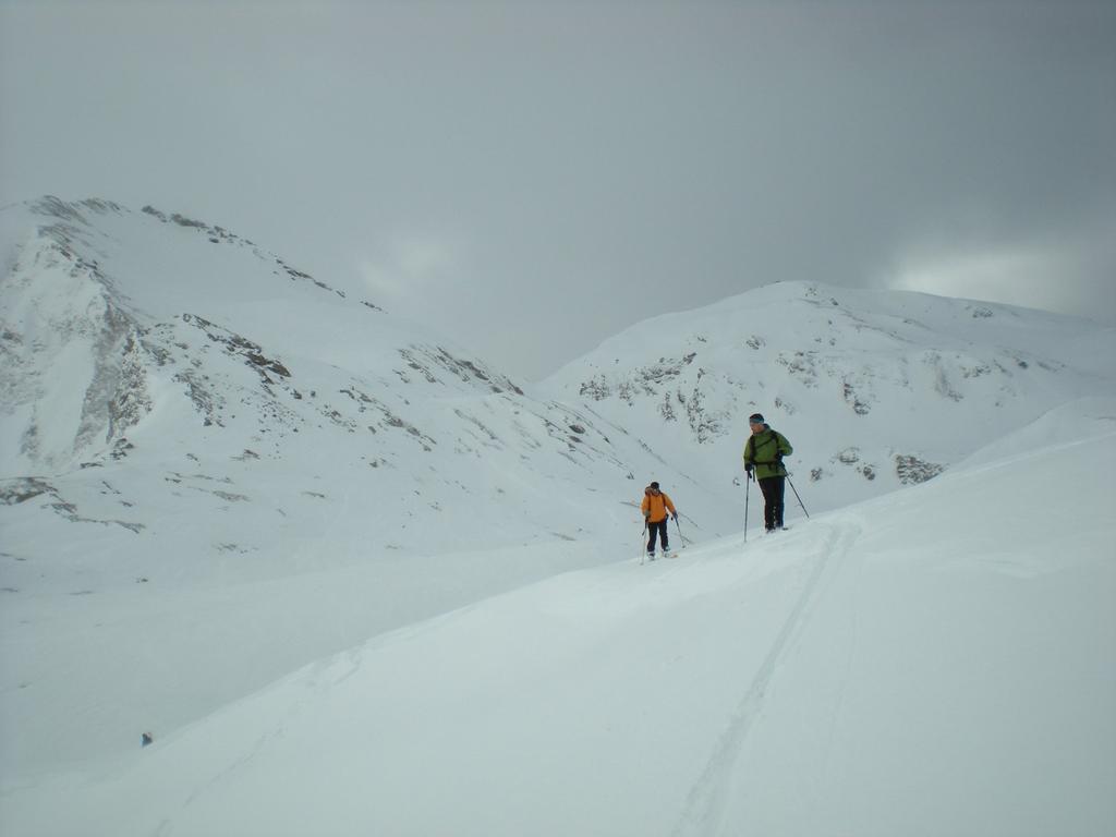 Ci si rifocilla, si scende nel canale a destra, farina leggermente ventata, poi scendendo peggiora un pochettino; intanto il vento inizia a crescere.