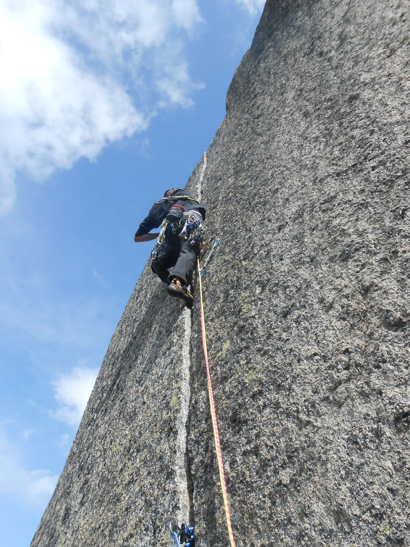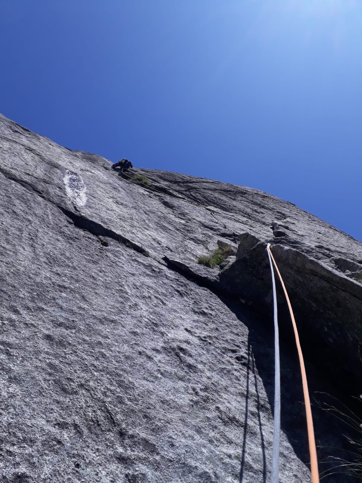 La via è del 1985 ma è stata recentemente richiodata sia alle soste che sui tiri con fix del 10. Itinerario molto bello con incredibili fessure nette da incastro di mano e piedi, tranne la prima di 6c+ che ha una partenza laboriosa e faticosa in dùlfer sbilanciante che migliora un po via via che si sale. Ambiente super con panorama affascinante. Il granito è di ottima qualità. Tutte le soste hanno 2 fix del 10 con anelli di calata. Divertimento e ingaggio assicurato.