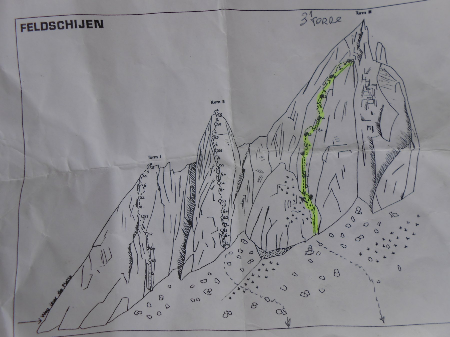 A circa 2350 m di quota, abbandonare il sentiero traversando decisamente verso sinistra, traversare "a vista" il torrente, poi sempre traversando in leggera salita per morena e blocchi di roccia puntare alla 3a torre in corrispondenza dell'evidente diedro chiuso da tetto che individua approssimativamente la posizione di partenza.