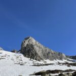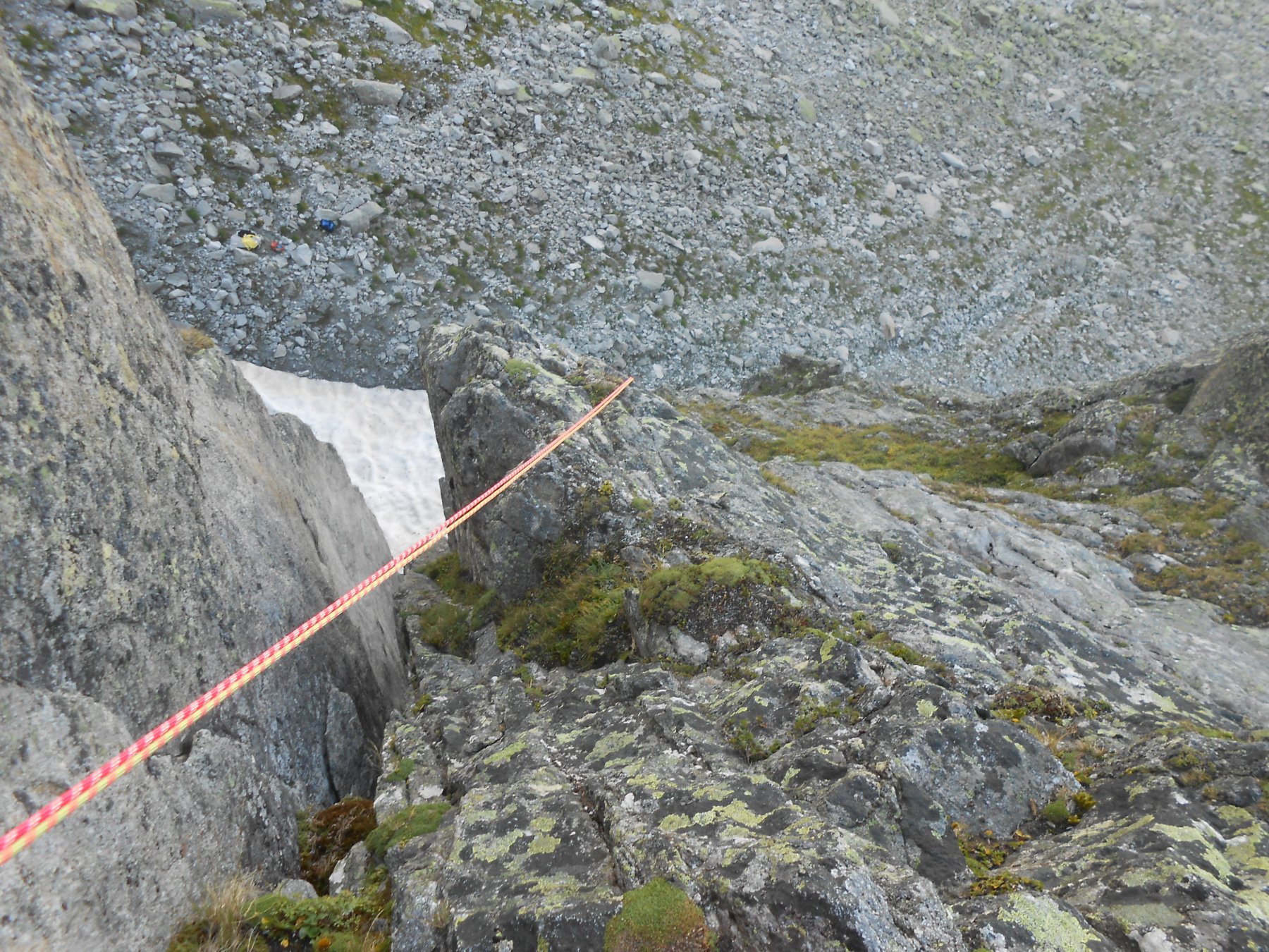 b) nuova sosta sulla cengia attrezzata per calata: da questa la prima doppia 50 m diagonale verso destra (viso monte), segue una seconda doppia 35 m a nuova sosta su cengia erbosa verso destra, e l’ultima calata 50 m che permette di saltare la scollatura del nevaio basale. In questo modo si arriva a circa 60 m di distanza sotto il camino di partenza.