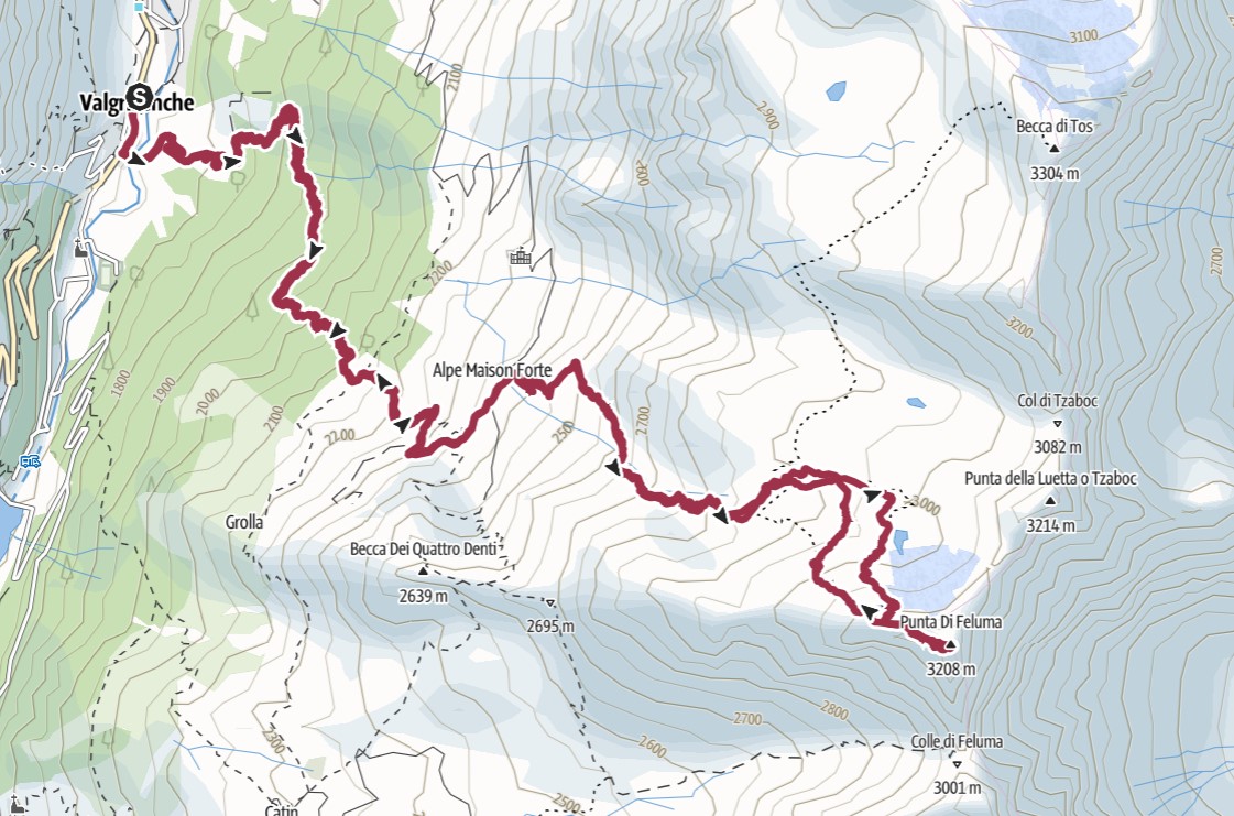 Per il resto il sentiero 6 è ben segnalato nelle deviazioni (chiare indicazioni dipinte recentemente sui massi) e salendo dal capoluogo anziché che da Plantè è ben evidente il sentiero (non indicato) da prendere dopo Maison Forte. Qui ho incontrato 5 persone che hanno tirato dritto (arrivavano lato Plantè) e poi ho visto invece salire sino ai PIani di Feluma ma non la vetta (può darsi andassero alla Tos che mi era piaciuta molto di più).