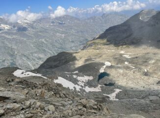 in vetta ci sono arrivato ma torno col dubbio di quale sia il percorso migliore per arrivarci. In salita ho seguito il percorso di climbandtrek passando dal laghetto perché si sale in maniera moderata ed evitando gli sfasciumi della dorsale che sono invece comodi in discesa. L’unico problema è che ci sono ancora nevai e ne ho dovuto attraversare uno (10 metri molto pendenti in cui anche i ramponcini non mi davano molto affidamento visto che era neve smollata) per arrivare alla traccia di sentiero che porta in vetta, altrimenti la salita è stata tutto sommato comoda e senza mai dover appoggiare le mani.