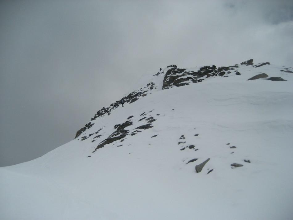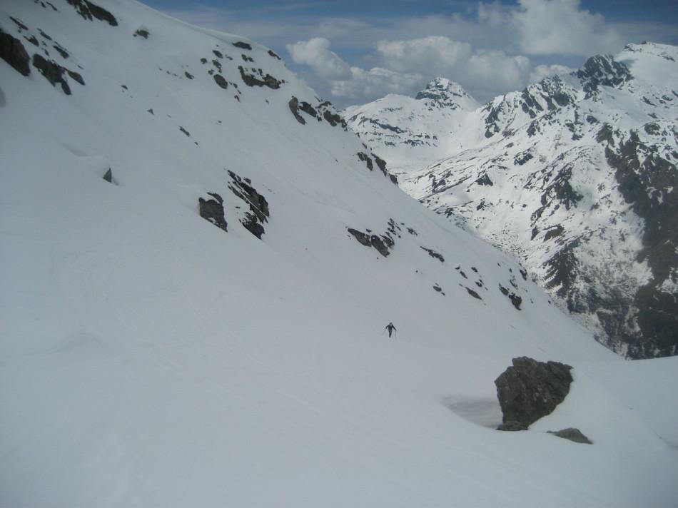 La gita (a mio avviso ottima) presenta dua aspetti distinti: la parte inferiore che richiede di superare la “boschina”, e quella soprastante che si svolge su ampi -e a tratti sostenuti- pendii. In salita abbiamo scelto il percorso con partenza dal capoluogo, ma non abbiamo azzeccato il percorso più giusto e/o agevole, e così abbiamo aumentato il “ravanamento/ravanaggio” che comunque impone questo tratto. Fuori da questa boschina, rigelo portante, utili i coltelli. Quasi a metà salita, supplemento di “ravanaggio”, questa volta imposto dal superamento di una valanga con blocchi gelati e con un fronte esteso -o perlomeno abbastanza esteso-, poi salita finalmente regolare. Questi due inconvenienti ci hanno posticipato la discesa di un’ora (almeno) e quindi bella sciata nella parte superiore, poi sotto i 2300 m circa “polenta” sempre più molle. Previsioni meteo azzeccate, soleggiato il mattino, con successiva copertura del cielo (in vetta), con nubi che si sono mantenute alte, e ritorno del sole durante la discesa. In discesa abbiamo provato il percorso di rientro verso lo sky lift, tuttavia non l’abbiamo azzeccato completamente e abbiamo aggiunto un altro tratto di “ravanamento/ravanaggio” questa volta in discesa. Nella parte inferiore l’innevamento è al limite. Nei prossimi giorni aumenterà lo “spalleggiamento”, fino ad oggi ancora contenuto a condizione di azzeccare la parte bassa giusta. Per evitare malintesi non aggiungo la valutazione “stellare”…. Tuttavia per me (e forse per noi, penso) è stato un “gitone!!…”, condiviso in sintonia con il fuoriclasse Franco F., GianPiero S. e Susanna Z..