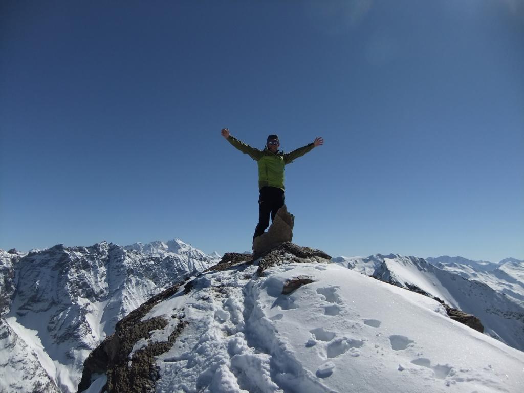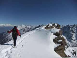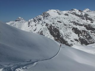 saliti per la vecchia pista e poi poderale che permette di salire agevolmente ai ripiani superiori, scesi su bella neve, purtroppo da cercare visti i tantissimi passaggi in discesa dell’eliski dei giorni precedenti.