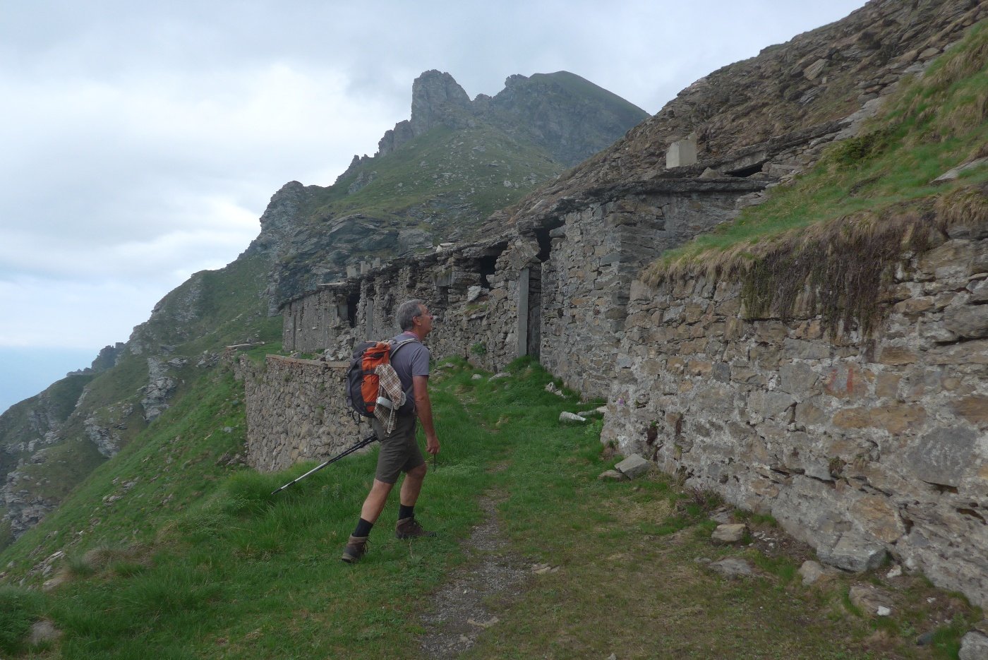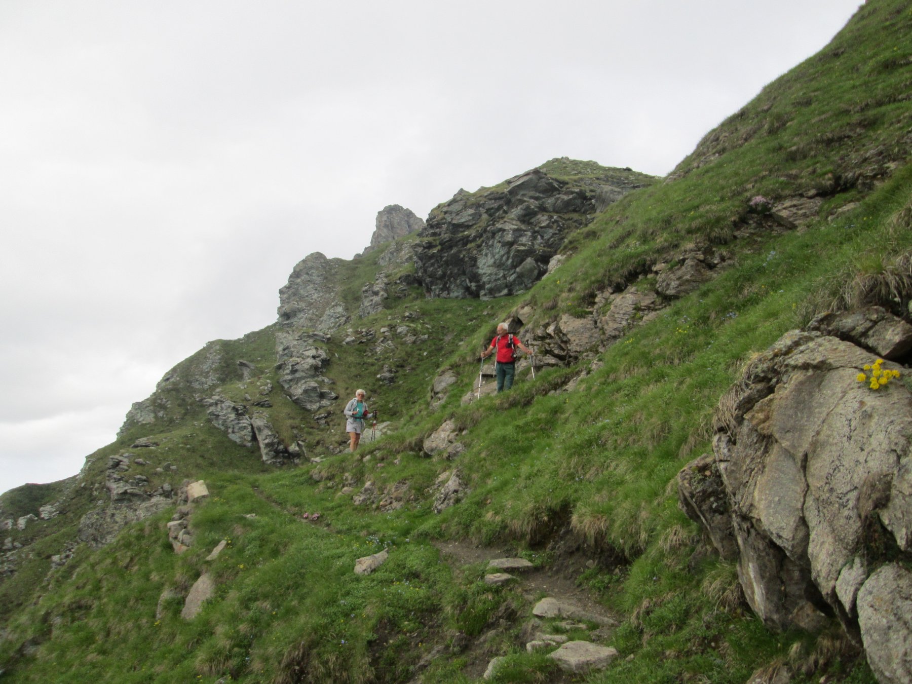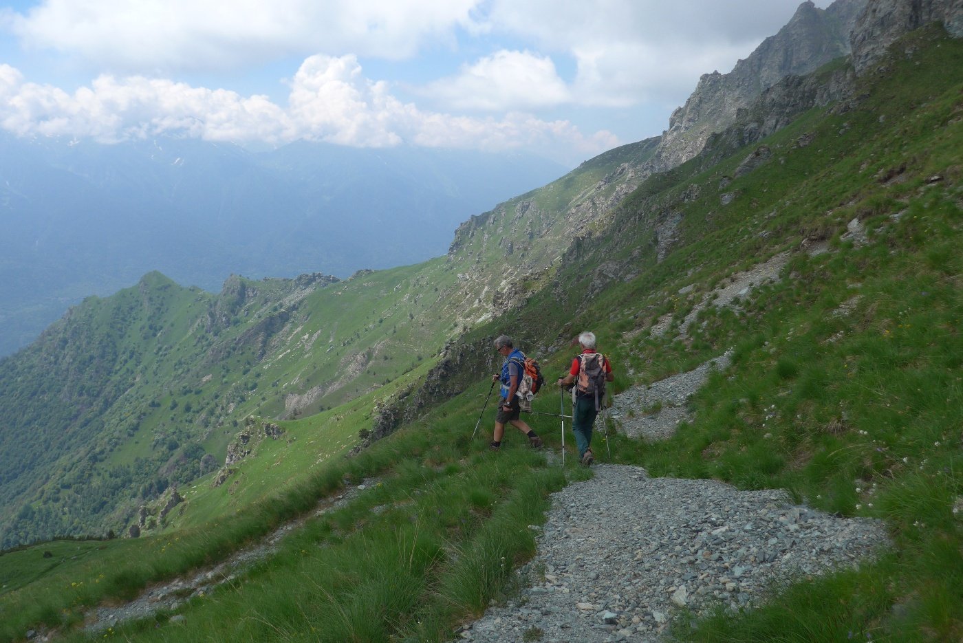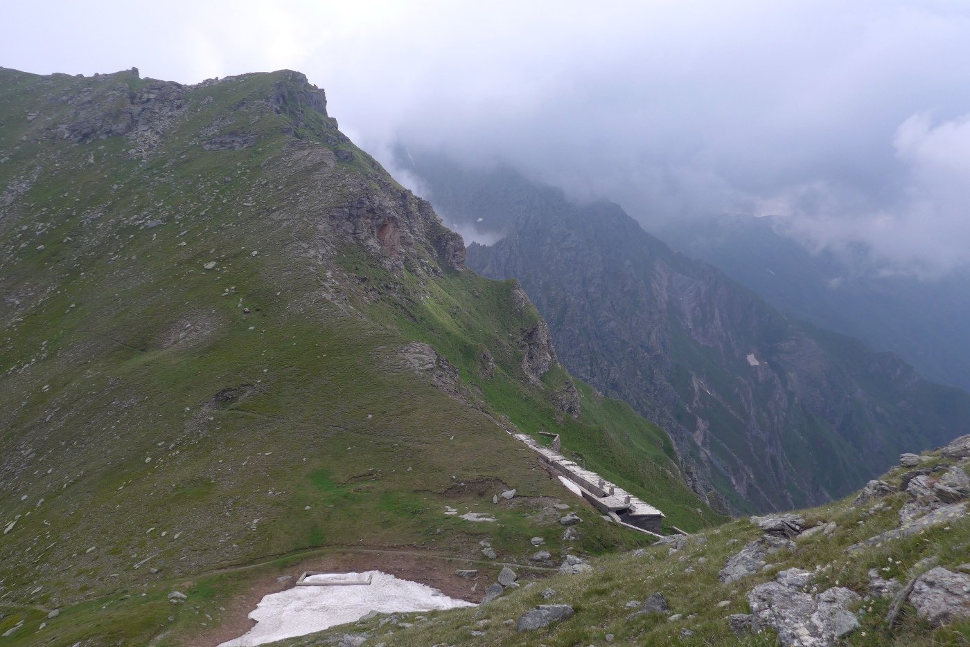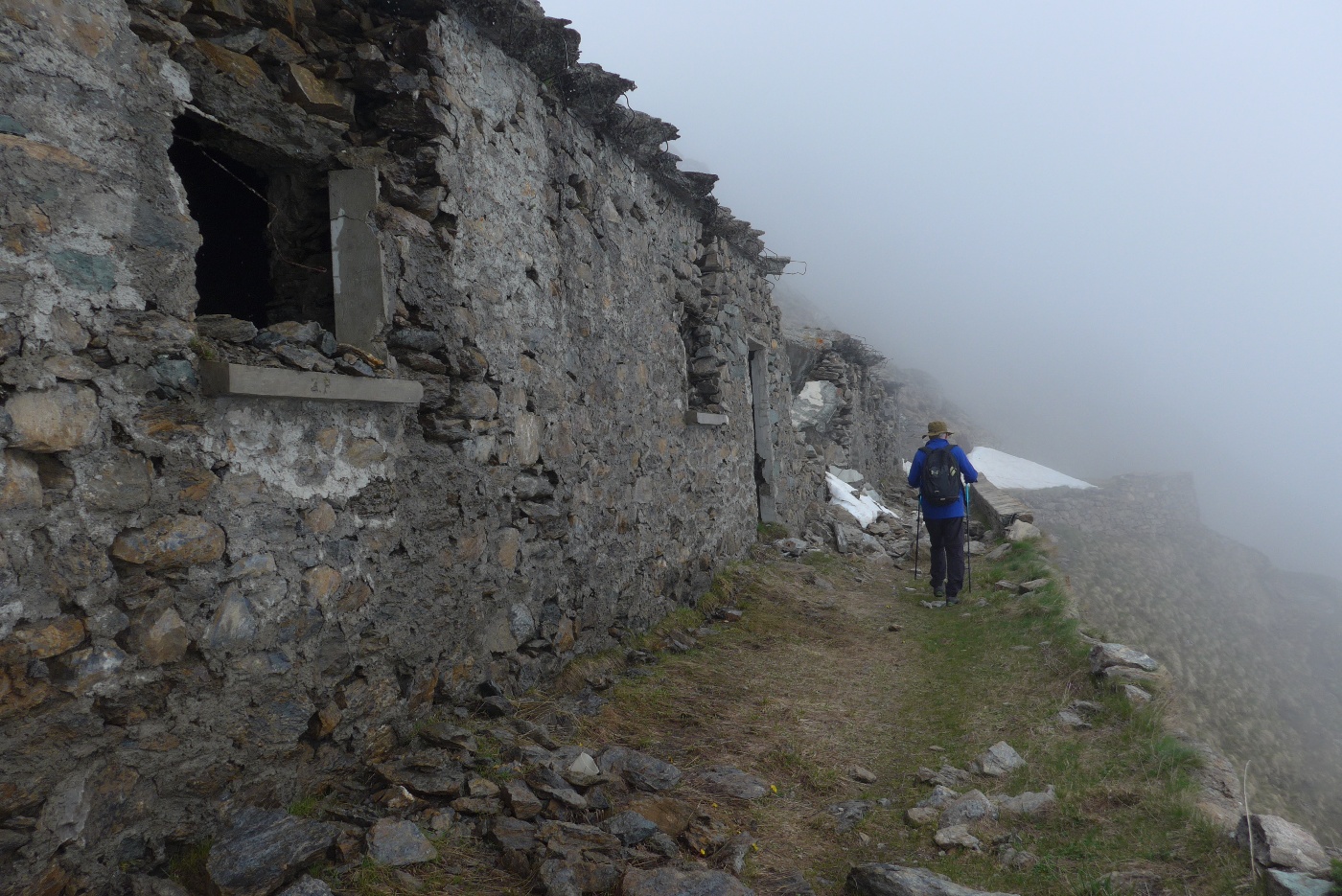 Si prosegue lungo il sentiero in discesa fino ad un rudere militare, dove si abbandona il gta che prosegue verso il Rocciamelone, e si compie una inversione a U iniziando a seguire il sentiero balcone, segnalato con tacche bianco rosse. Si scende nella conca prativa sottostante, per poi mantenersi sulla sinistra ancora per un tratto in discesa. Qui il sentiero è poco marcato ma in corrispondenza di una fascia di pietraia scura, bisogna iniziare a risalire leggermente, per aggirare dall’alto i canaloni che precipitano ripidi sul fondovalle. Si risalgono circa 50 m di dislivello, passando su esili cenge erbose un po’ scoscese (non piacevoli con neve o terreno scivoloso) traversando lungamente, finchè si riprende a scendere dove il terreno torna più agevole. Bisogna fare attenzione a non smarrire il sentiero, in ogni caso si può scendere anche a vista puntando alla sella erbosa degli alpeggi Balmafol.
