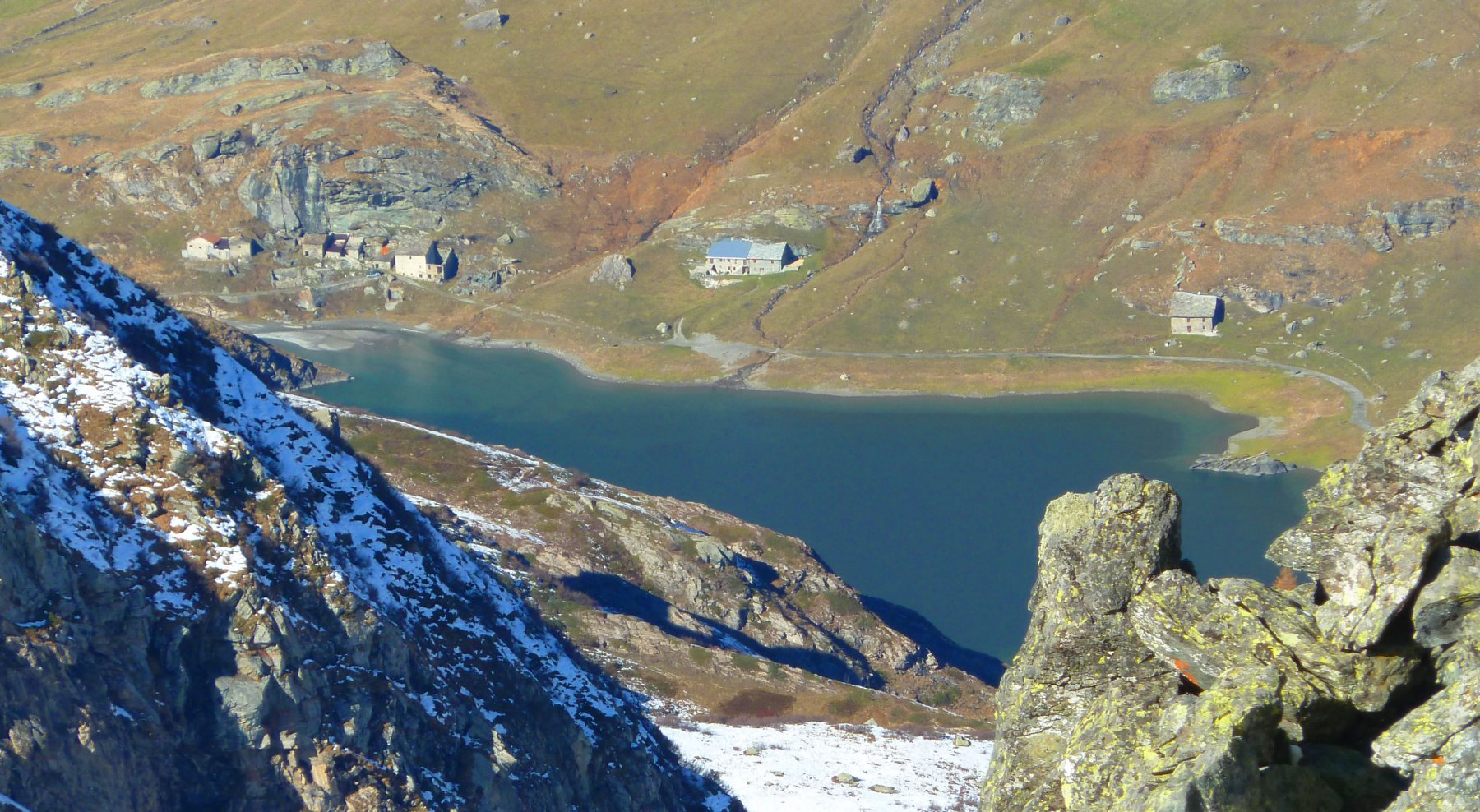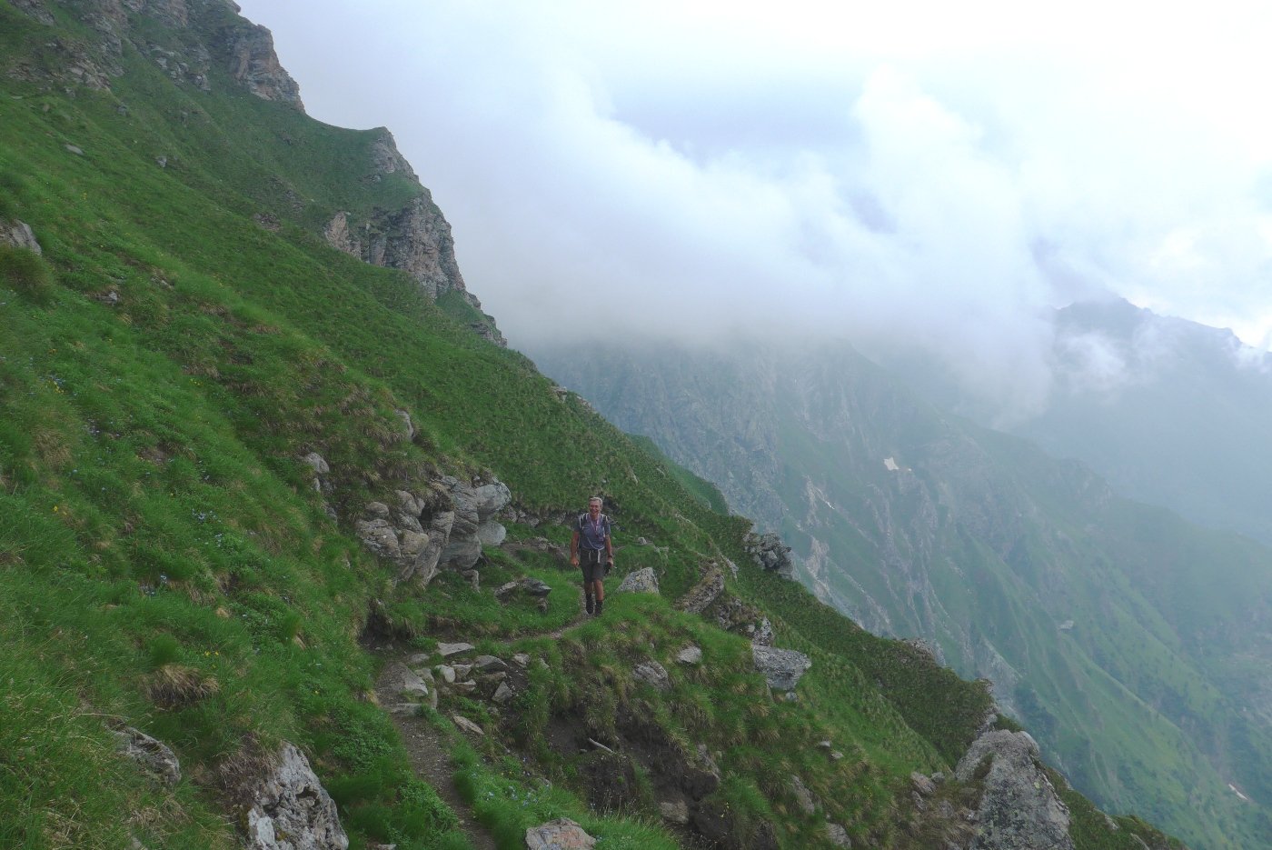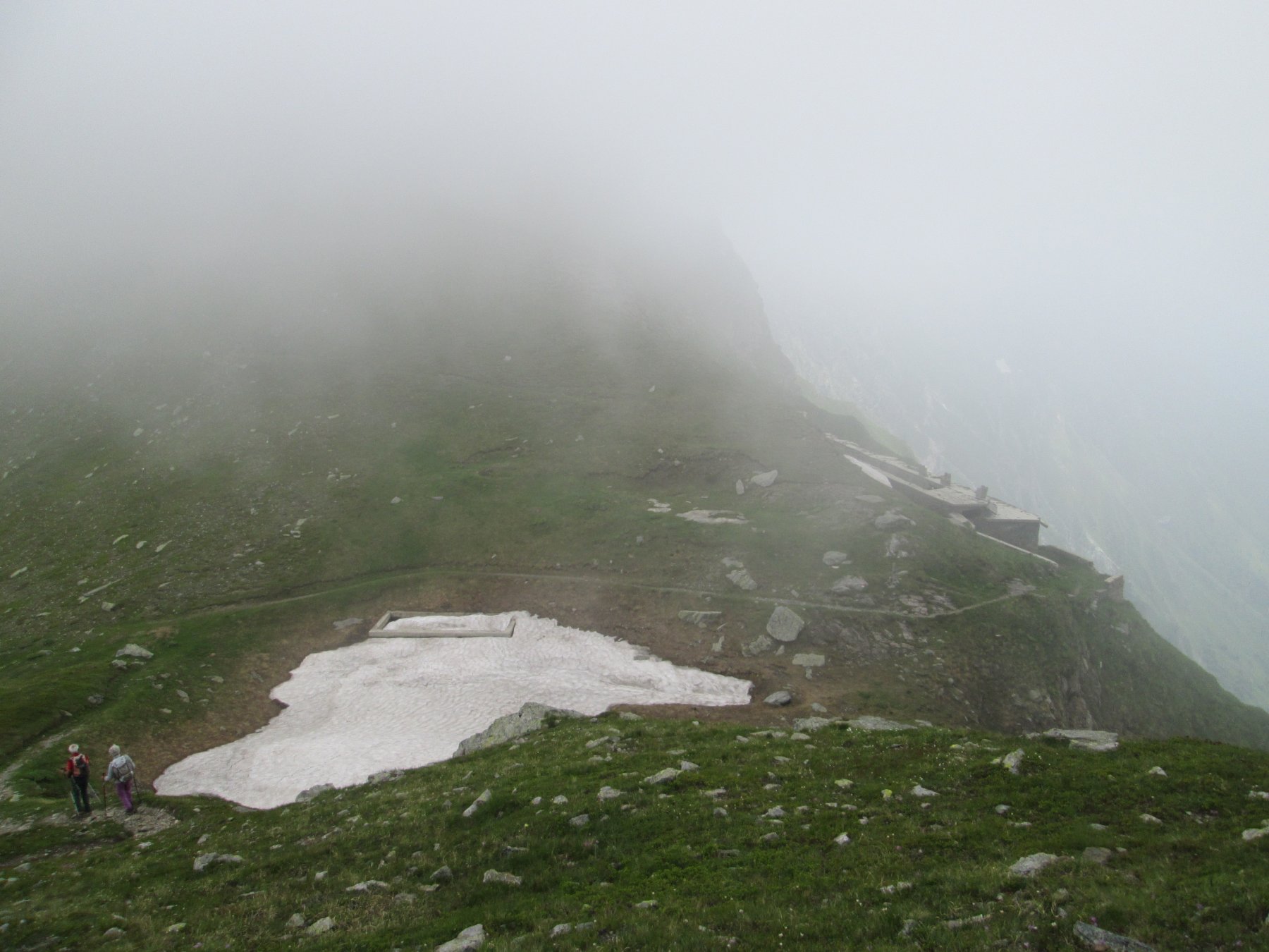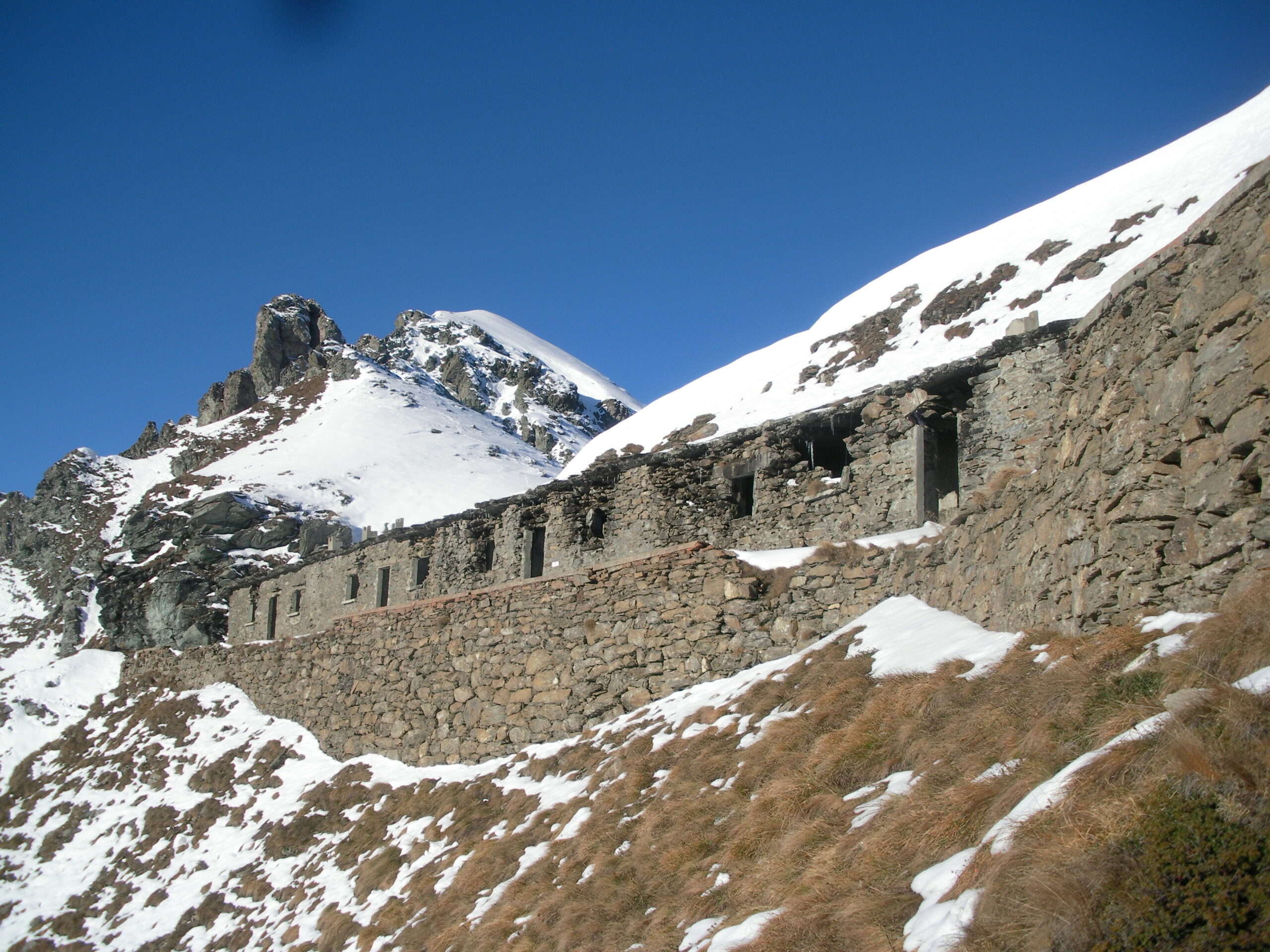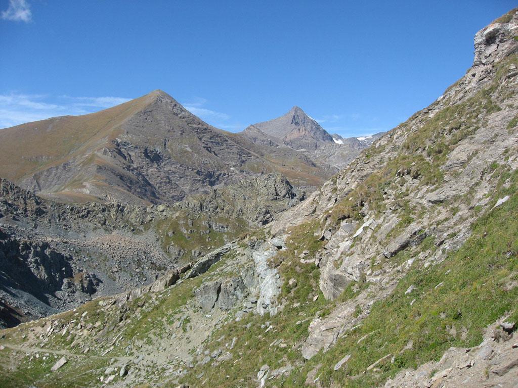 Si prosegue lungo il sentiero in discesa fino ad un rudere militare, dove si abbandona il gta che prosegue verso il Rocciamelone, e si compie una inversione a U iniziando a seguire il sentiero balcone, segnalato con tacche bianco rosse. Si scende nella conca prativa sottostante, per poi mantenersi sulla sinistra ancora per un tratto in discesa. Qui il sentiero è poco marcato ma in corrispondenza di una fascia di pietraia scura, bisogna iniziare a risalire leggermente, per aggirare dall’alto i canaloni che precipitano ripidi sul fondovalle. Si risalgono circa 50 m di dislivello, passando su esili cenge erbose un po’ scoscese (non piacevoli con neve o terreno scivoloso) traversando lungamente, finchè si riprende a scendere dove il terreno torna più agevole. Bisogna fare attenzione a non smarrire il sentiero, in ogni caso si può scendere anche a vista puntando alla sella erbosa degli alpeggi Balmafol.