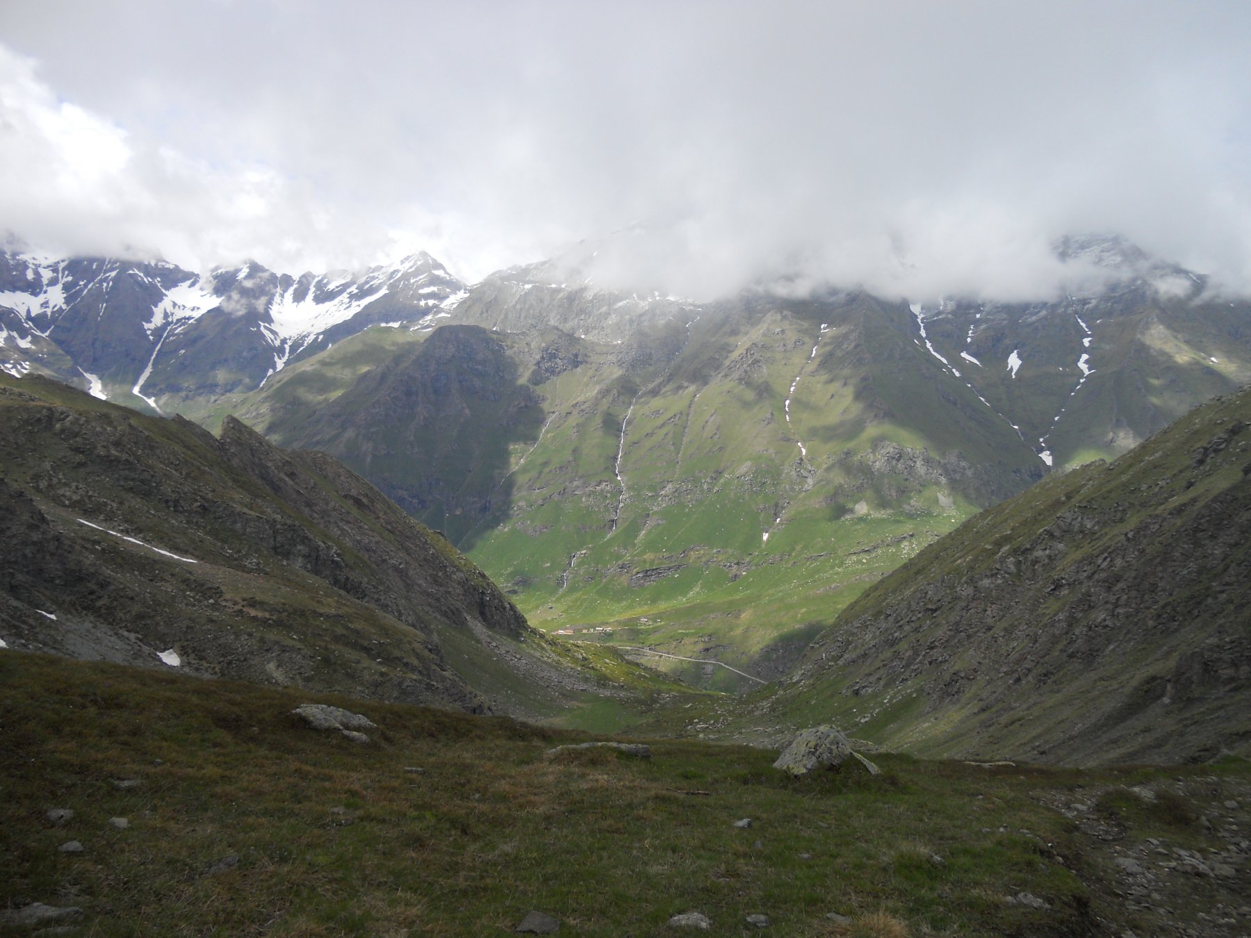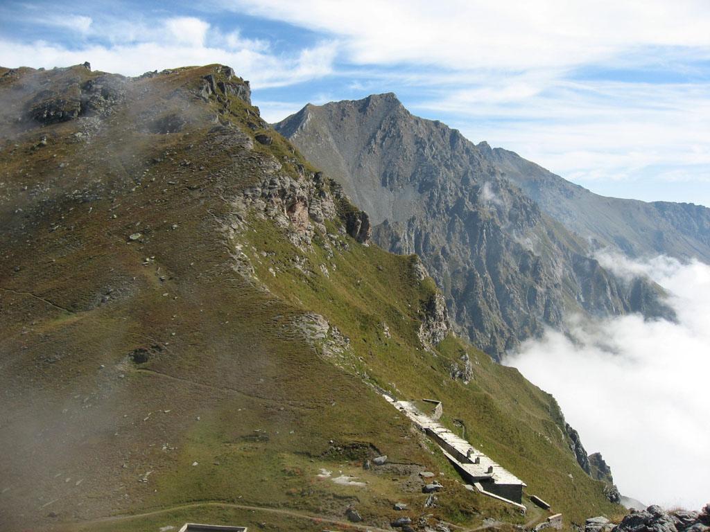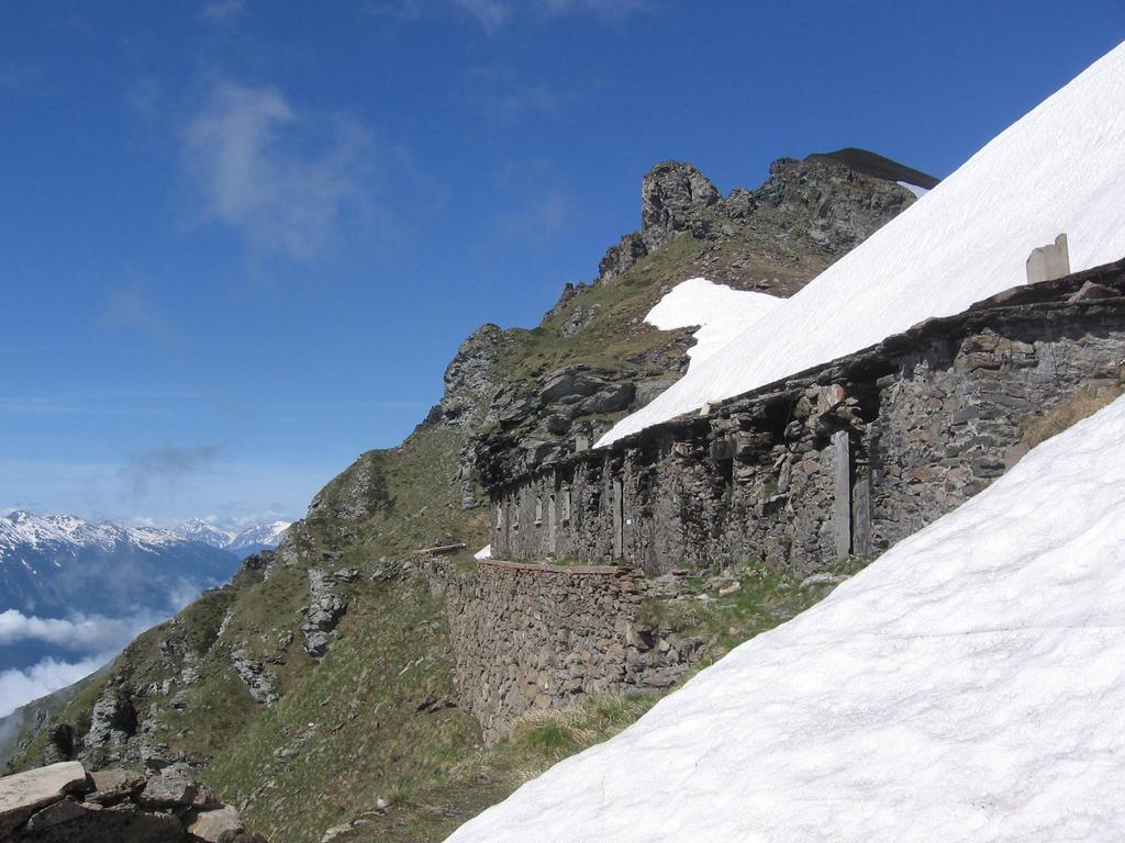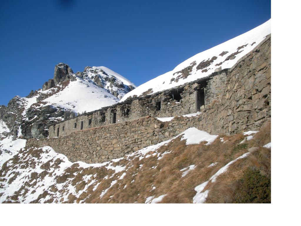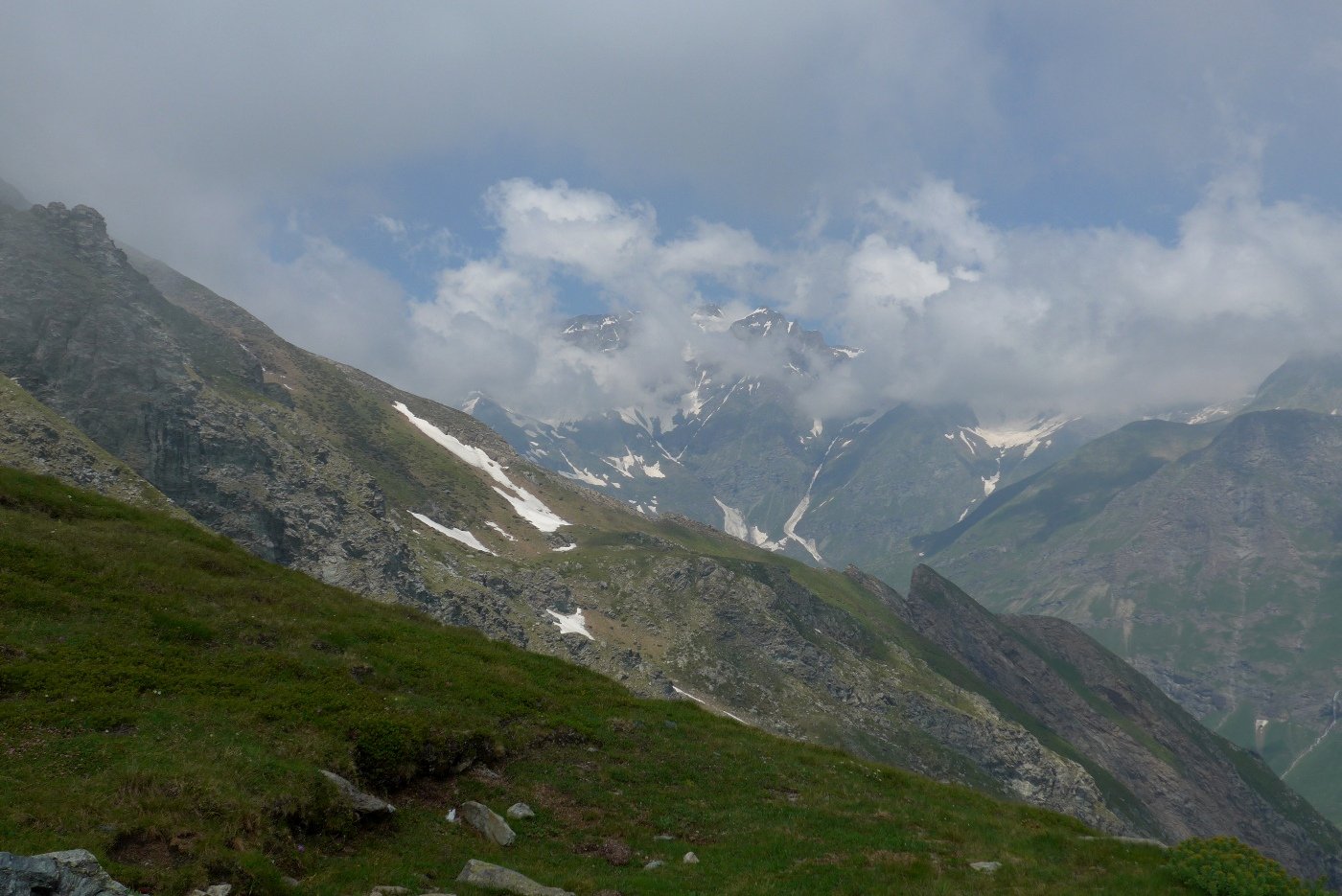Si prosegue lungo il sentiero in discesa fino ad un rudere militare, dove si abbandona il gta che prosegue verso il Rocciamelone, e si compie una inversione a U iniziando a seguire il sentiero balcone, segnalato con tacche bianco rosse. Si scende nella conca prativa sottostante, per poi mantenersi sulla sinistra ancora per un tratto in discesa. Qui il sentiero è poco marcato ma in corrispondenza di una fascia di pietraia scura, bisogna iniziare a risalire leggermente, per aggirare dall’alto i canaloni che precipitano ripidi sul fondovalle. Si risalgono circa 50 m di dislivello, passando su esili cenge erbose un po’ scoscese (non piacevoli con neve o terreno scivoloso) traversando lungamente, finchè si riprende a scendere dove il terreno torna più agevole. Bisogna fare attenzione a non smarrire il sentiero, in ogni caso si può scendere anche a vista puntando alla sella erbosa degli alpeggi Balmafol.