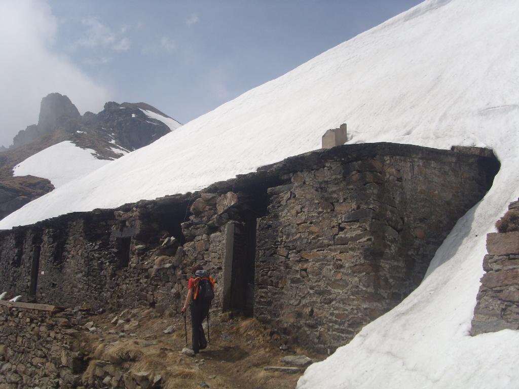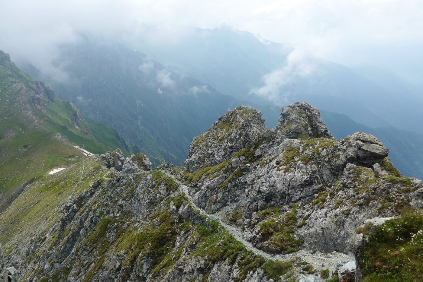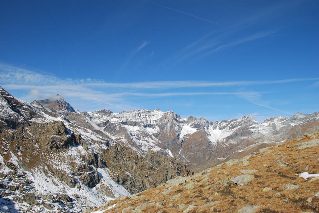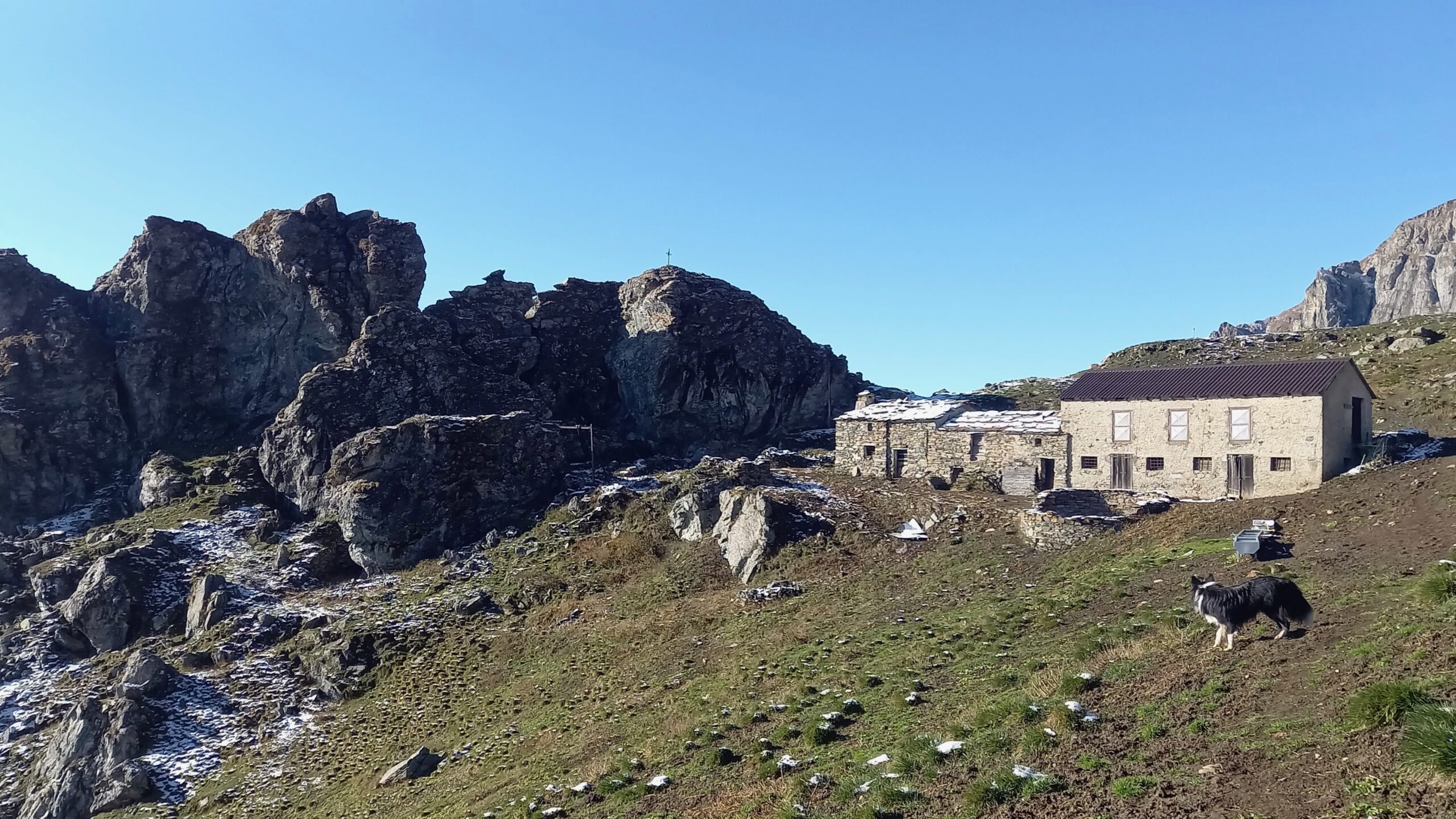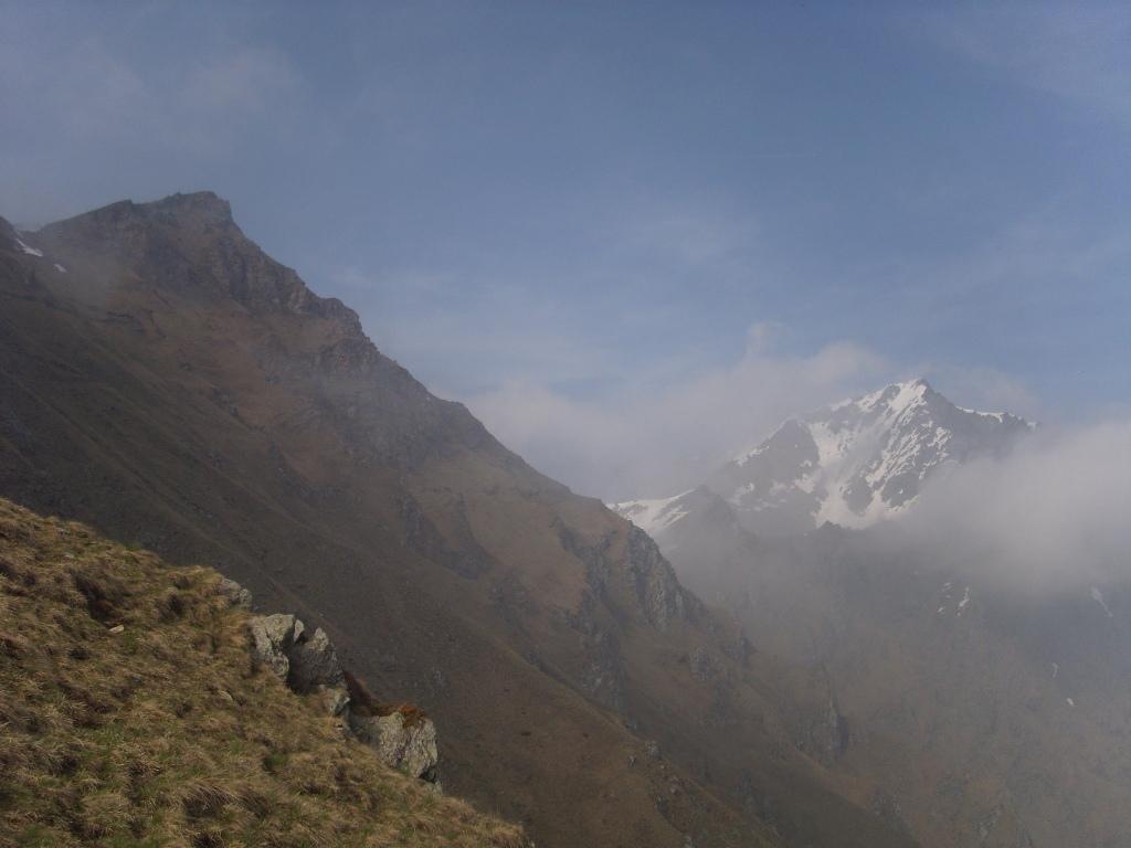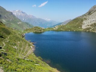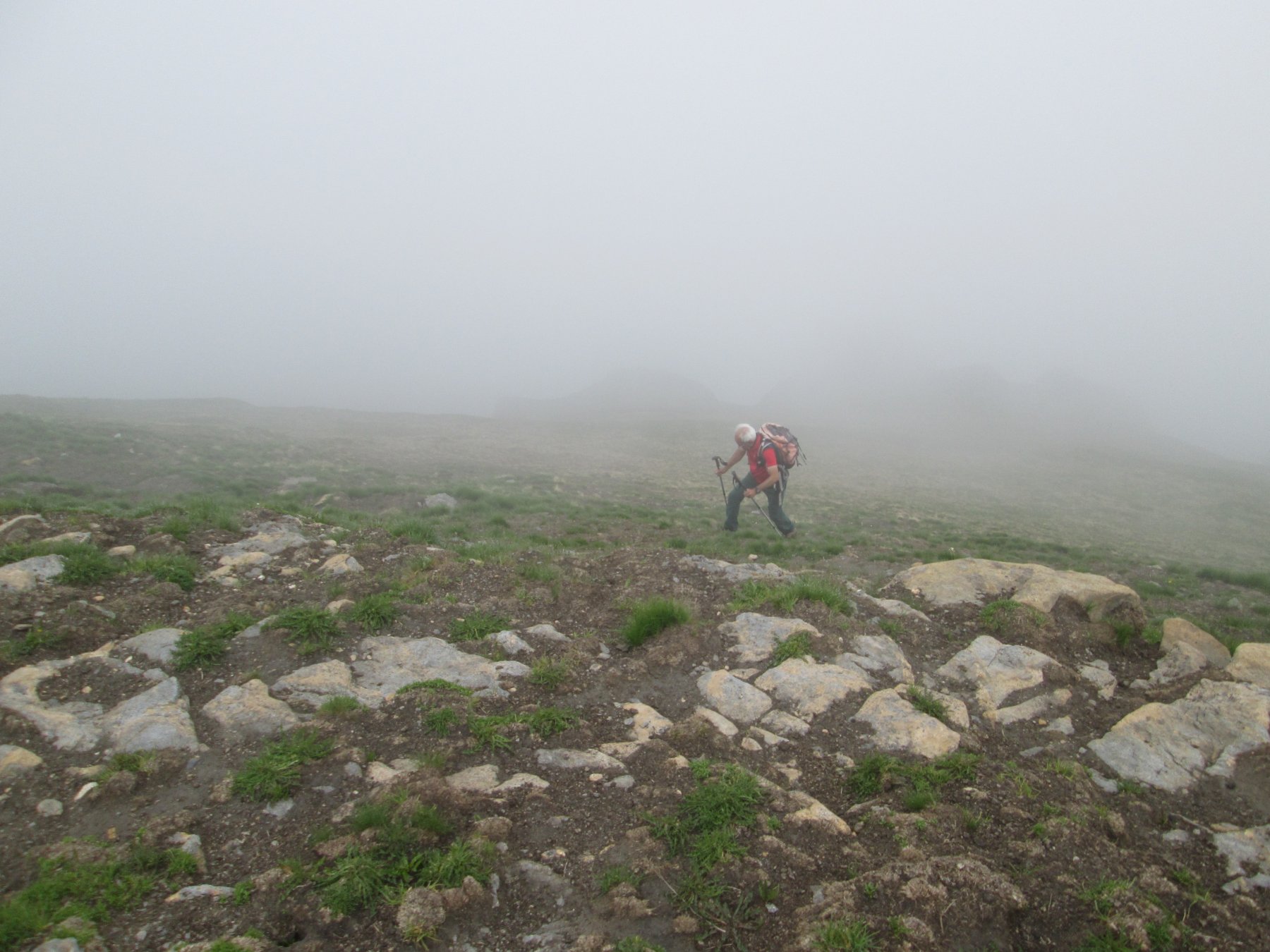 Si prosegue lungo il sentiero in discesa fino ad un rudere militare, dove si abbandona il gta che prosegue verso il Rocciamelone, e si compie una inversione a U iniziando a seguire il sentiero balcone, segnalato con tacche bianco rosse. Si scende nella conca prativa sottostante, per poi mantenersi sulla sinistra ancora per un tratto in discesa. Qui il sentiero è poco marcato ma in corrispondenza di una fascia di pietraia scura, bisogna iniziare a risalire leggermente, per aggirare dall’alto i canaloni che precipitano ripidi sul fondovalle. Si risalgono circa 50 m di dislivello, passando su esili cenge erbose un po’ scoscese (non piacevoli con neve o terreno scivoloso) traversando lungamente, finchè si riprende a scendere dove il terreno torna più agevole. Bisogna fare attenzione a non smarrire il sentiero, in ogni caso si può scendere anche a vista puntando alla sella erbosa degli alpeggi Balmafol.