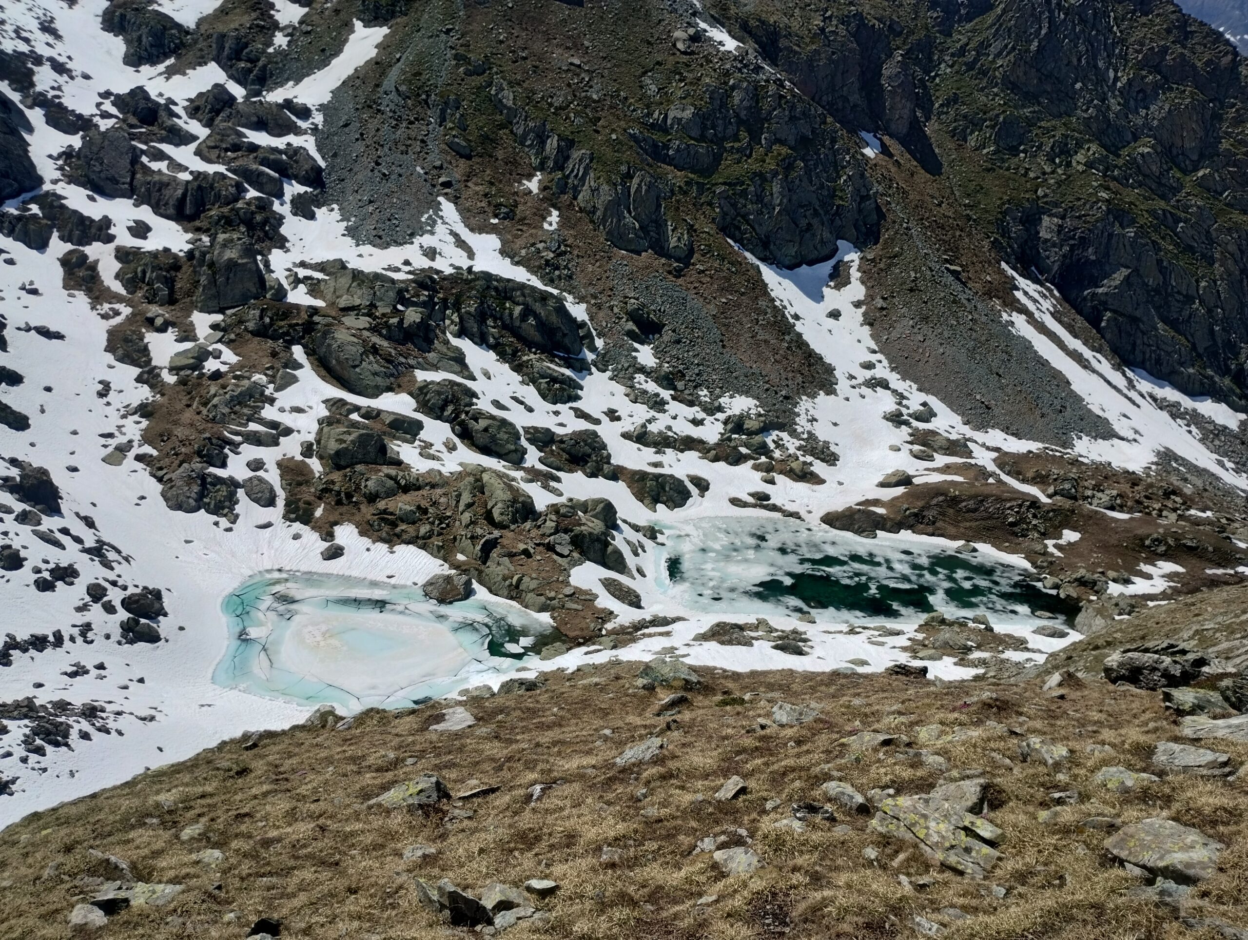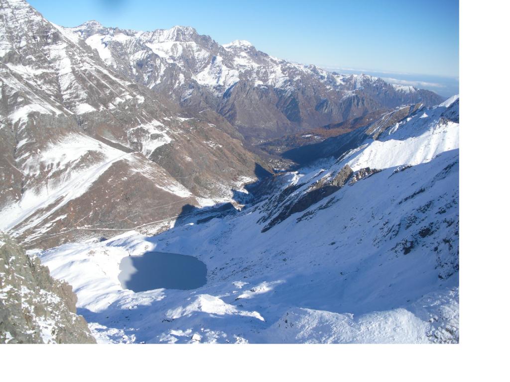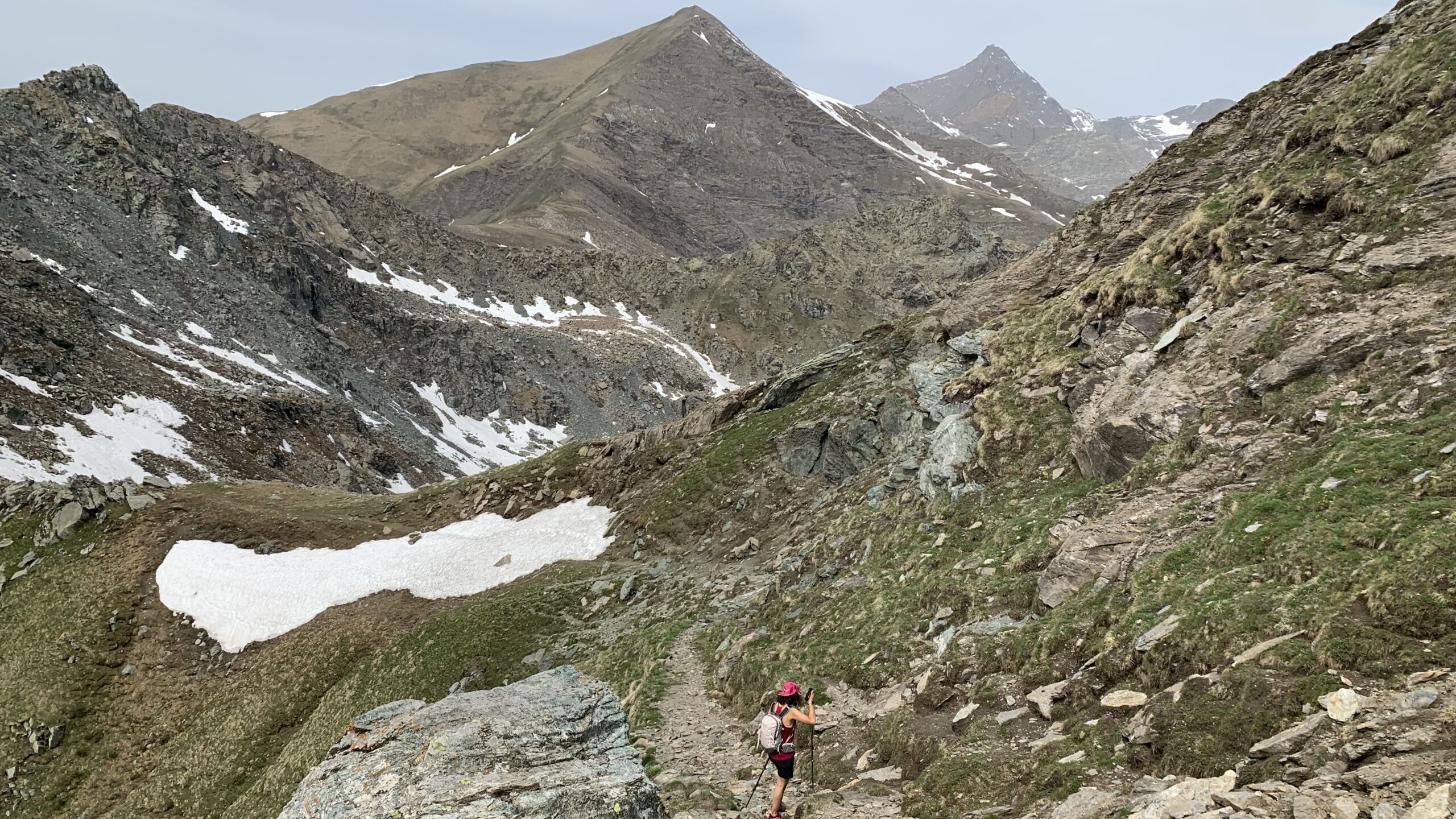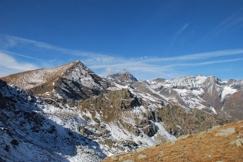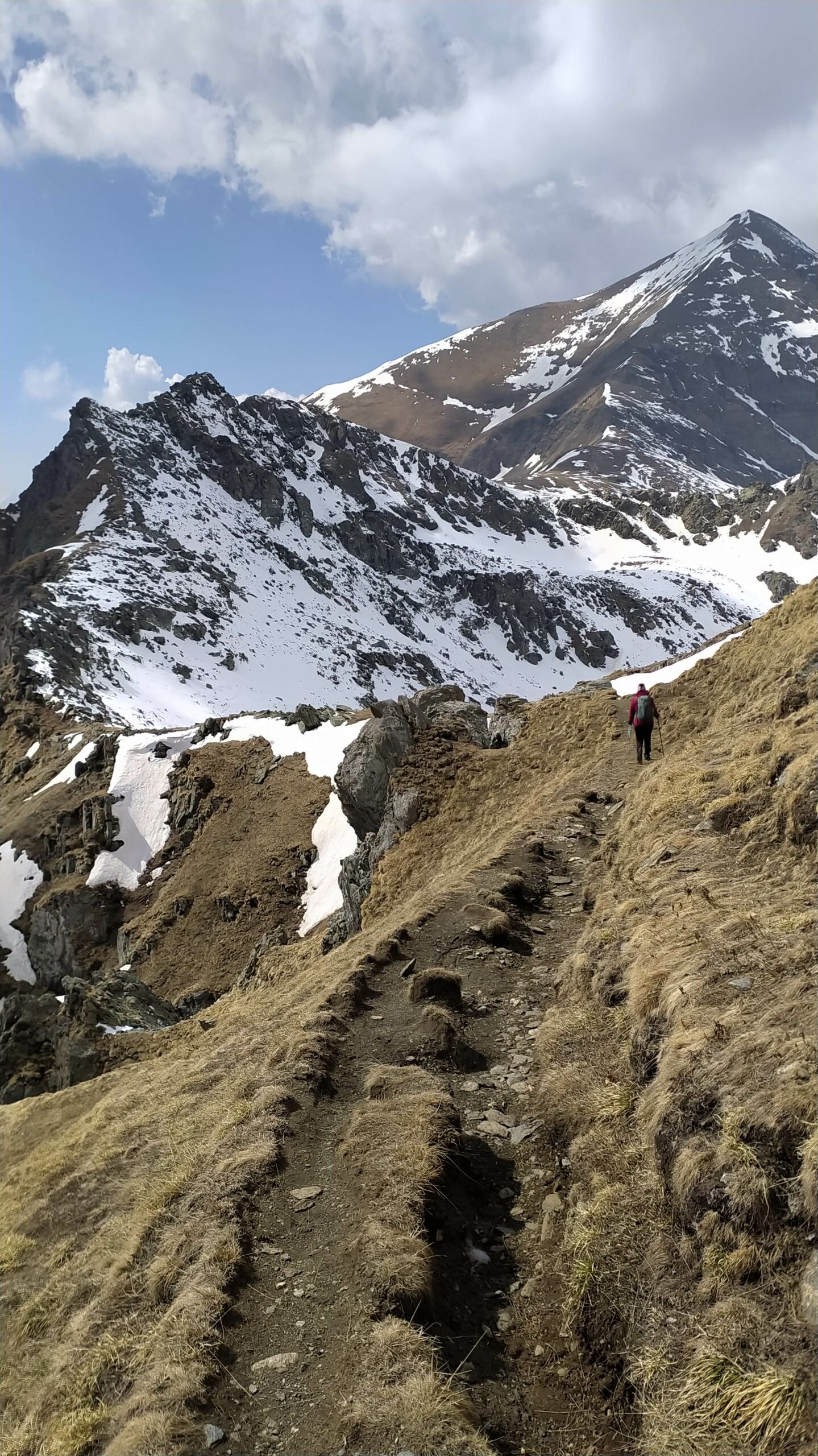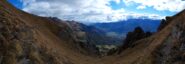 Si prosegue lungo il sentiero in discesa fino ad un rudere militare, dove si abbandona il gta che prosegue verso il Rocciamelone, e si compie una inversione a U iniziando a seguire il sentiero balcone, segnalato con tacche bianco rosse. Si scende nella conca prativa sottostante, per poi mantenersi sulla sinistra ancora per un tratto in discesa. Qui il sentiero è poco marcato ma in corrispondenza di una fascia di pietraia scura, bisogna iniziare a risalire leggermente, per aggirare dall’alto i canaloni che precipitano ripidi sul fondovalle. Si risalgono circa 50 m di dislivello, passando su esili cenge erbose un po’ scoscese (non piacevoli con neve o terreno scivoloso) traversando lungamente, finchè si riprende a scendere dove il terreno torna più agevole. Bisogna fare attenzione a non smarrire il sentiero, in ogni caso si può scendere anche a vista puntando alla sella erbosa degli alpeggi Balmafol.