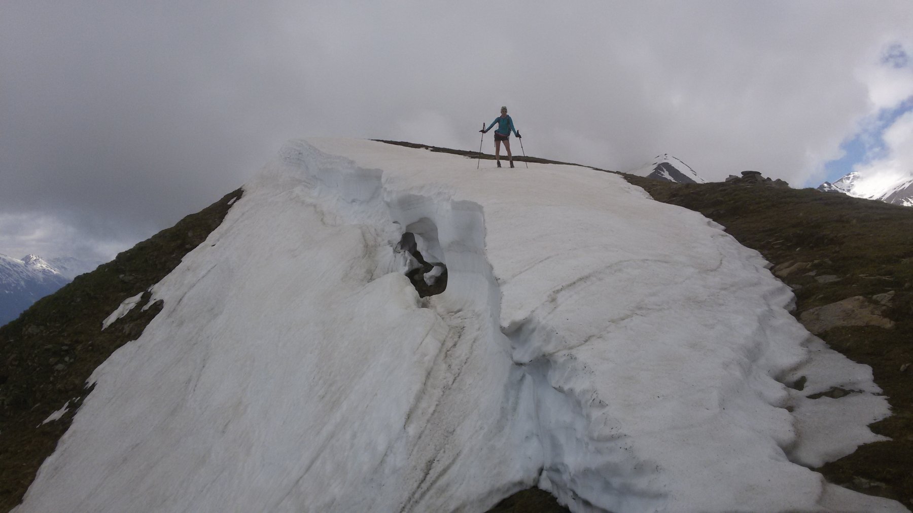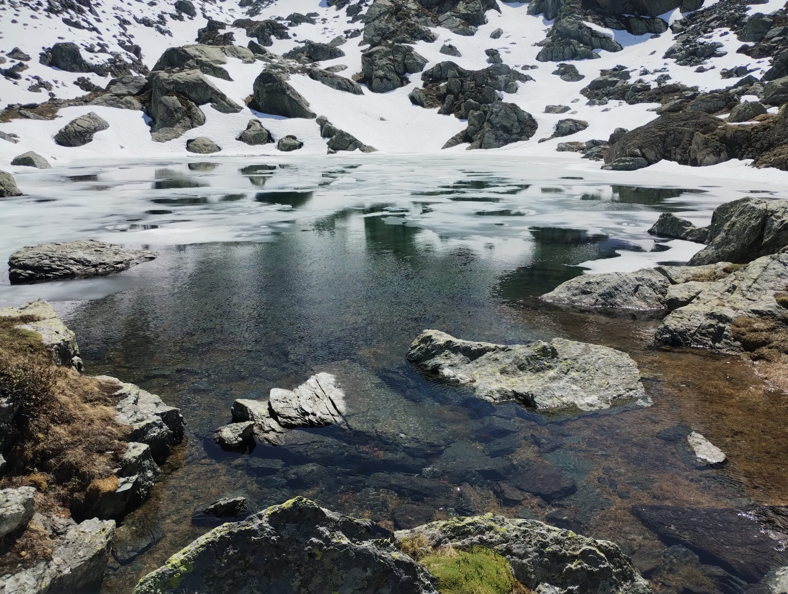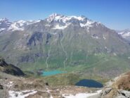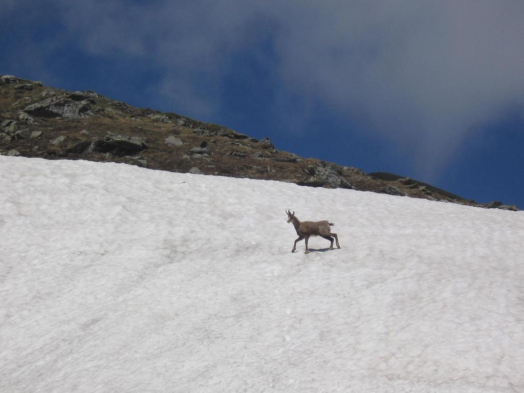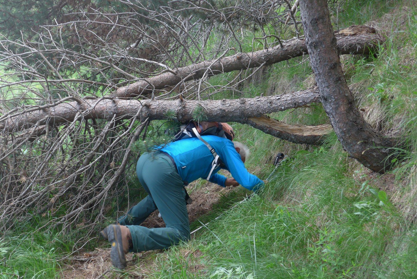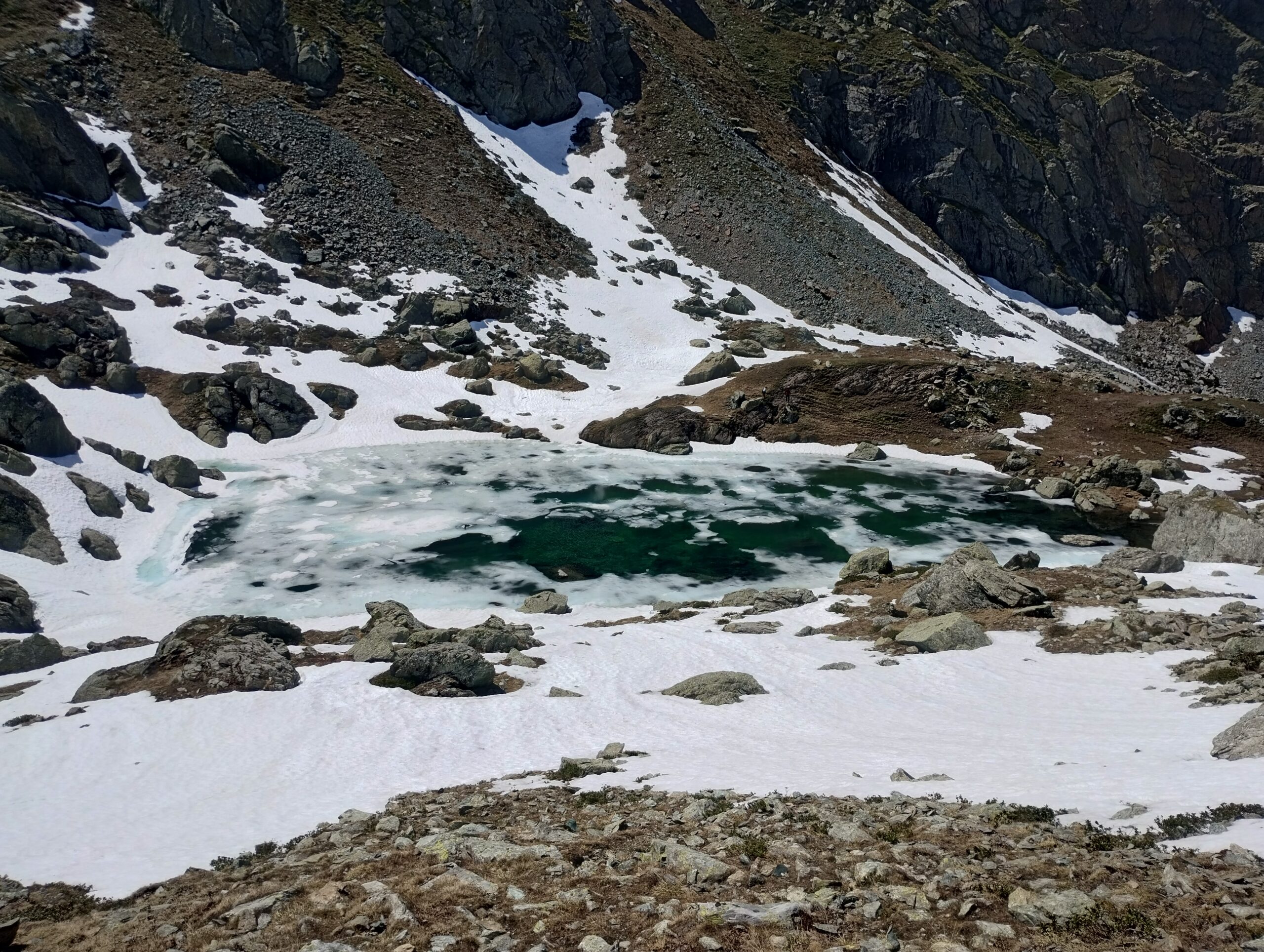 Si prosegue lungo il sentiero in discesa fino ad un rudere militare, dove si abbandona il gta che prosegue verso il Rocciamelone, e si compie una inversione a U iniziando a seguire il sentiero balcone, segnalato con tacche bianco rosse. Si scende nella conca prativa sottostante, per poi mantenersi sulla sinistra ancora per un tratto in discesa. Qui il sentiero è poco marcato ma in corrispondenza di una fascia di pietraia scura, bisogna iniziare a risalire leggermente, per aggirare dall’alto i canaloni che precipitano ripidi sul fondovalle. Si risalgono circa 50 m di dislivello, passando su esili cenge erbose un po’ scoscese (non piacevoli con neve o terreno scivoloso) traversando lungamente, finchè si riprende a scendere dove il terreno torna più agevole. Bisogna fare attenzione a non smarrire il sentiero, in ogni caso si può scendere anche a vista puntando alla sella erbosa degli alpeggi Balmafol.