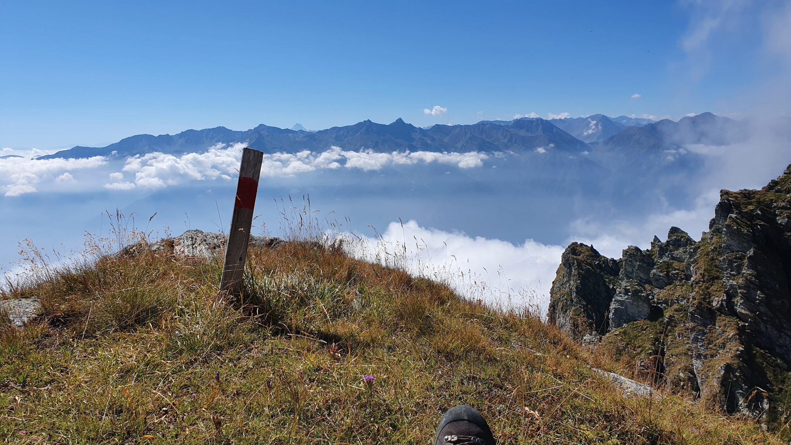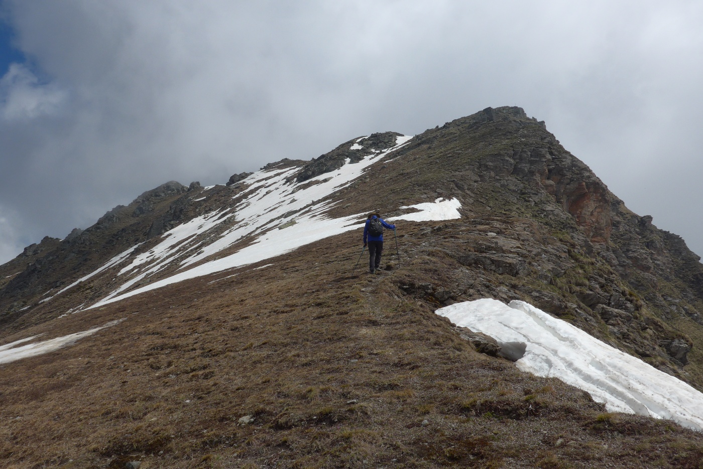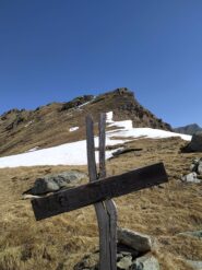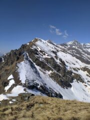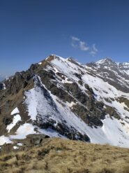 Dal colle si procede a sinistra, seguendo l’ampia ed evidente mulattiera che si inerpica prima sul pendio detritico, e poi quando il pendio diventa una cresta rocciosa, il sentiero traversa in basso sul versante nord (cautela con neve in quanto un passaggio di 20 m è un po’ esposto) risalendo un intaglio che porta nuovamente in cresta, scollinando sul versante della Val di Susa. Si continua senza alcuna difficoltà sul sentiero fino ad un promontorio erboso: qui si può decidere se proseguire integralmente sulla dorsale erbosa (percorso molto panoramico) che senza ostacoli conduce in cima, oppure continuando lungo il sentiero gta contornando dal basso il pendio erboso, e quindi una volta raggiunta la verticale della cima, si sale liberamente il breve pendio erboso, un po’ ripido, toccando la vetta 2620 m.