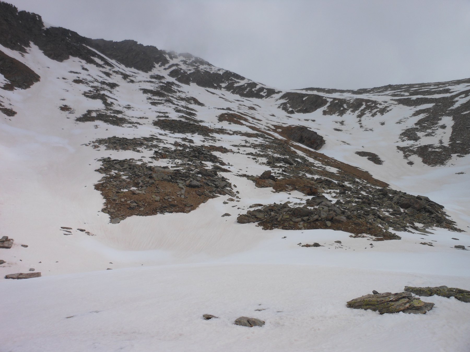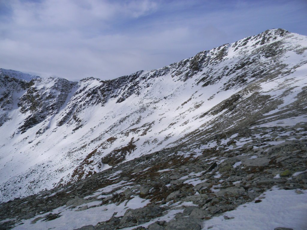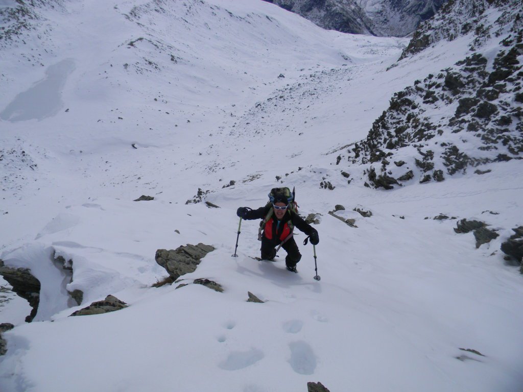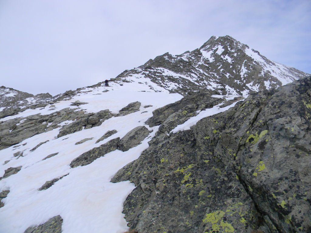 A differenza della via escursionistica che andrebbe a destra, si passa a sinistra del lago, in maniera libera anche perché non ci sono riferimenti, percorrendo i pendii non troppo ripidi, a sinistra della Cima. Per arrivare in cresta ci sono diversi canalini. Con neve uno è nettamente più evidente e parte proprio sulla verticale del lato, si può salire fino all’uscita (200 m 40° max 45°) o, più comodamente, seguirlo per un tratto quindi prendere un ramo di dx che porta comunque in cresta poco più a monte (piccozza e ramponi indispensabili).